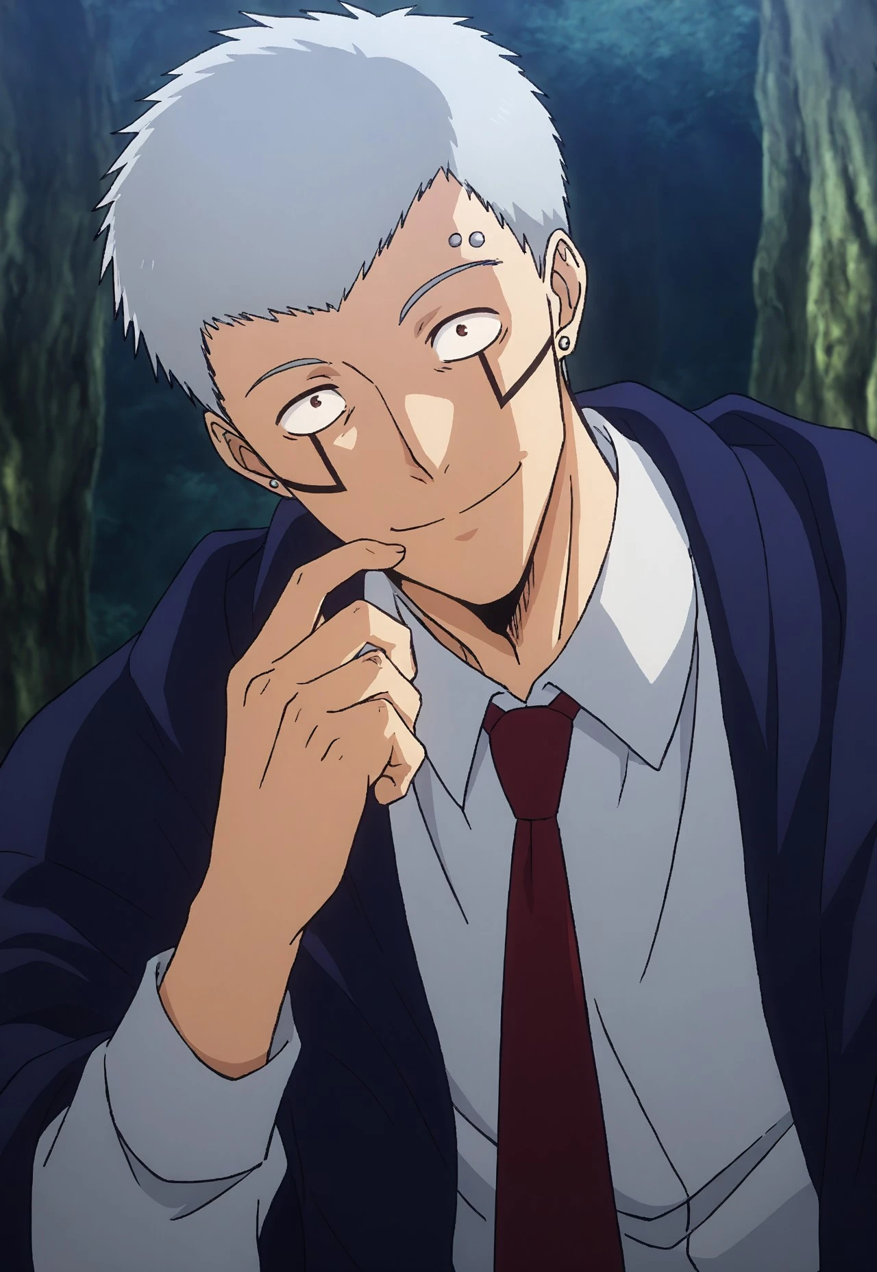 Suggested Character Tags: 1boy, solo, grey hair, brown eyes, facial tattoo, multiple piercings, blue robe, collared shirt, blue pants, necktie, shoes