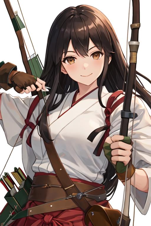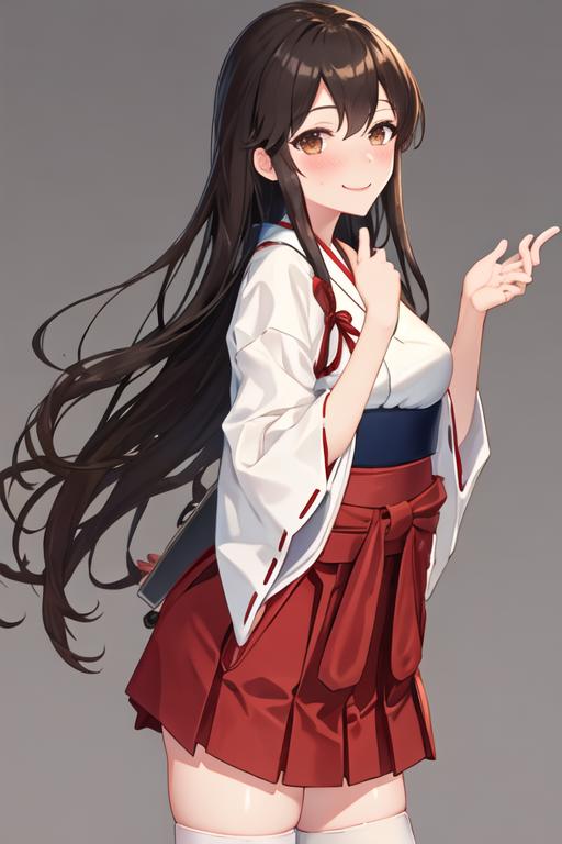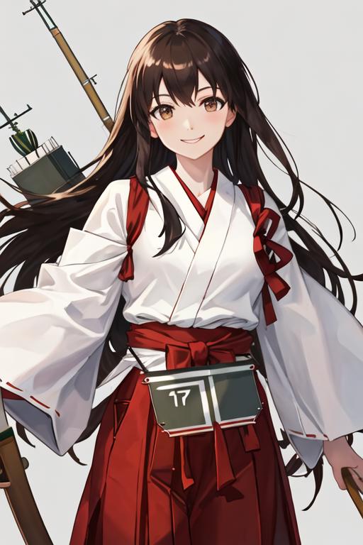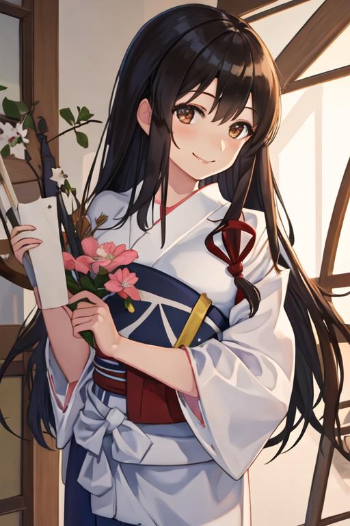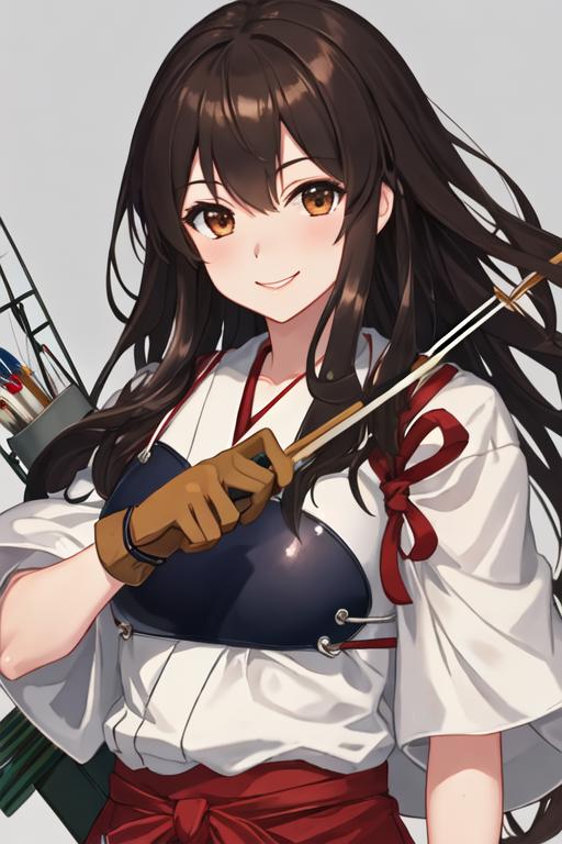 The trigger word is akagi_kantaicollection, and the recommended tags are best quality, masterpiece, highres, solo, {akagi_kantaicollection:1.15}, long_hair, brown_hair, brown_eyes, muneate, tasuki, smile.