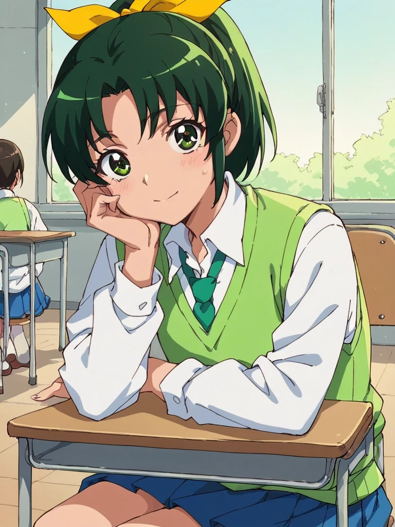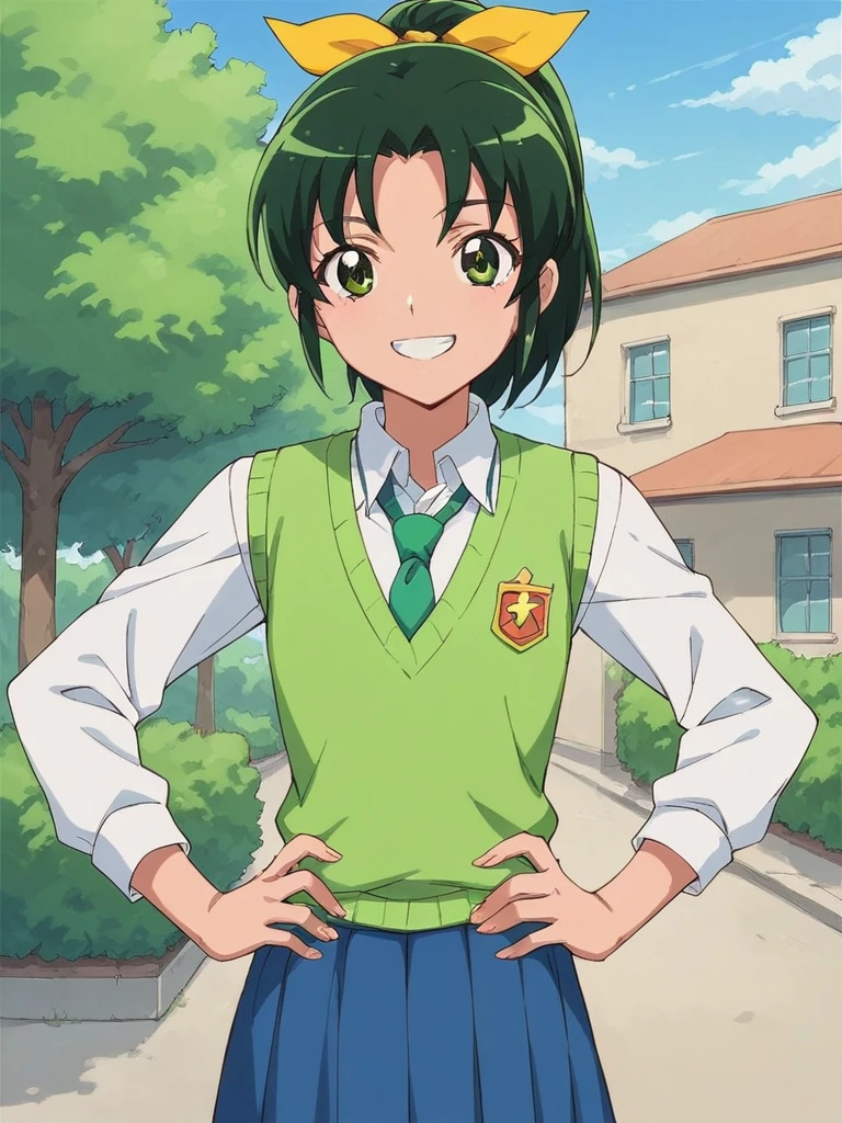 school uniform, green sweater vest, blue skirt, white shirt, long sleeves, green necktie