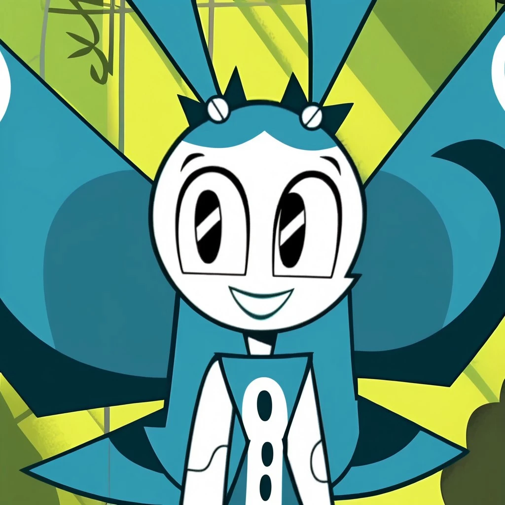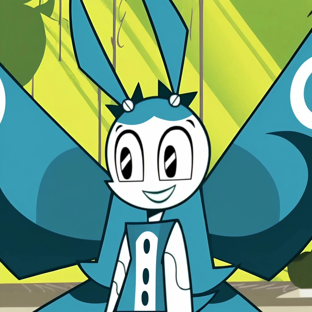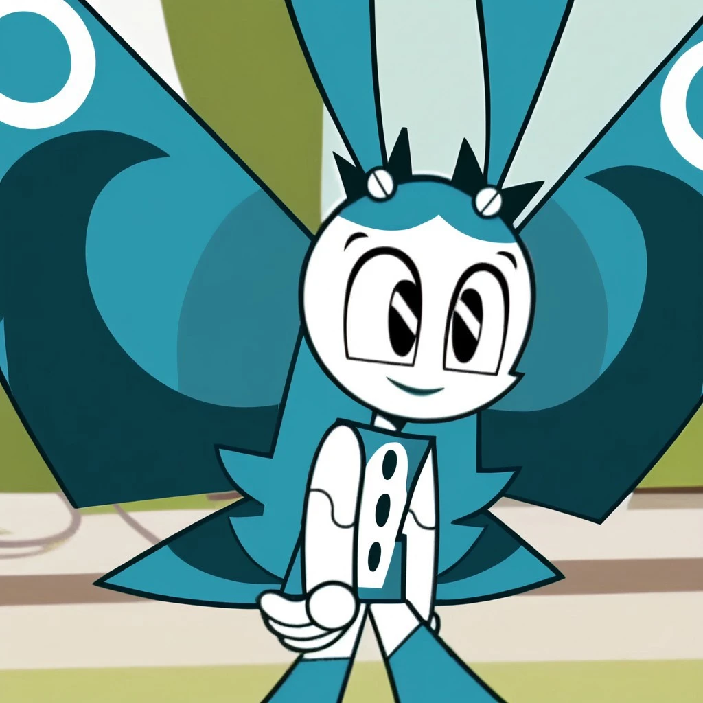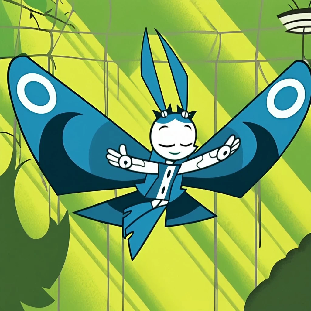 butterfly jenny, jenny wakeman, 1girl, solo, robot joints, black eyes, blue hair, white skin, blue button-up dress, blue high heel boots, blue butterfly wings, long hair, parted hair, twintails, hair down, hair bows