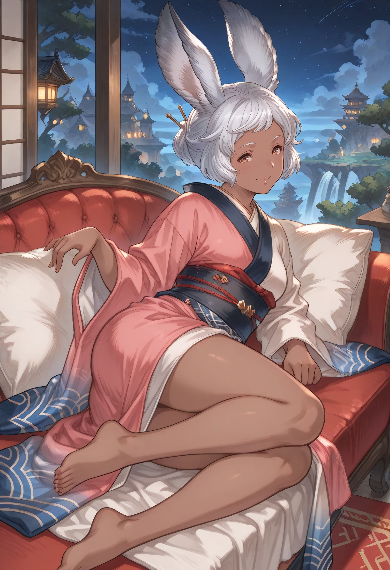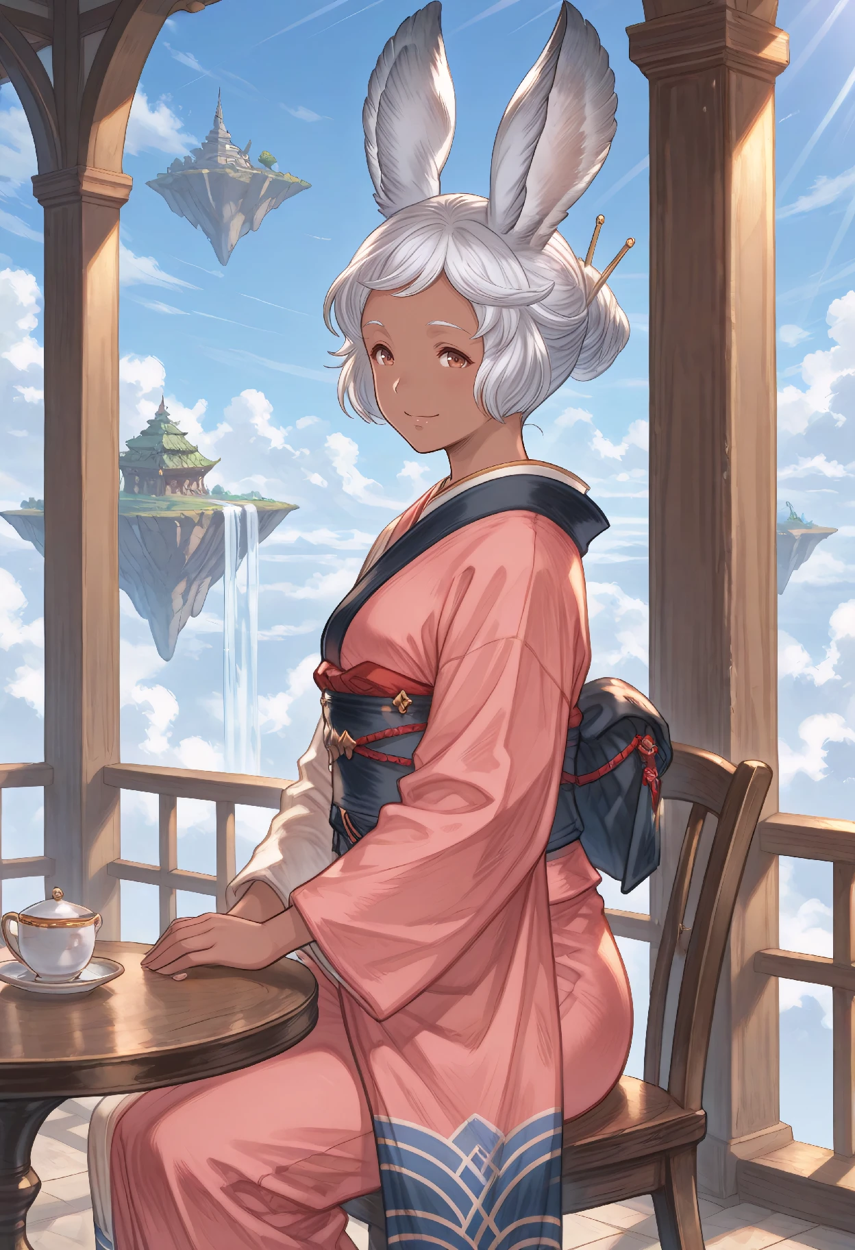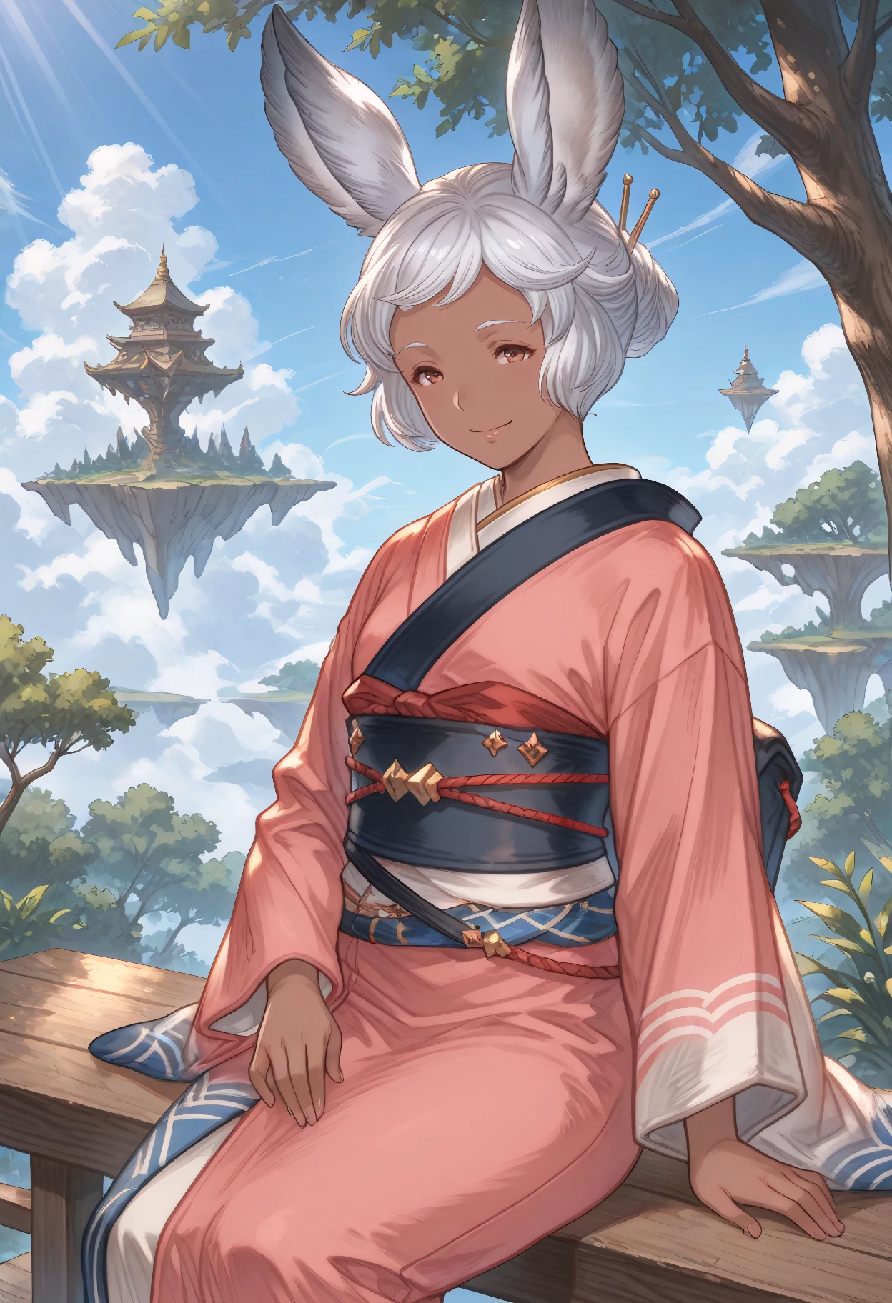 MayuraBase (Granblue Fantasy), erune, viera, dark skin, dark-skinned female, white hair, short hair, single hair bun, hair stick, hair ornament, brown eyes, animal ears, japanese clothes, kimono, multicolored kimono, long sleeves, wide sleeves, sash, obi, tabi, sandals,