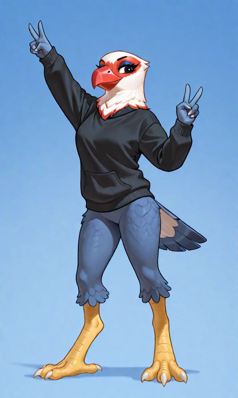 Amelia-AC, Eagle, red face, red beak with white tip, cyan eyelids, mascara, navy blue feathers with white tip, black eyes, white claws on the talons, yellow stripped bird feet, Tricolored feathered tail, Black pullover