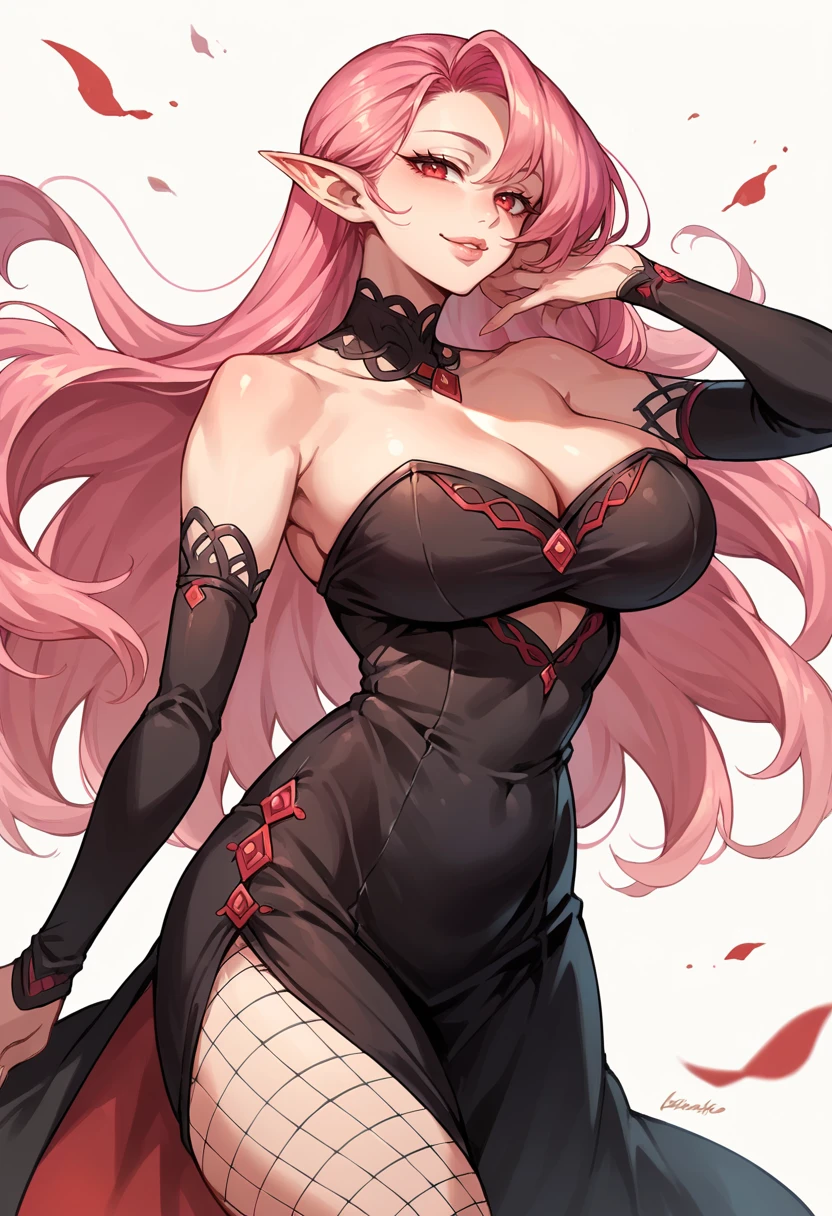 Eternal Night's Carola (Black Vampire dress): MLDYCorolla, bare shoulders, black dress, cleavage, detached sleeves, fishnets, long hair, pink hair, pointy ears, red eyes, strapless dress