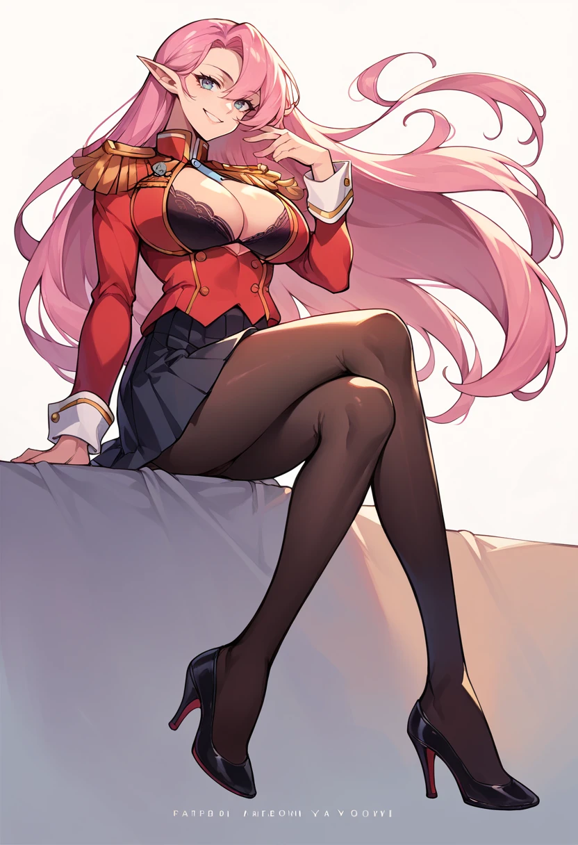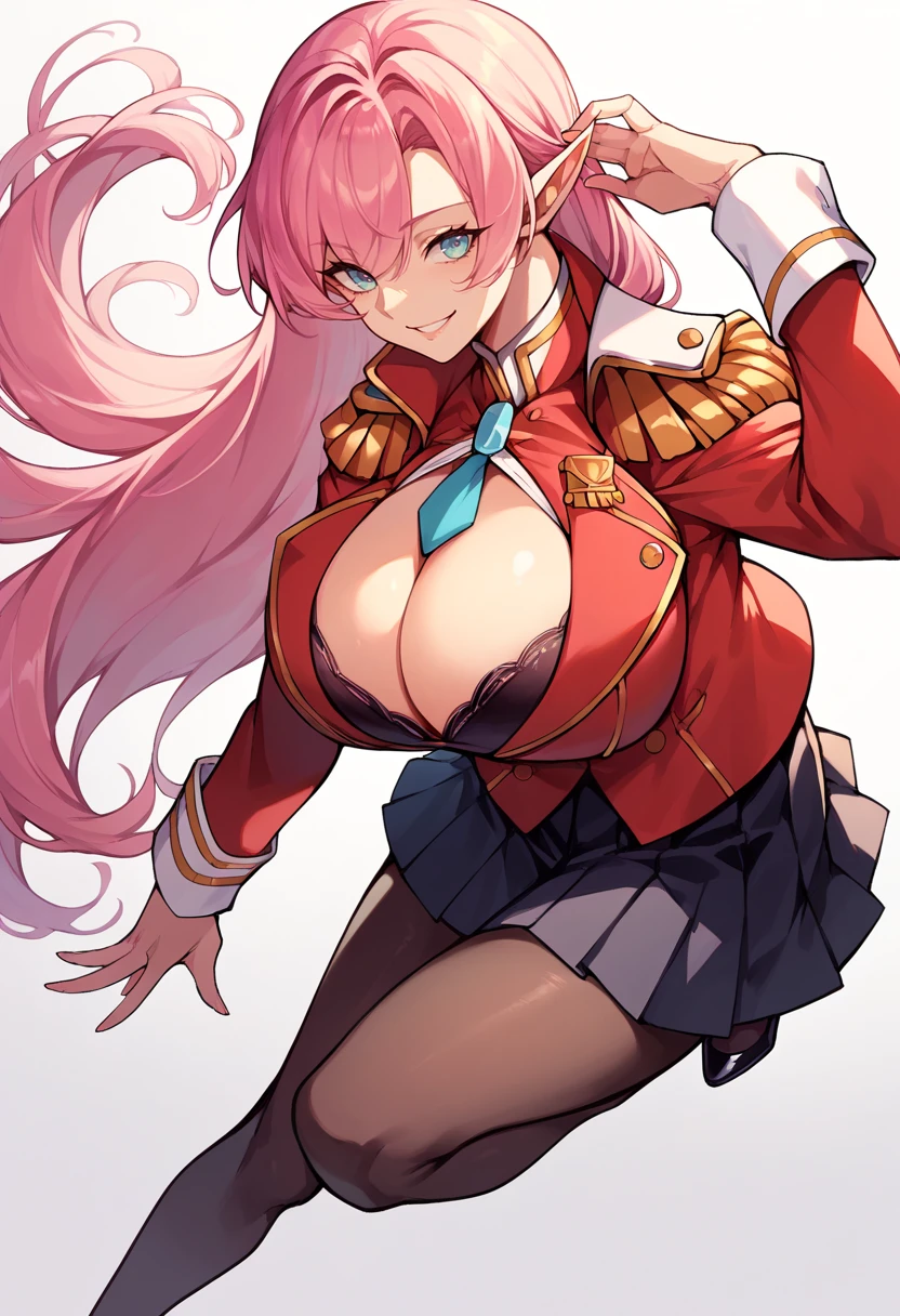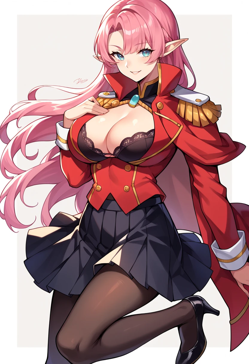 Base Skin: MLDYork, black bra, cleavage cutout, epaulettes, large breasts, long hair, long sleeves, pantyhose, pink hair, pleated skirt, pointy ears, uniform jacket, red jacket, high heels,