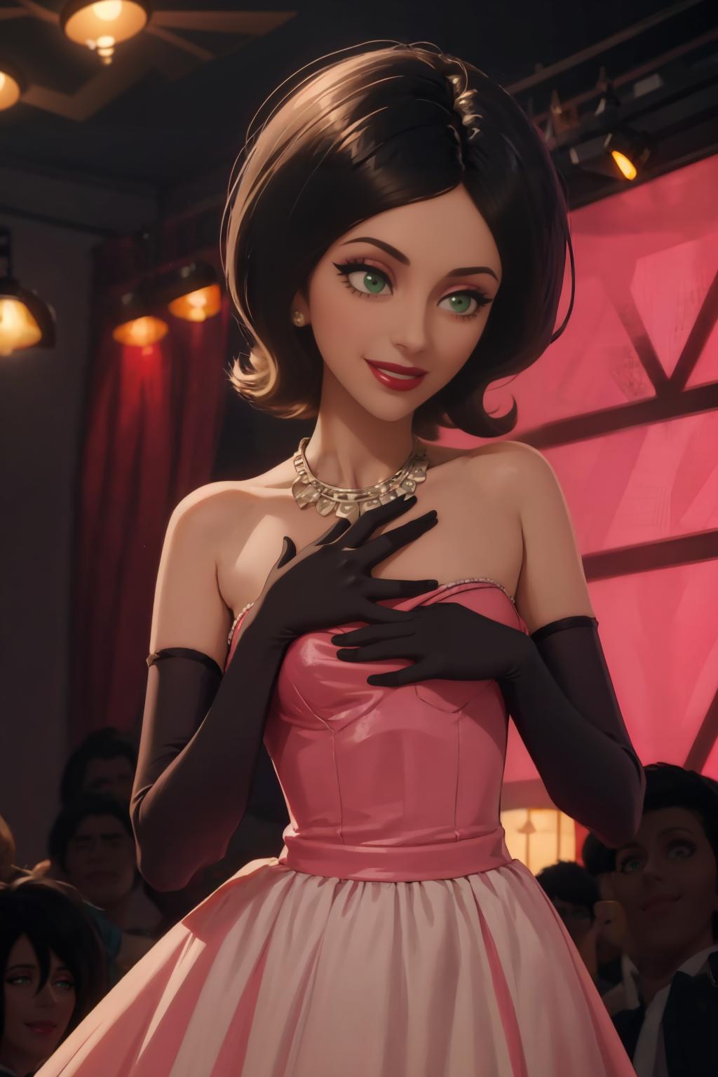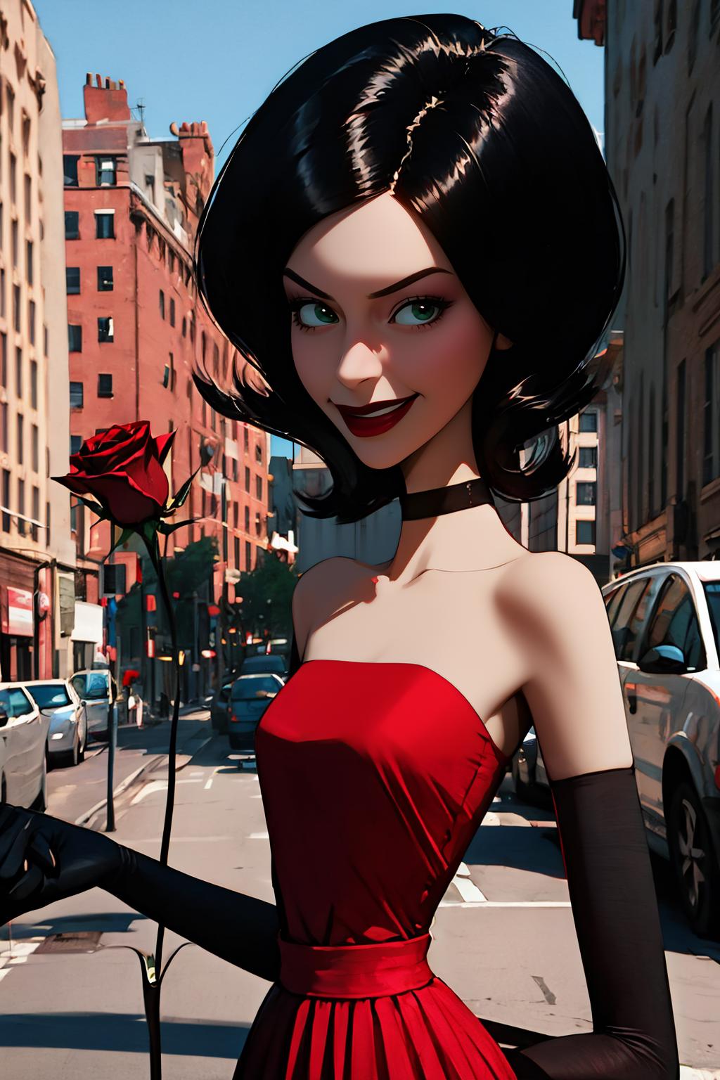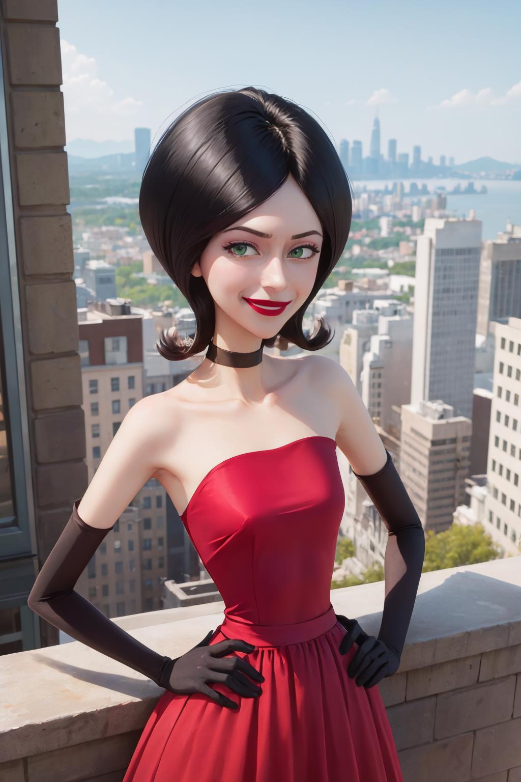 • Add "choker, red dress, red skirt, strapless, elbow gloves, lipstick" for her typical look.