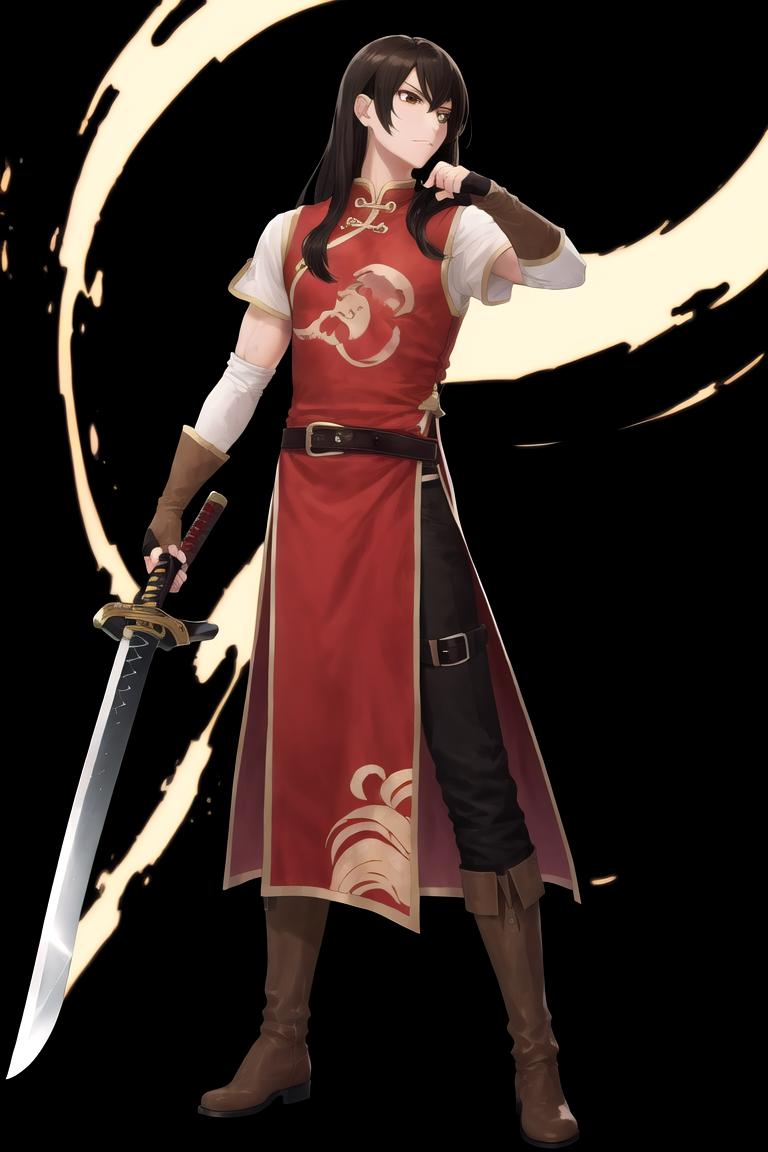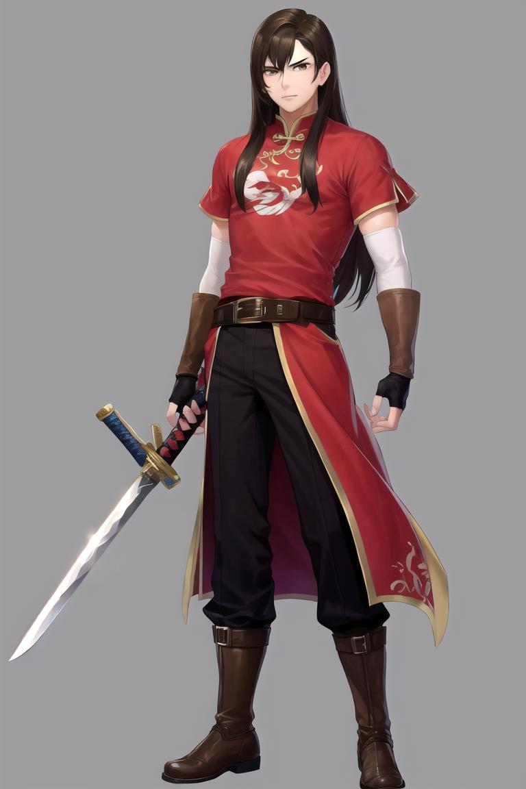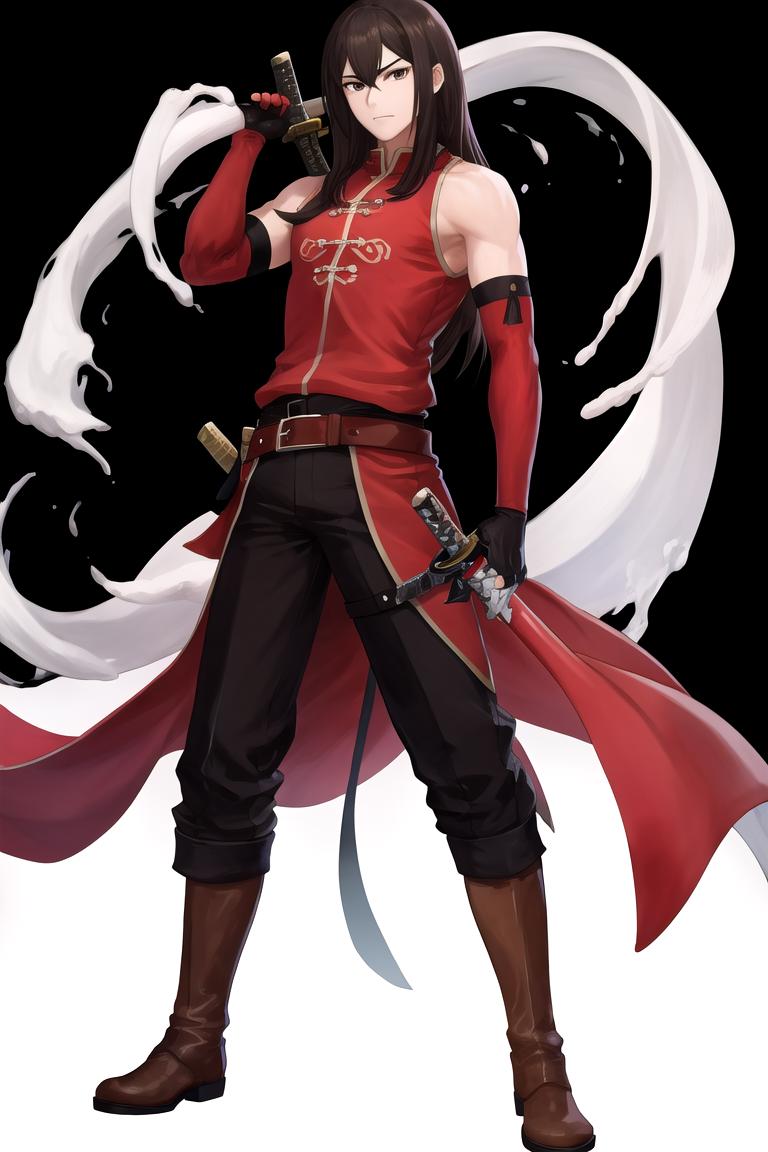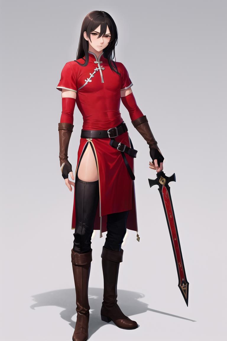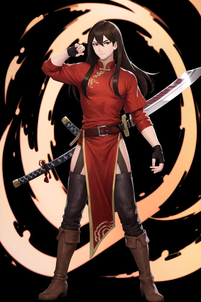 long hair, boots, belt, side slit, pants, black legwear, chinese clothes, red shirt, long sleeves, sheath, sword, katana, brown footwear, elbow gloves, fingerless gloves