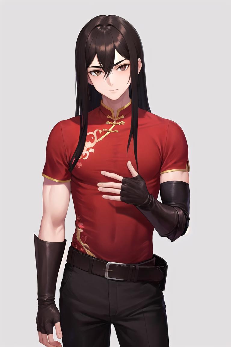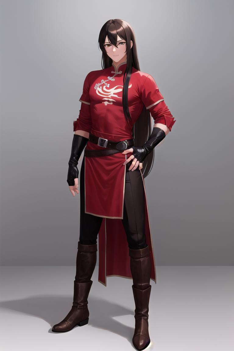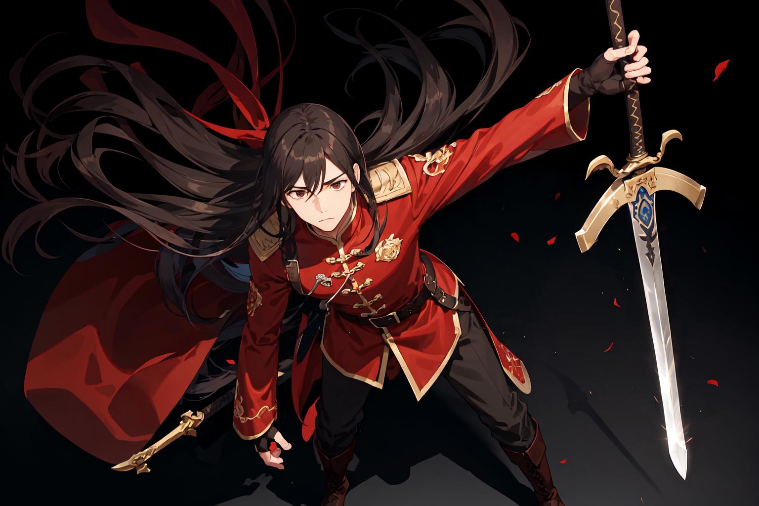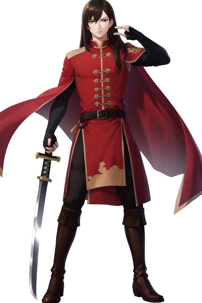 long hair, boots, belt, side slit, pants, black legwear, chinese clothes, red shirt, long sleeves, sheath, sword, katana, brown footwear, elbow gloves, fingerless gloves