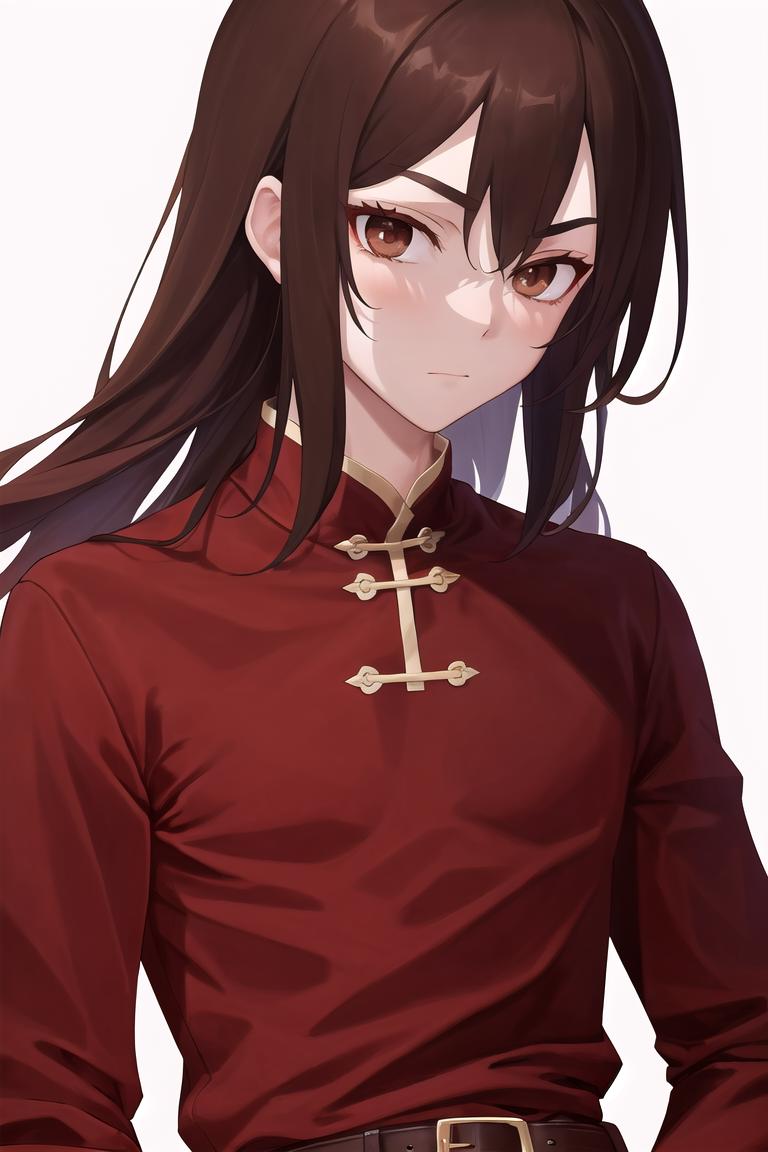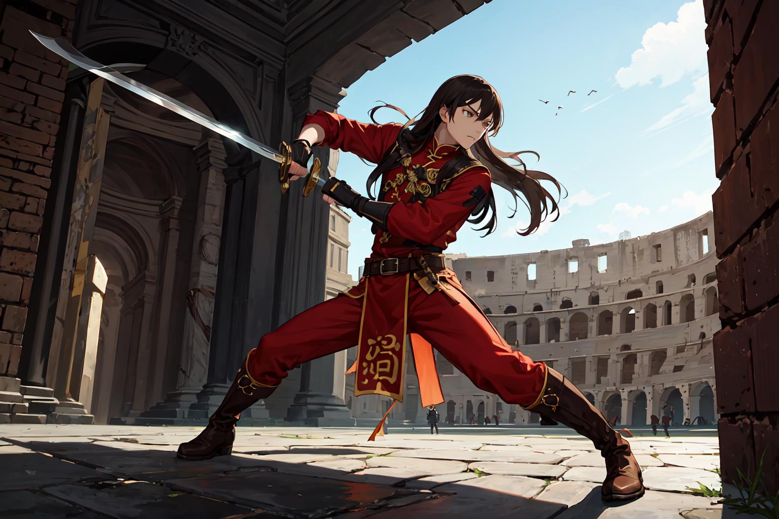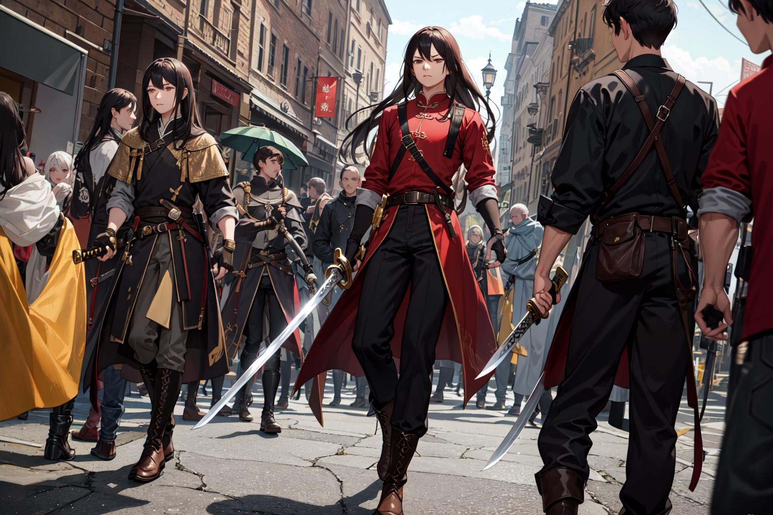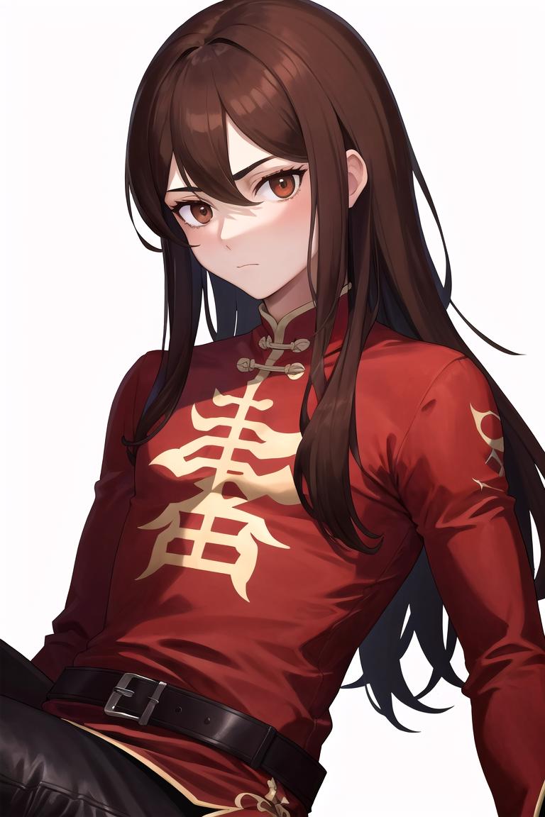 long hair, boots, belt, side slit, pants, black legwear, chinese clothes, red shirt, long sleeves, sheath, sword, katana, brown footwear, elbow gloves, fingerless gloves
