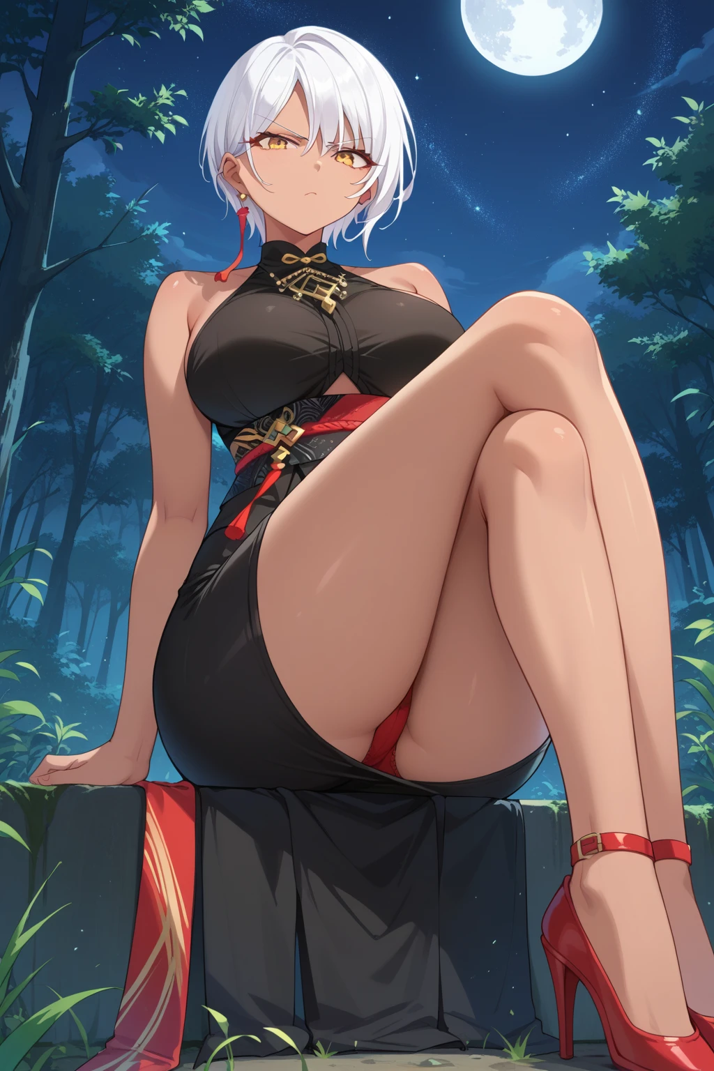 Feihong, dark skin, yellow eyes, white hair, short hair, earrings, single earrings, halterneck, black top, sleeveless, jewelry, clothing cutout, sash, skirt, black skirt, miniskirt🌟 Thanks so much for supporting! 🌟