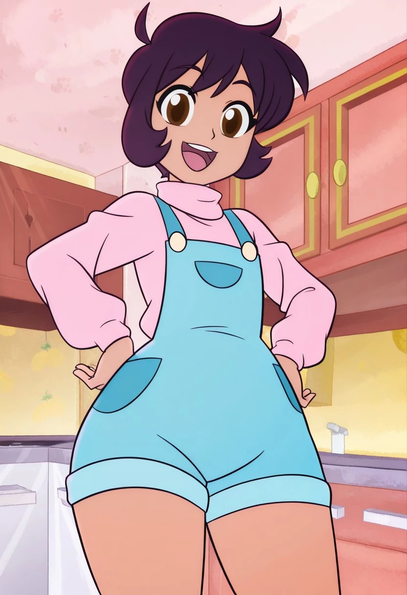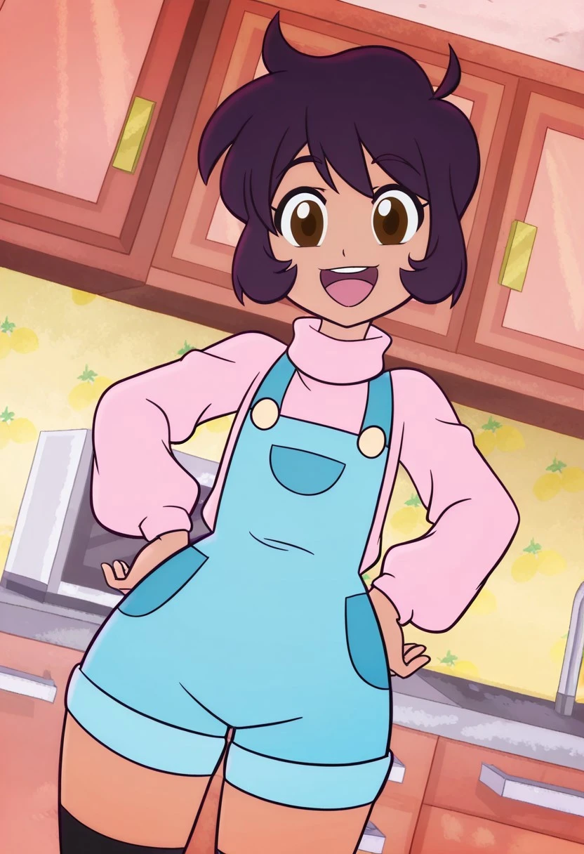 Rue Cervello, tan skin, hazelnut brown eyes, bangs, black with a slight tinge of purple hair, bright pink sweater turtleneck white backpack, indigo denim overalls on top, overall shorts, pink furhat, Bright turquoise sneakers,