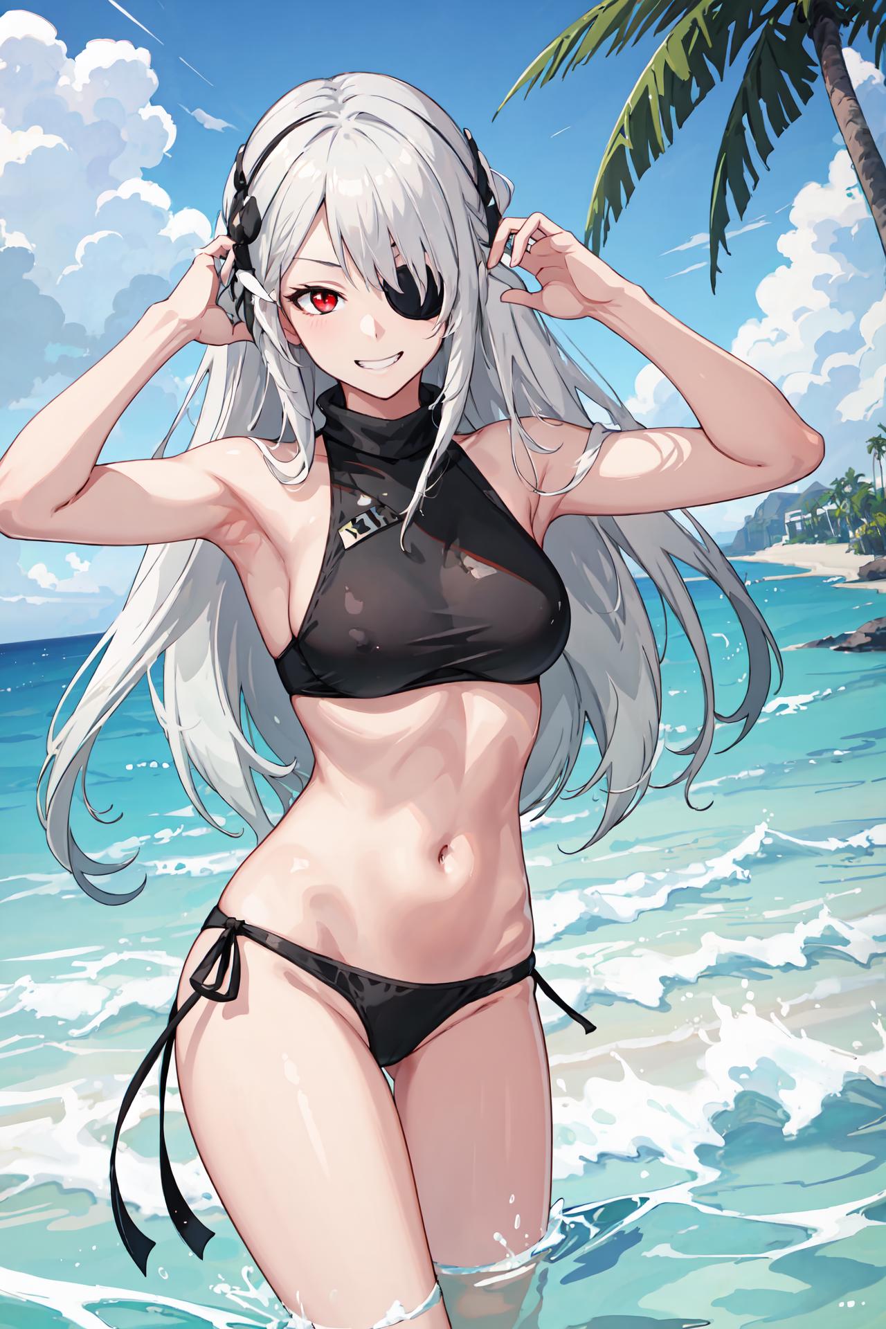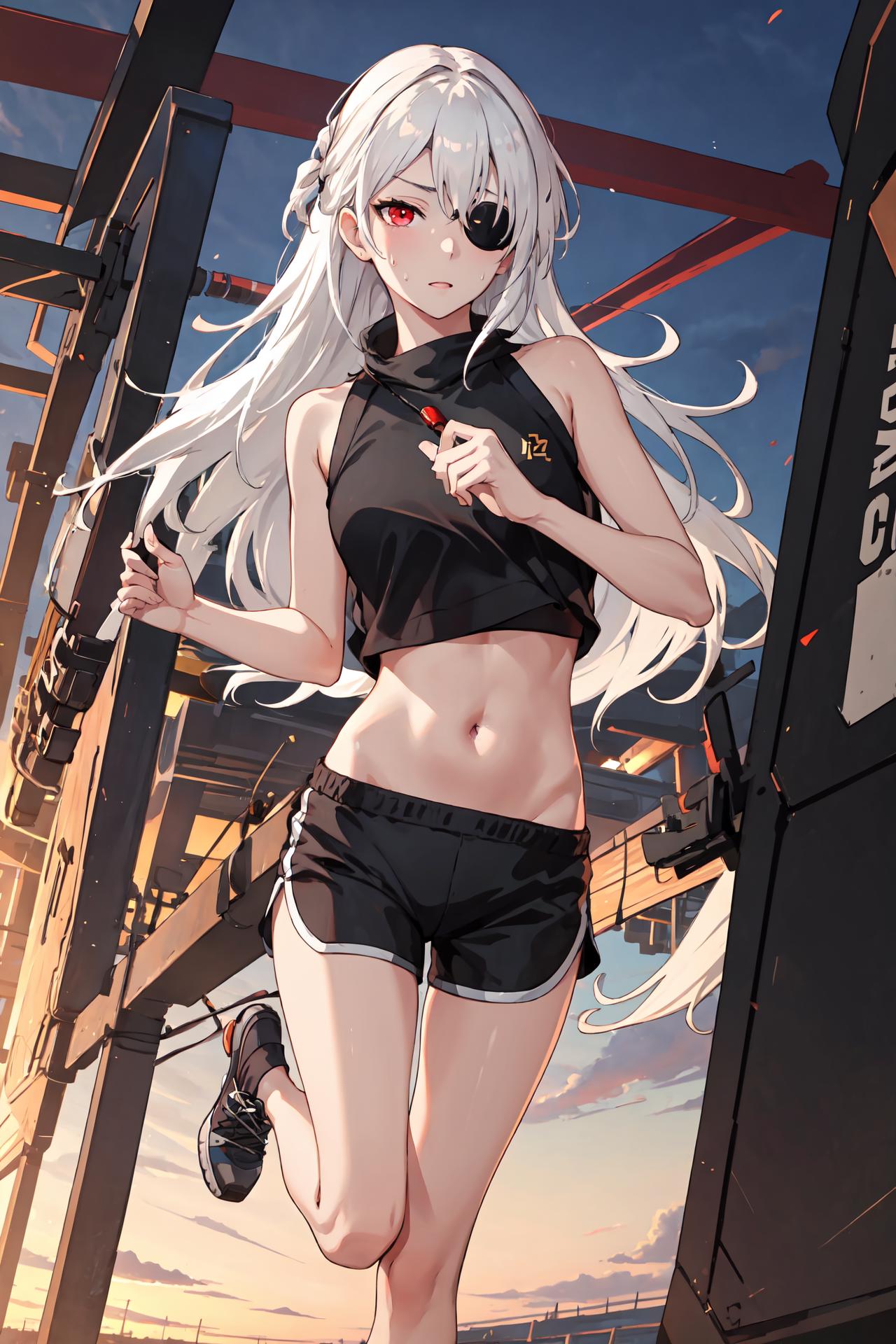 Base Parameters: evelyn, white hair, long hair, red eyes, eyepatch, black and red cape, red gloves, tactical clothes, torn clothes, black pantyhose, laced boots, knee guards,