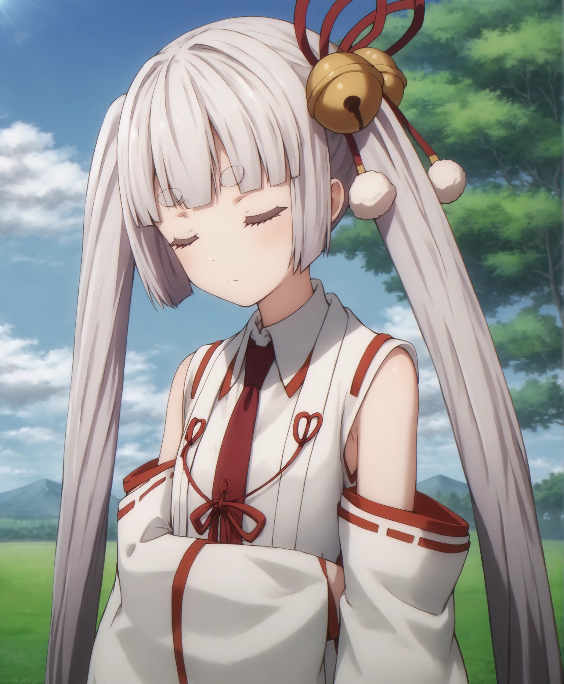 long hair, hair ornament, ribbon, very long hair, twintails, closed eyes, white hair, hair ribbon, red ribbon, bell, thick eyebrows, jingle bell, hair bell, short eyebrows