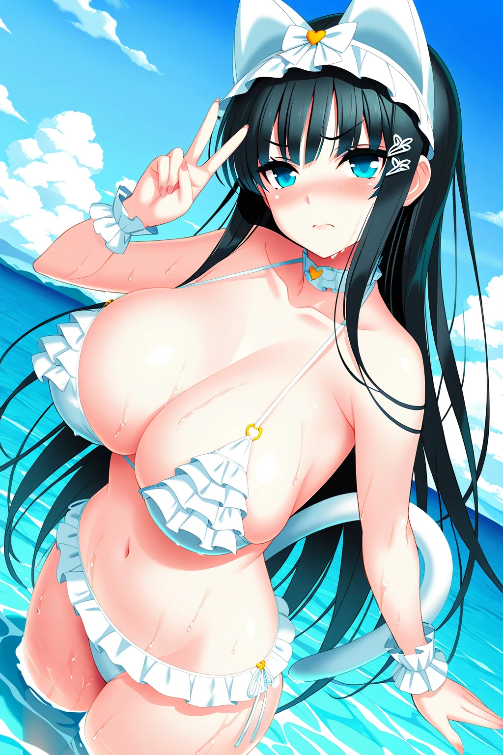cpcs_mh, 1girl, solo, blue eyes, black hair, long hair, large breasts, lips, hair ornament, choker, white frilled bikini, cleavage, navel, wrist cuffs, fake cat ears, fake cat tail,