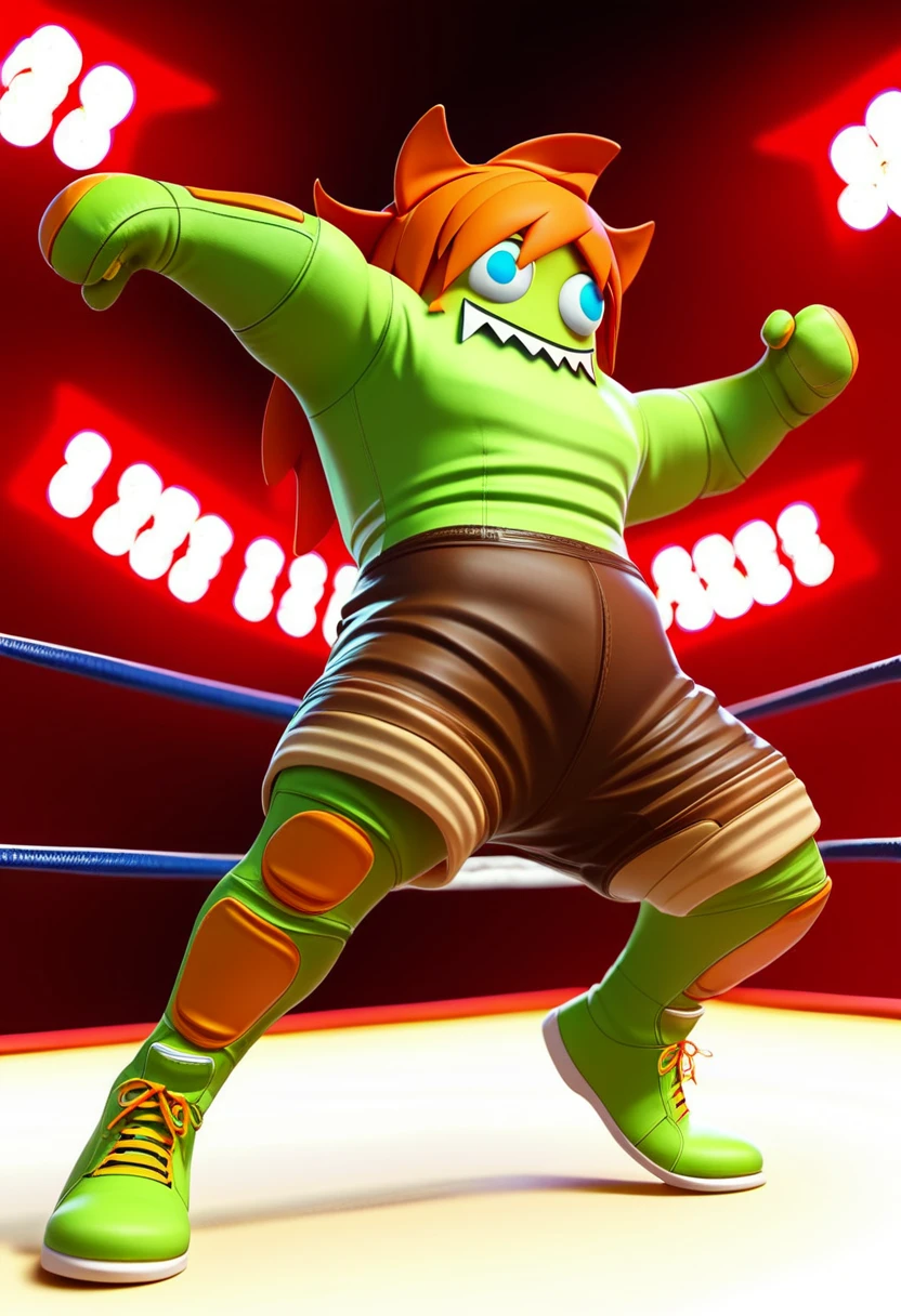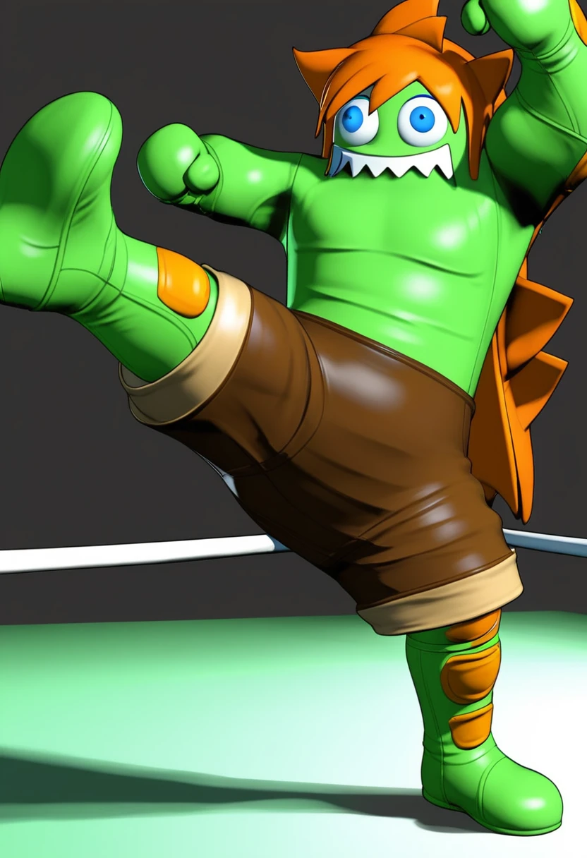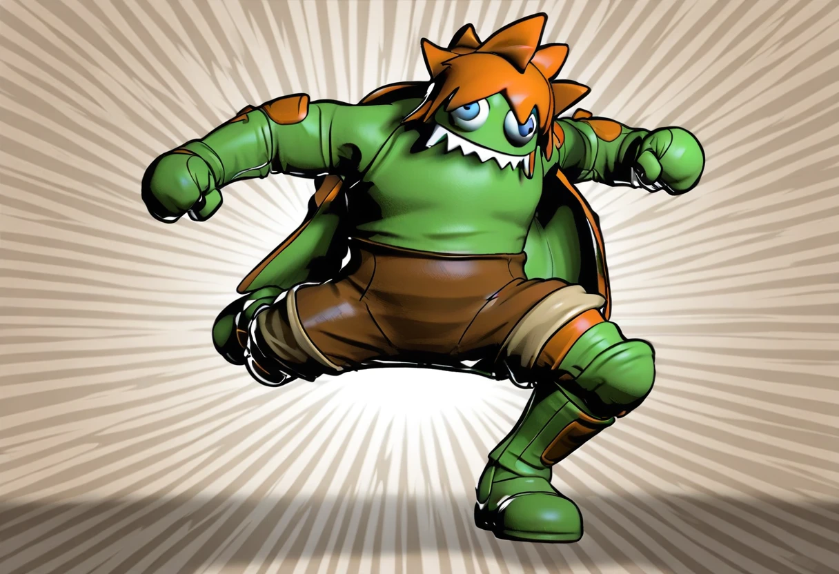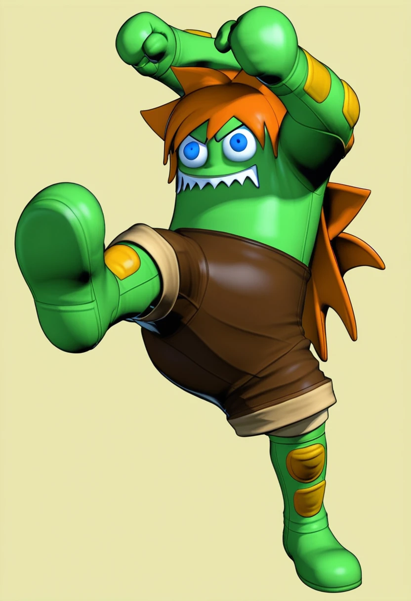 Reinforcement tags: bl@nk@ch@n, blanka chan, blue eyes, brown shorts, full body, green footwear, no humans, orange hair, solo, 1 boy, teeth,