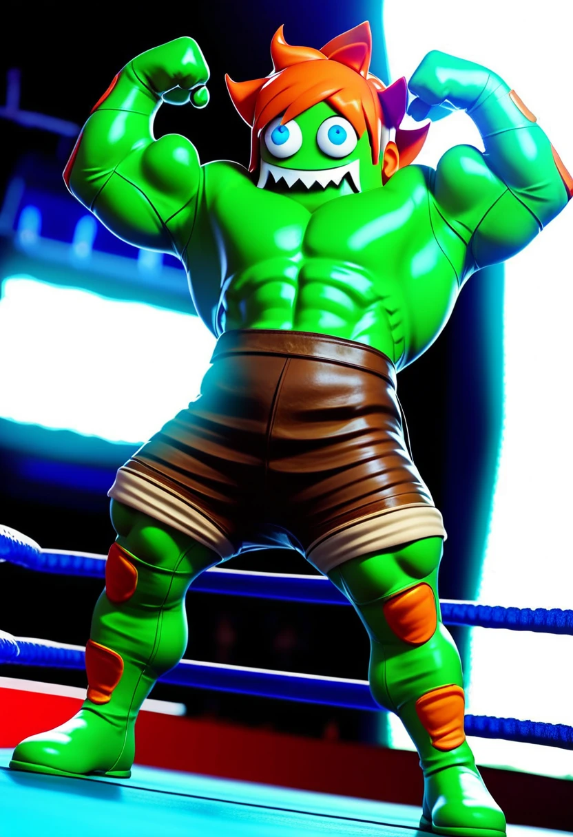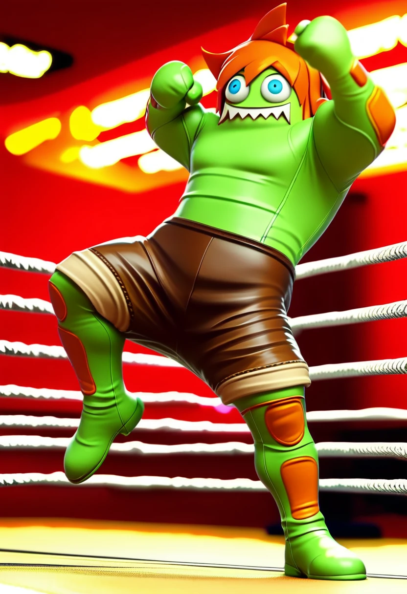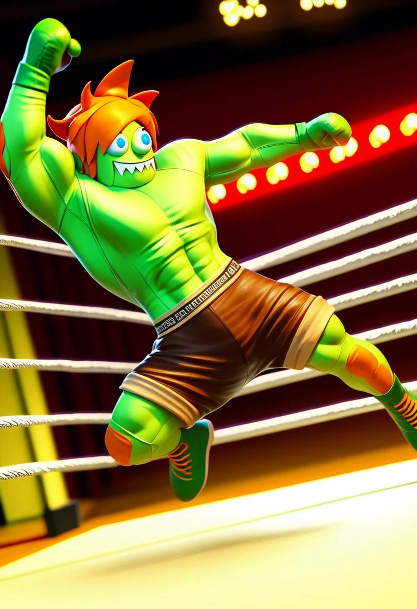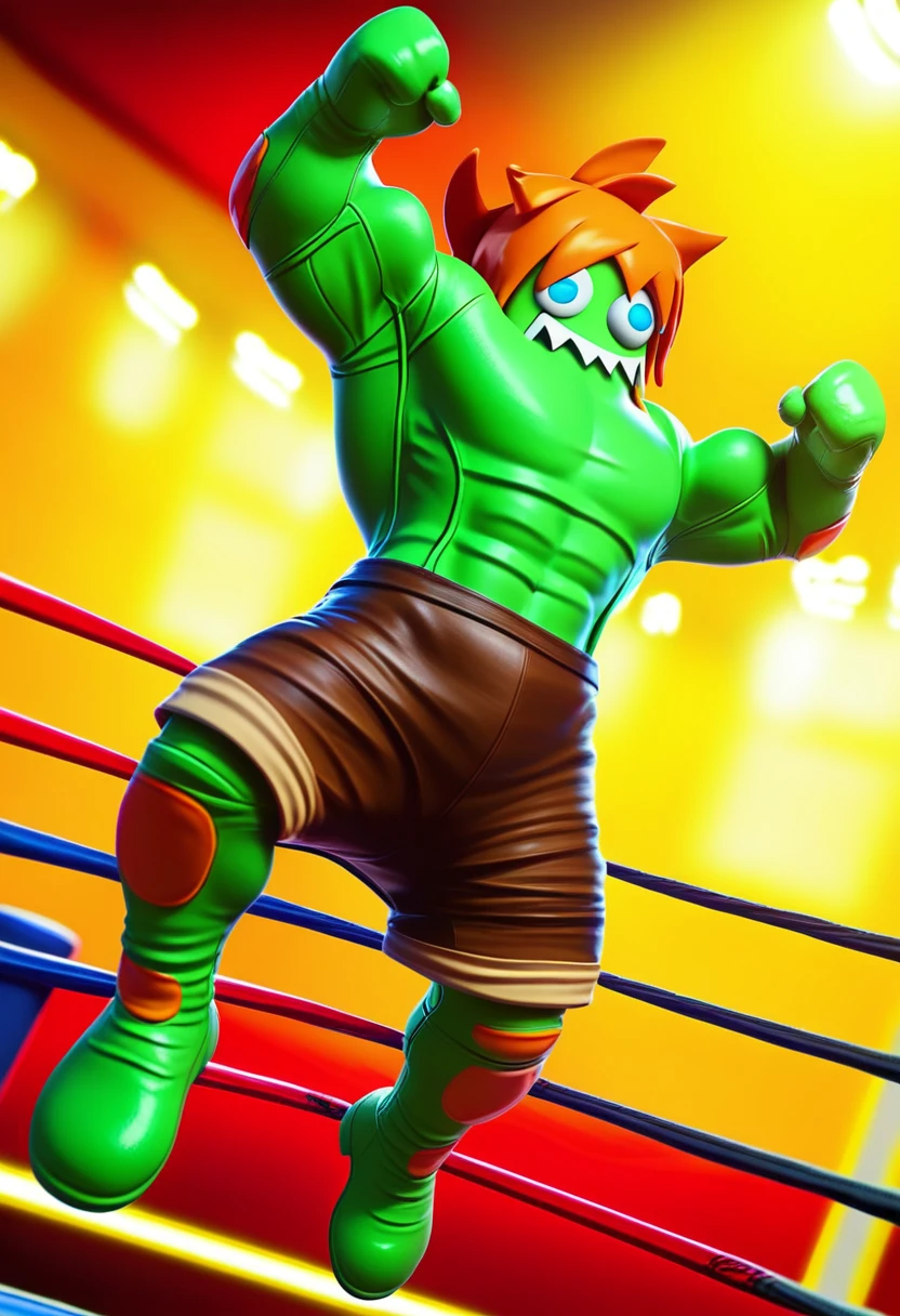 Reinforcement tags: bl@nk@ch@n, blanka chan, blue eyes, brown shorts, full body, green footwear, no humans, orange hair, solo, 1 boy, teeth,