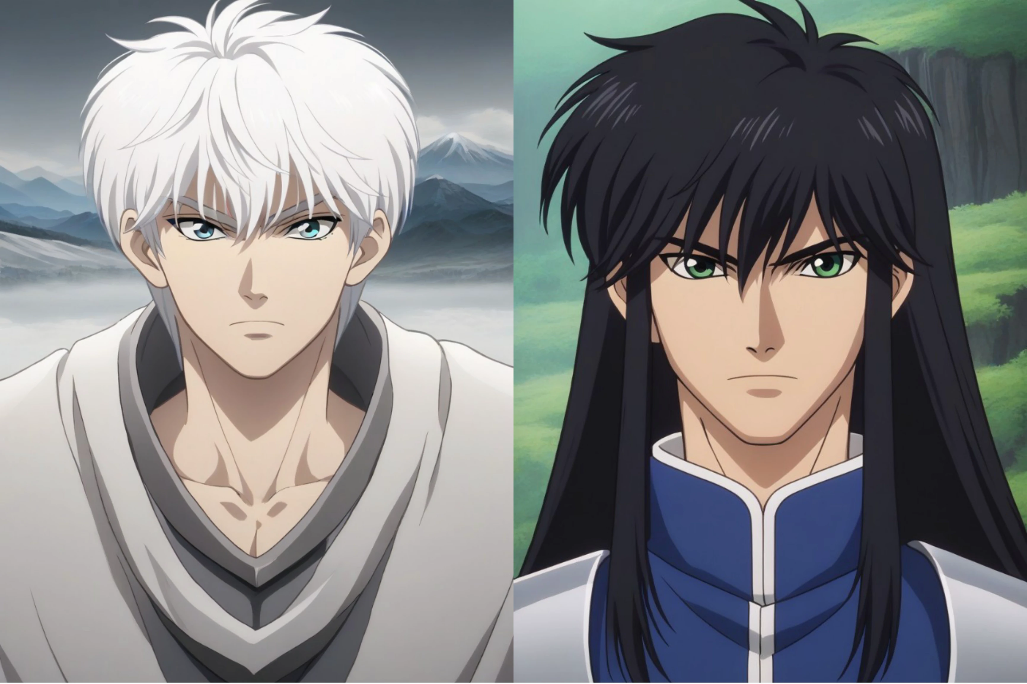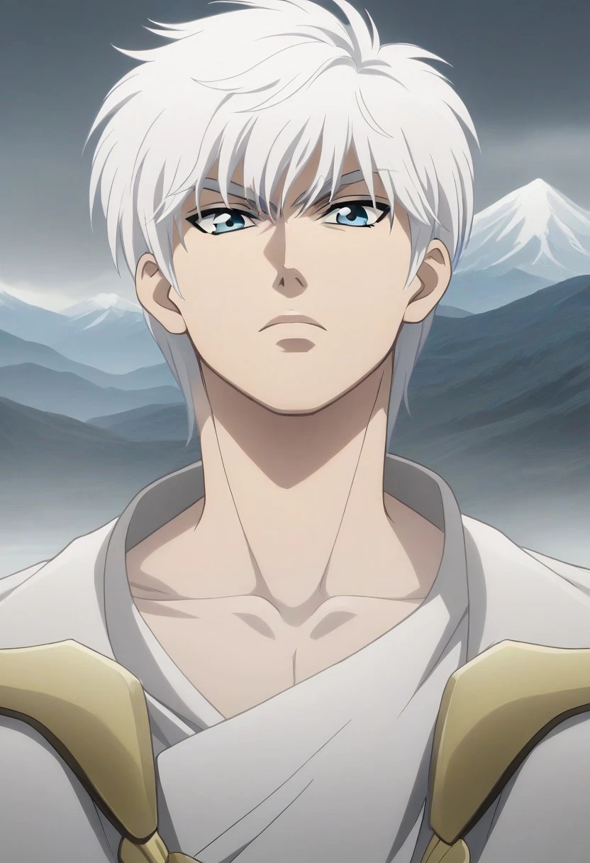 Kall-Su, white hair, short hair, light blue eyes, white cape, pauldrons