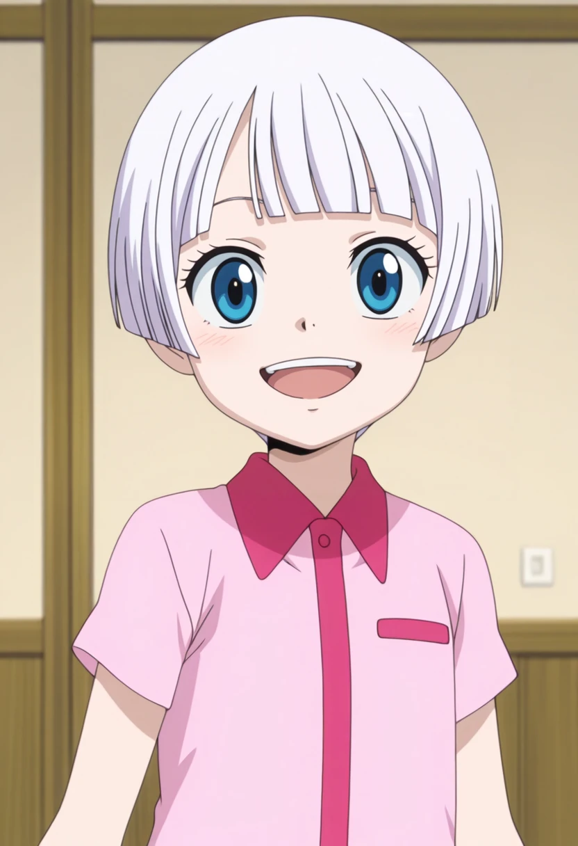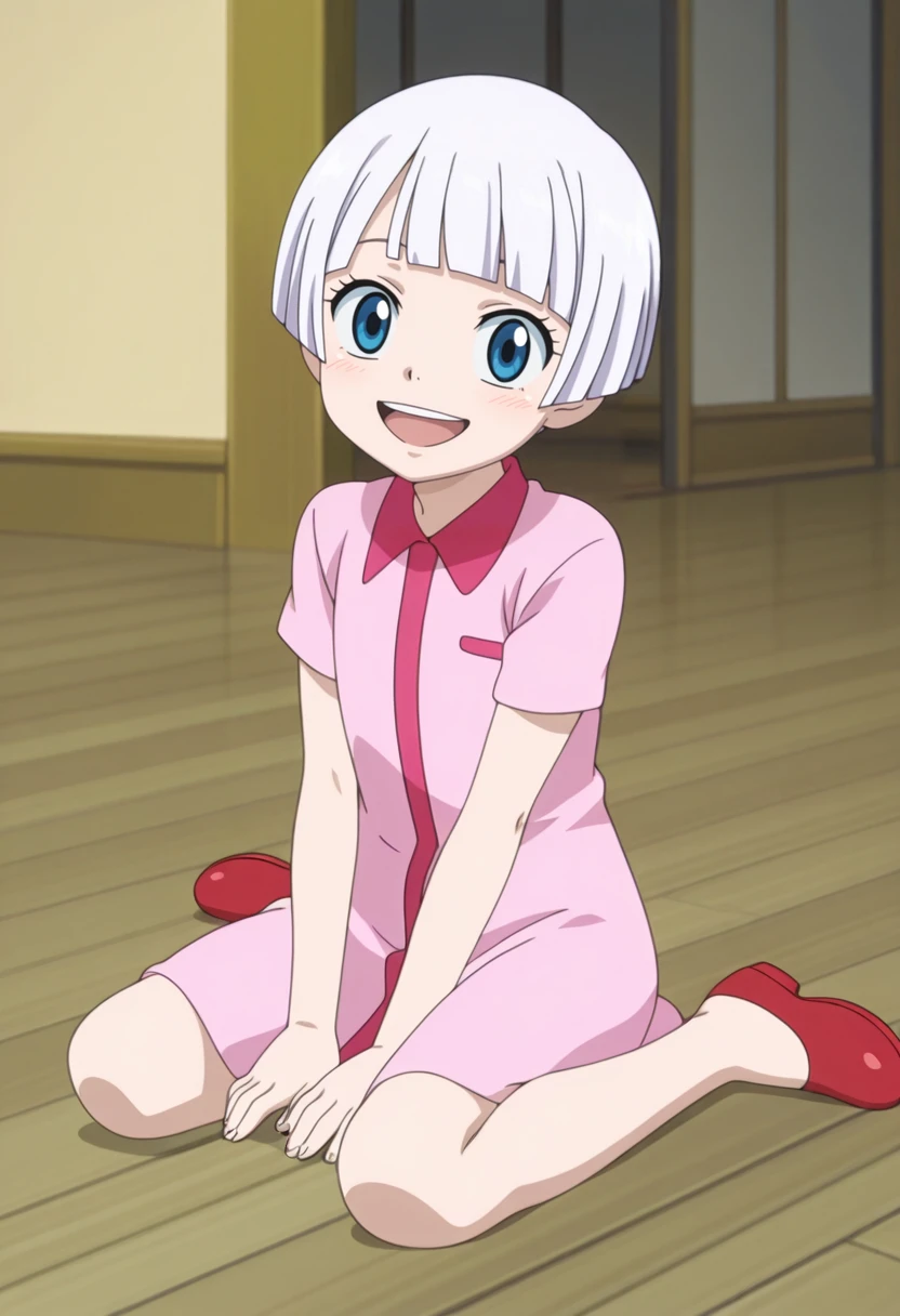 lisanna, blue eyes, white hair, short hair, blunt bangs, pink shirtdress, shirtdress, short sleeves, red footwear,