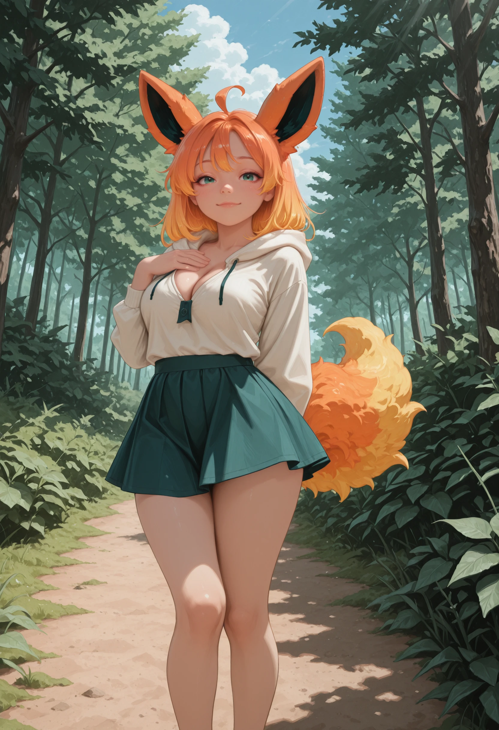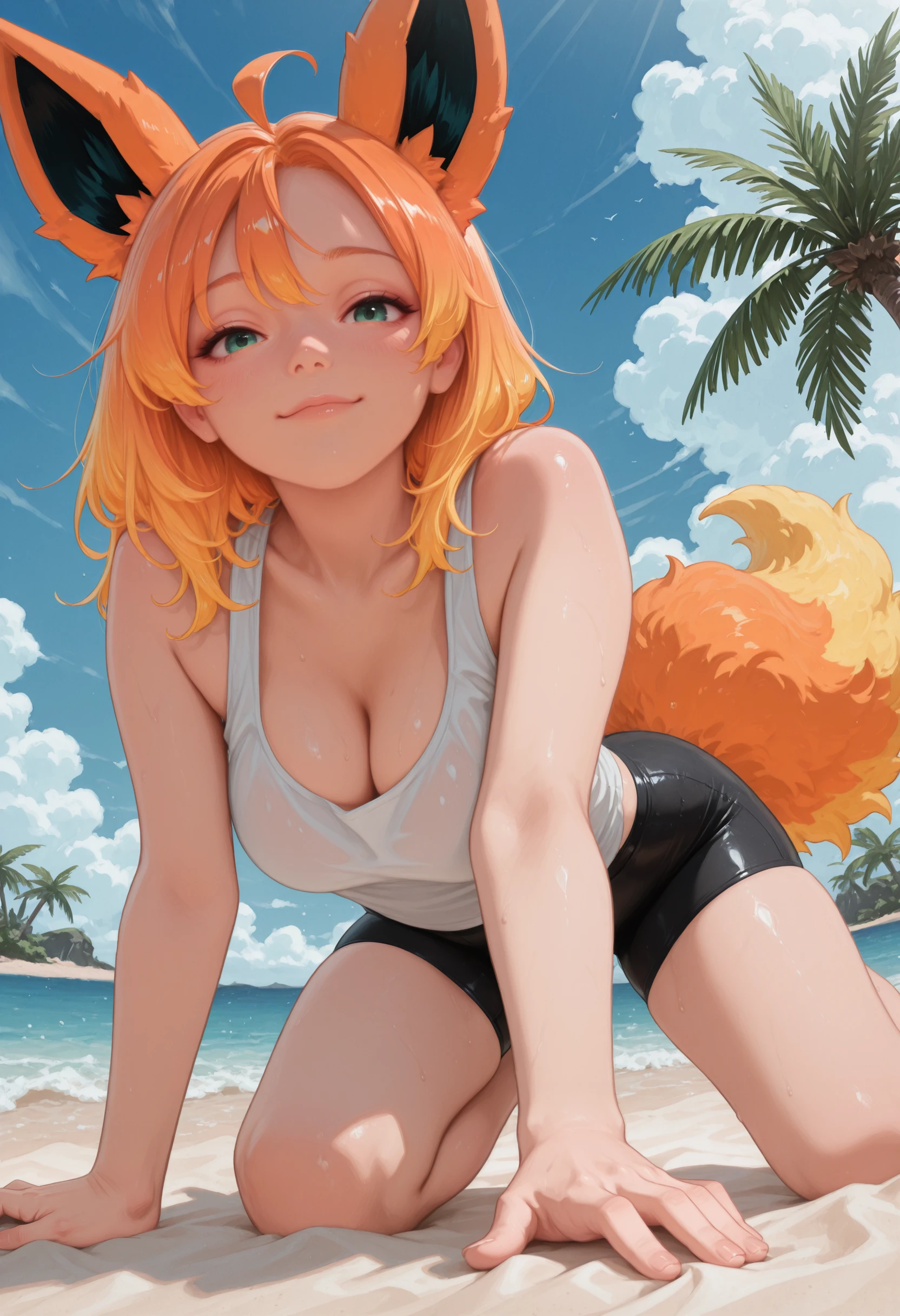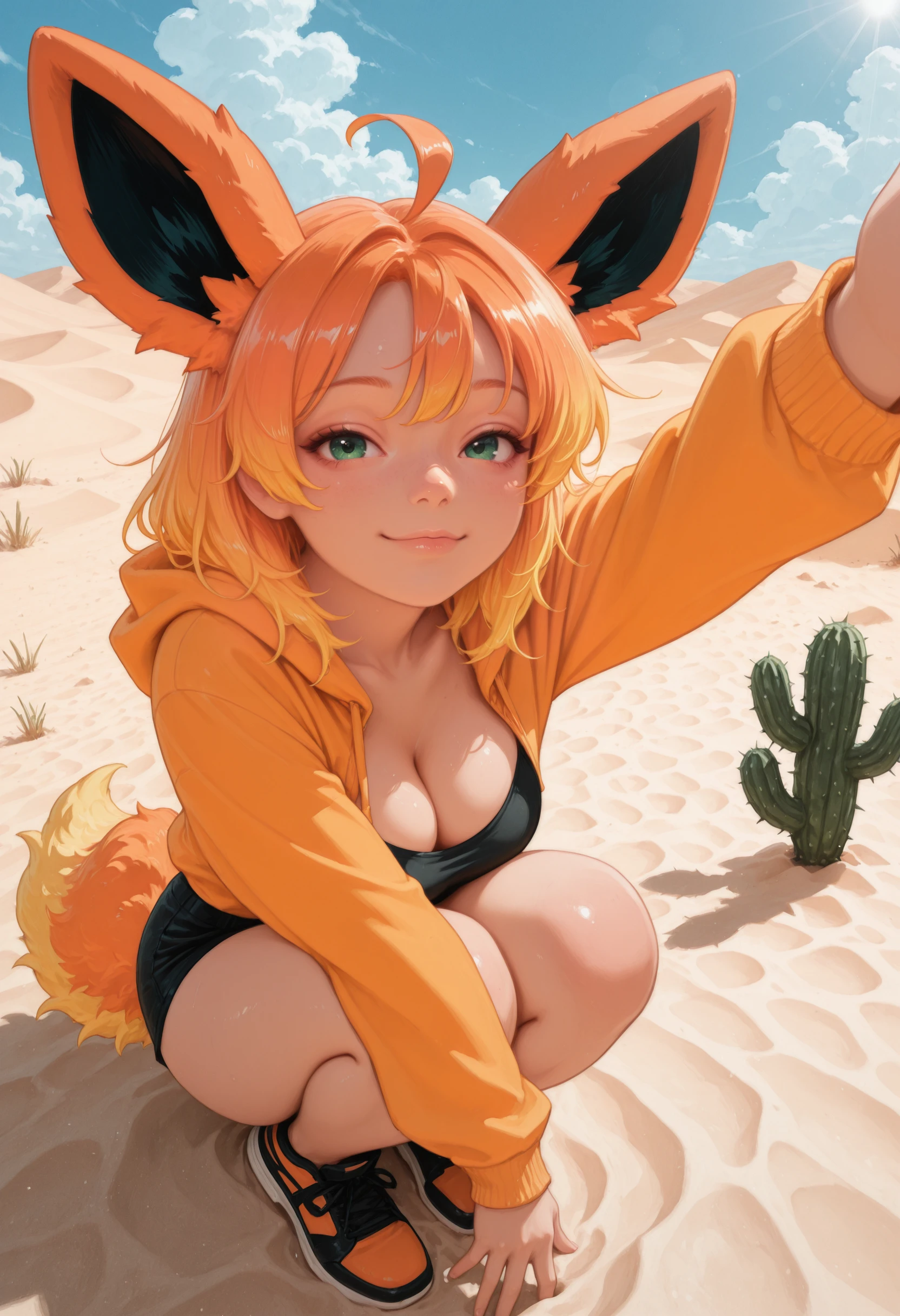 (Positive Prompts) lynflaron, personification, monster girl, animal ears, fluffy tail, gradient hair, yellow hair, orange hair, ahoge, green eyes,