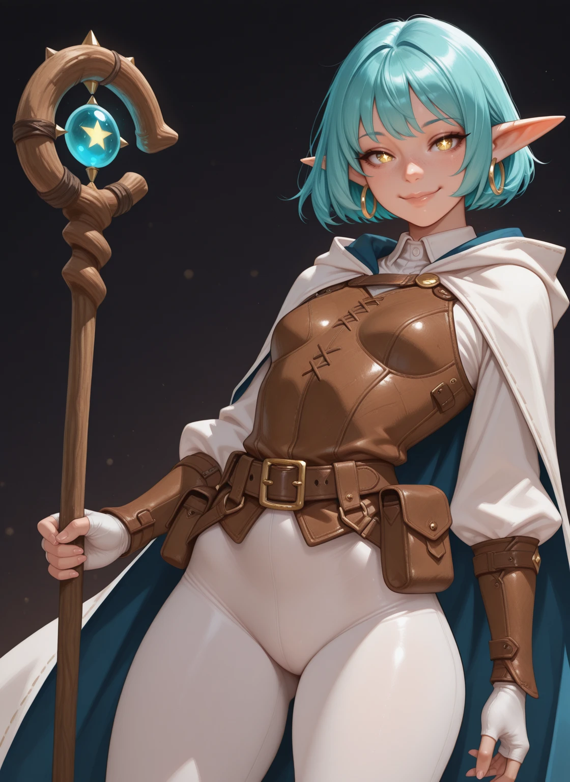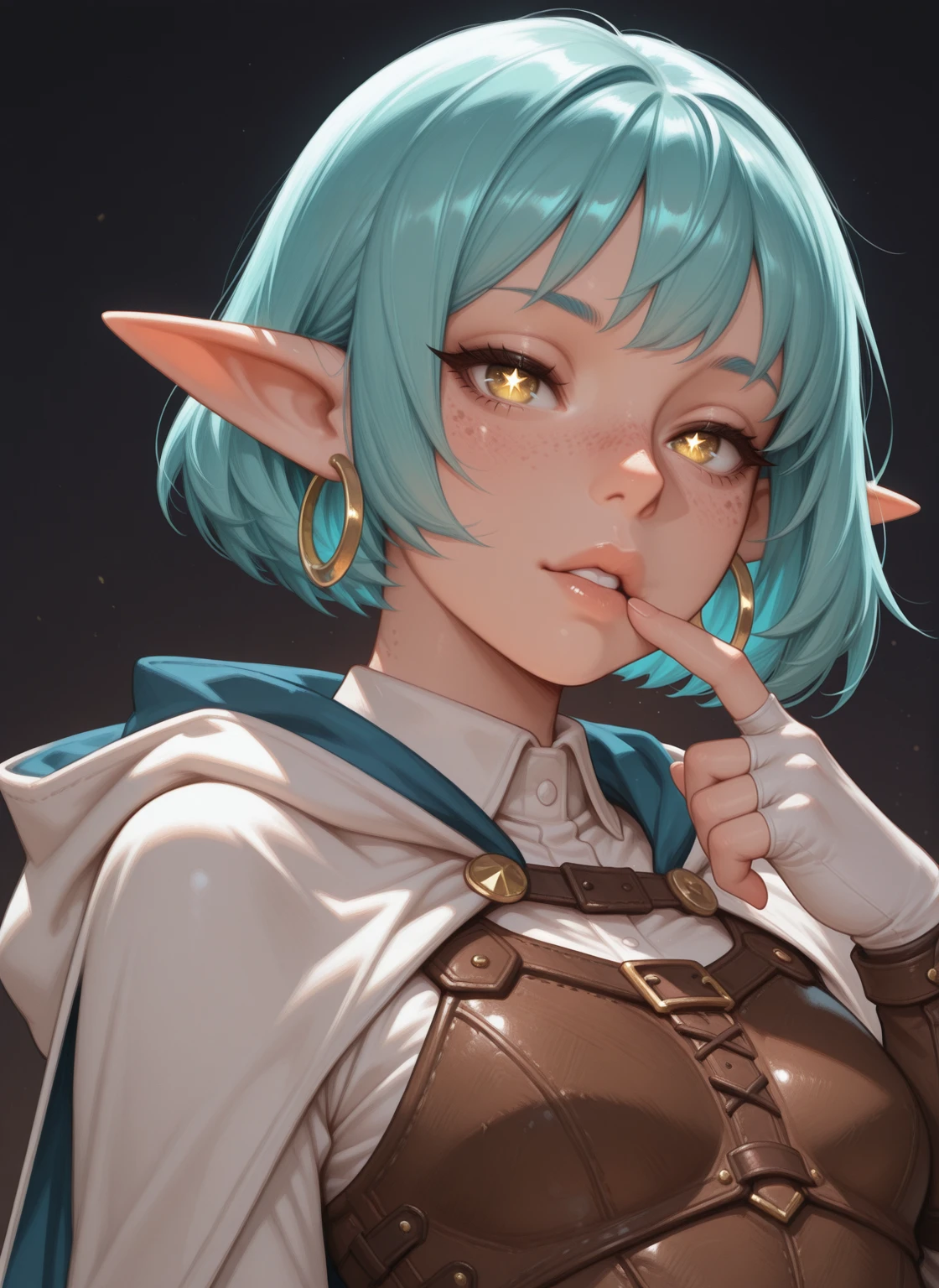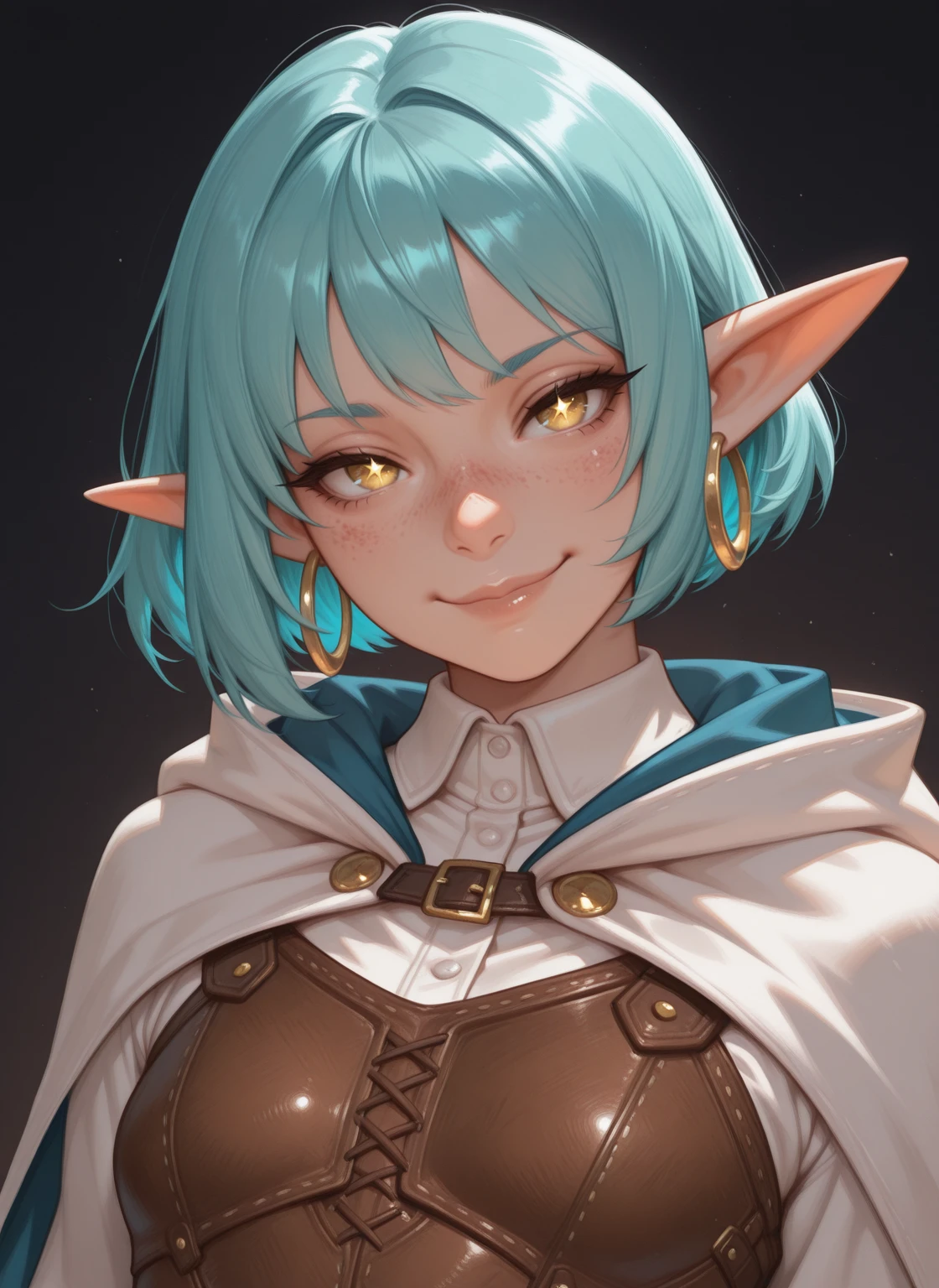 Fina_oc, short height, elf, fair skin, yellow eyes, star eyes, freckles, Aqua Hair, Short hair, Petite Body, Small Breasts,