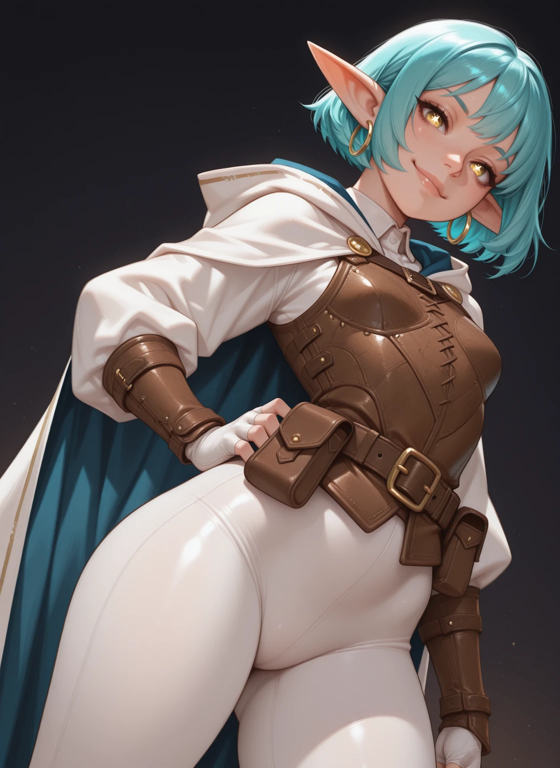 White shirt, Leather Chest Armor, Two-sided cape, white cape, blue cape, Hood down, White leggings, White Gloves, Fingerless, Leather bracers, Leather Belt, Belt Pouch, Leather Boots, Hoop Earrings,