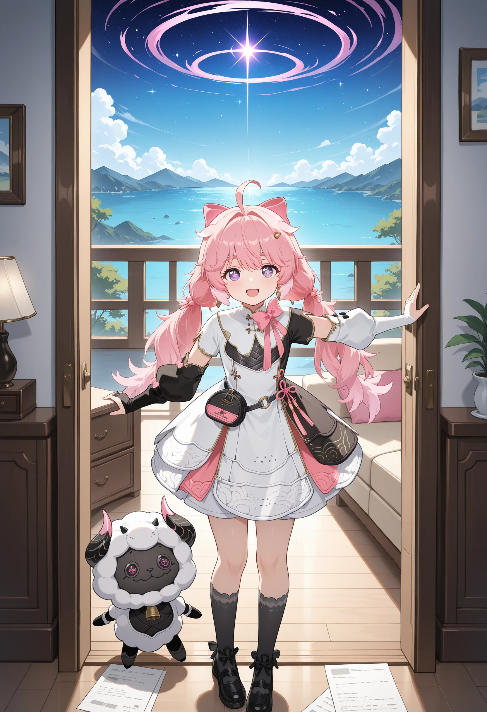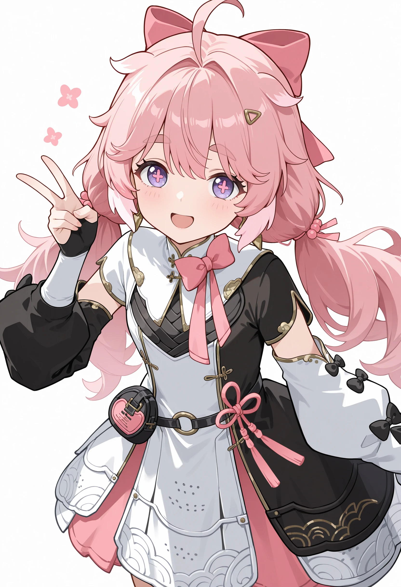 encore \(wuthering waves\), cross-shaped-pupils, thick eyebrows, purple eyes, blush, hair ornament, pink hair, ahoge, hair bow, pink bow, low twintails, dress, bag, earrings, short, black sleeves, white sleeves, bowtie, black footwearany costume (weight 0.8-1) maybe some costume cant change