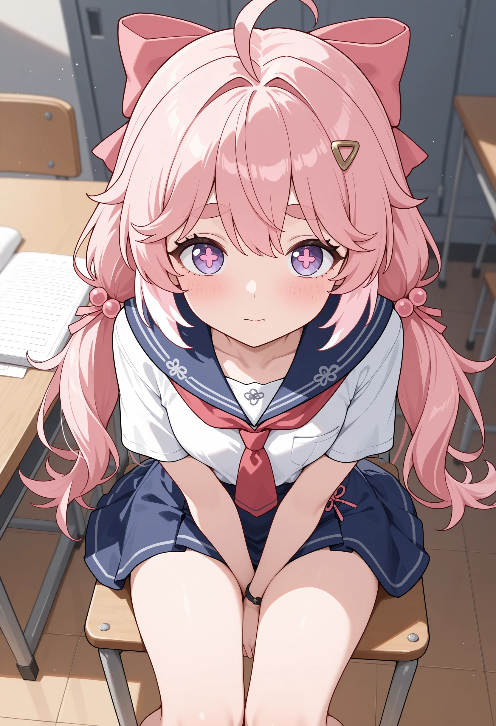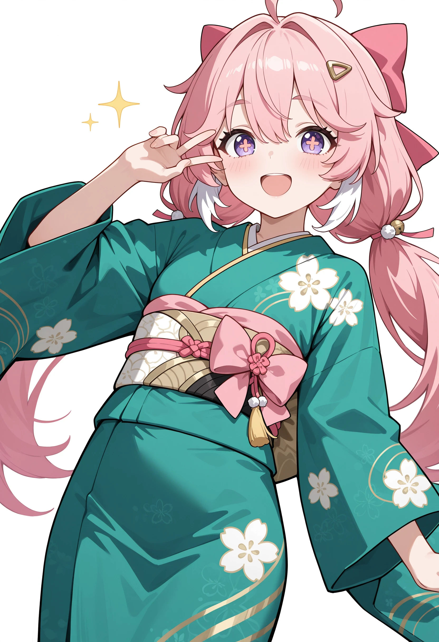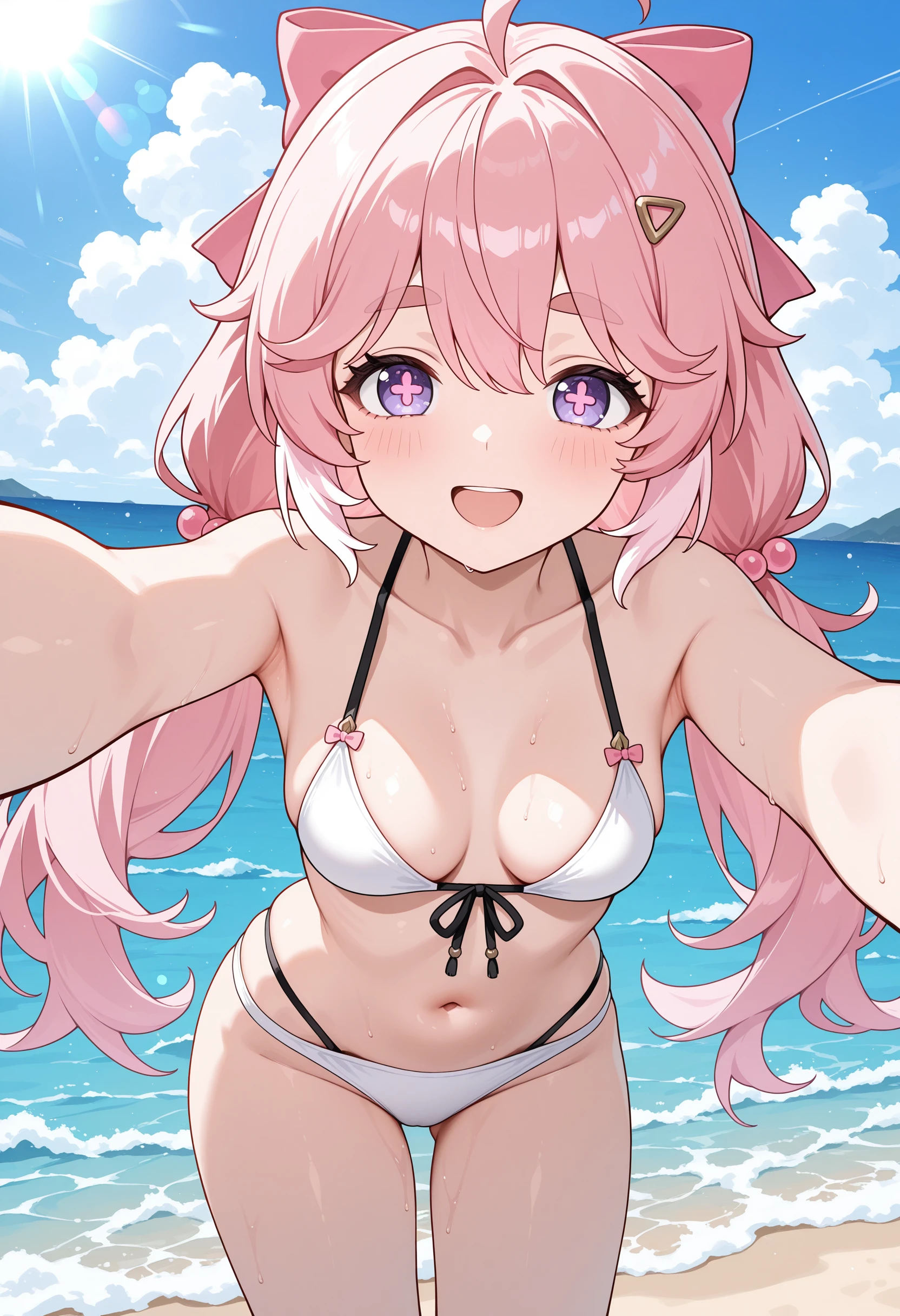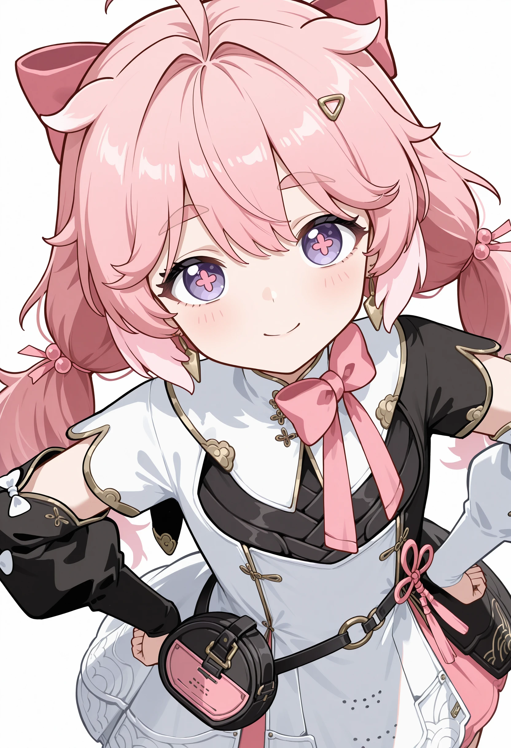 encore \(wuthering waves\), cross-shaped-pupils, thick eyebrows, purple eyes, blush, hair ornament, pink hair, ahoge, hair bow, pink bow, low twintailsLimitations