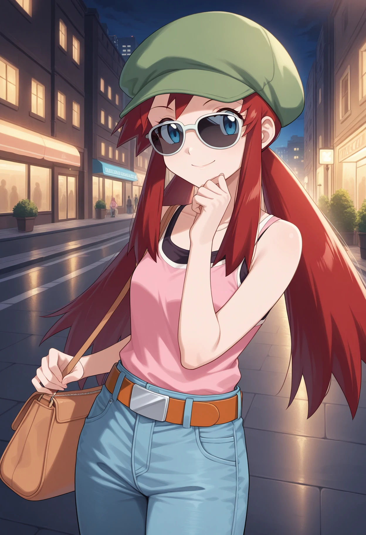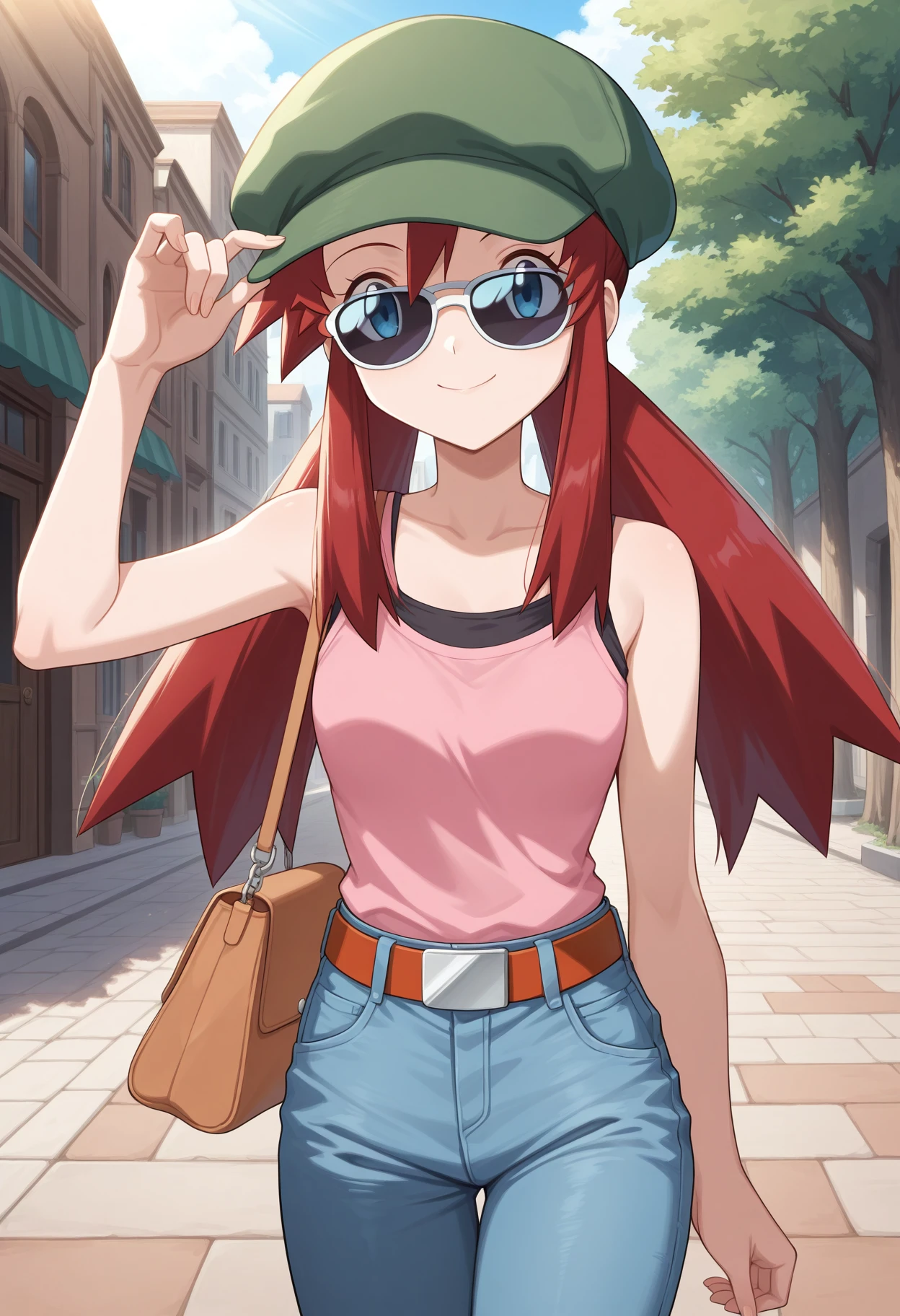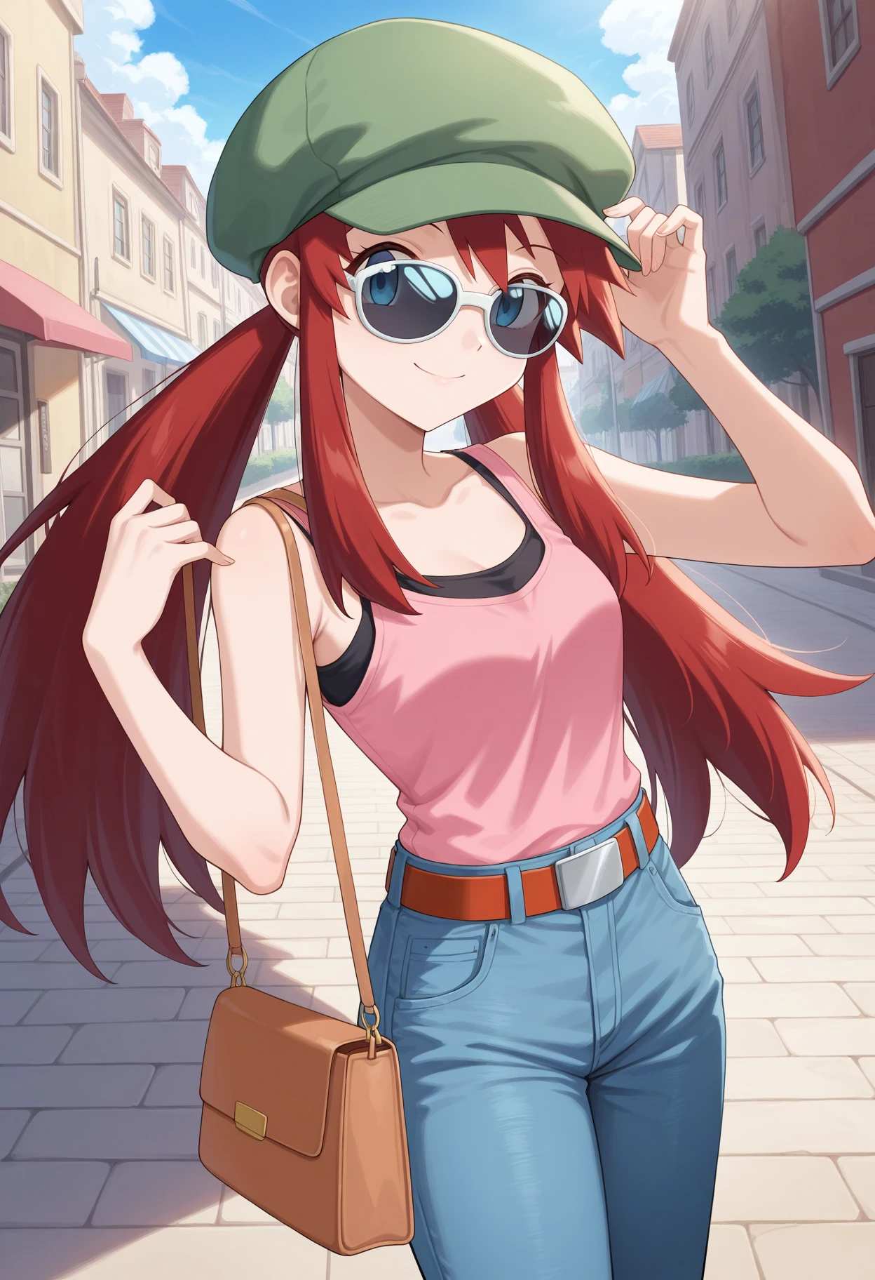 score_9, score_8_up, score_7_up, masterpiece, source_anime 1girl, ct_melody, blue eyes, red hair, twintails, green headwear, sunglasses, pink tank top, jeans, belt, brown handbag, indoors, wooden wall, looking at viewer, cowboy shot,Negative prompt ❌: