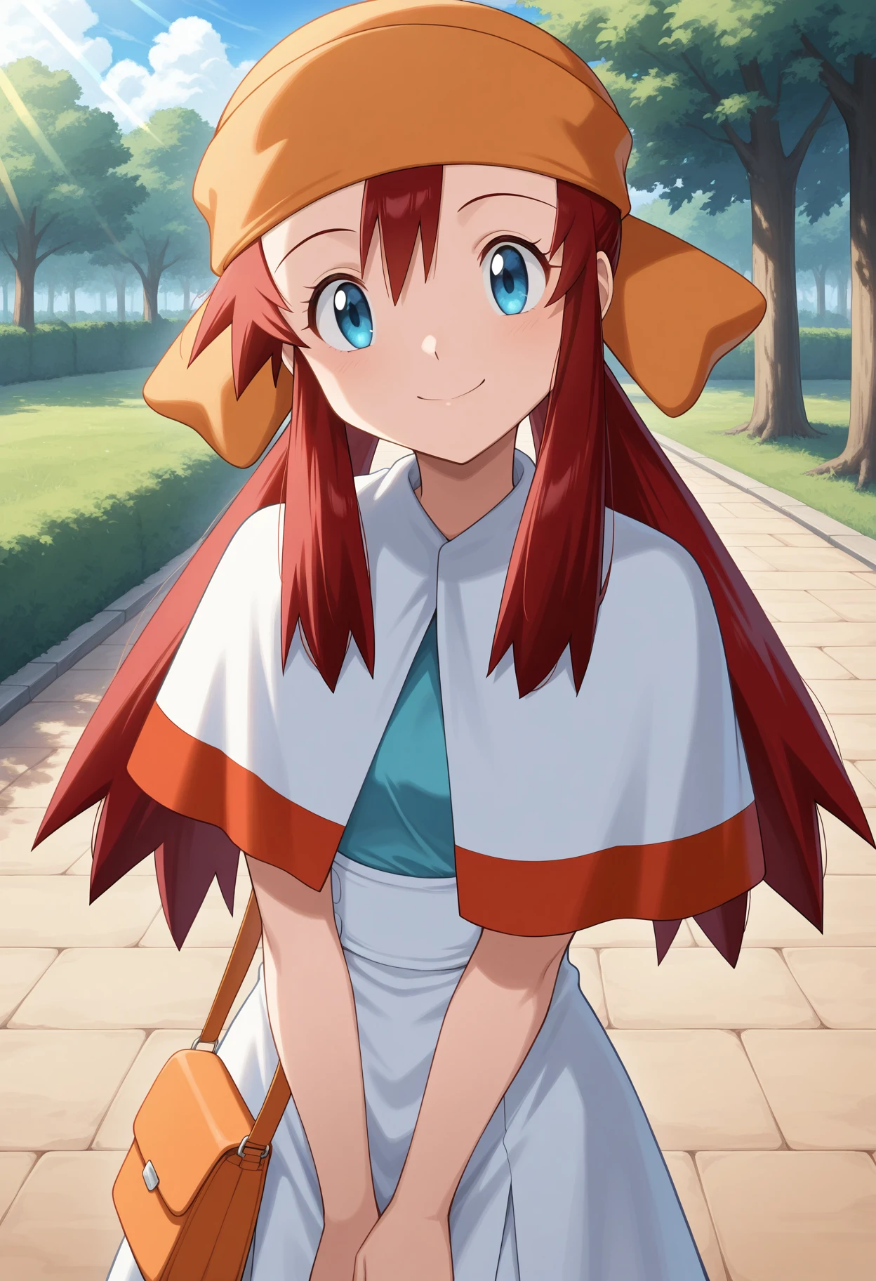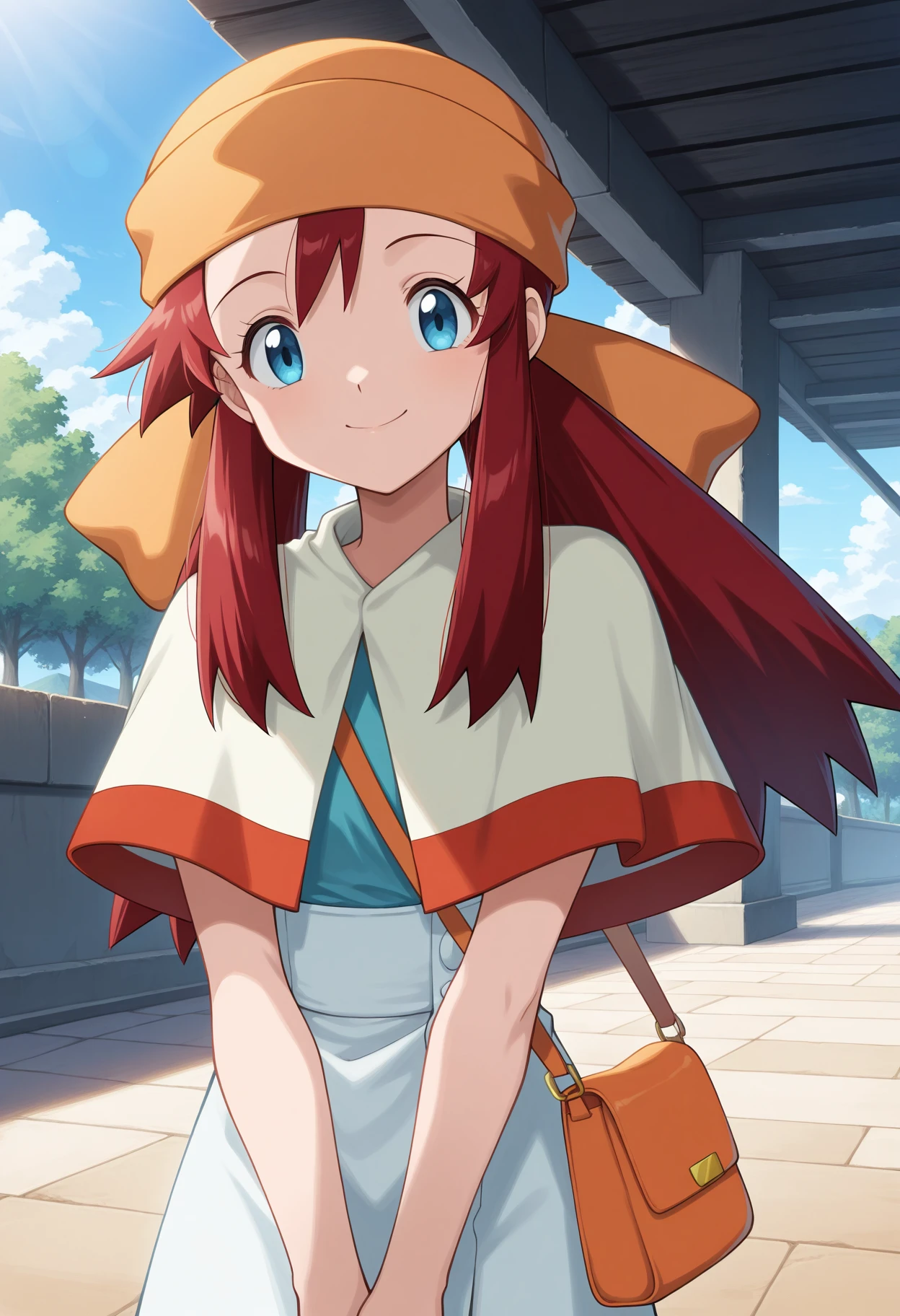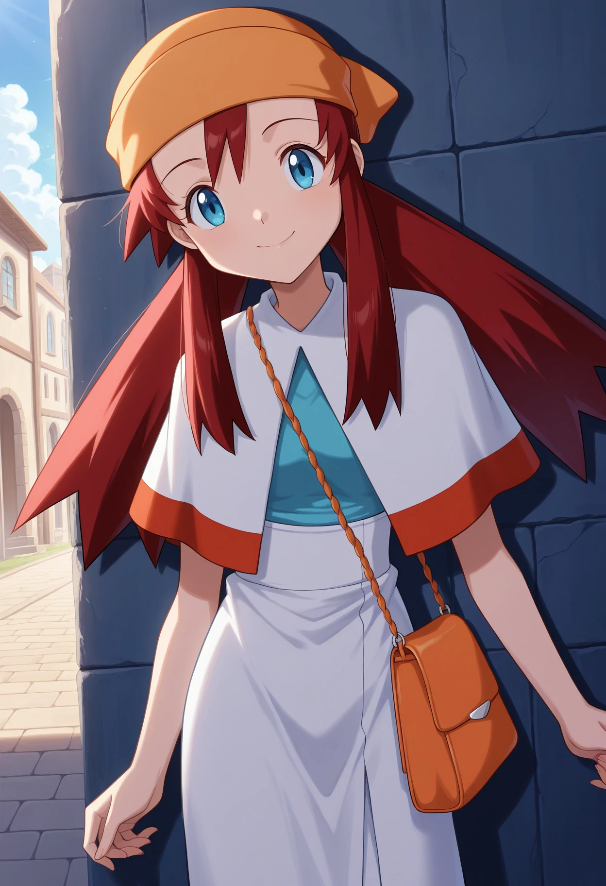 Clothing 1: orange bandana, cyan crop top, capelet, white high-waist skirt, orange handbag,