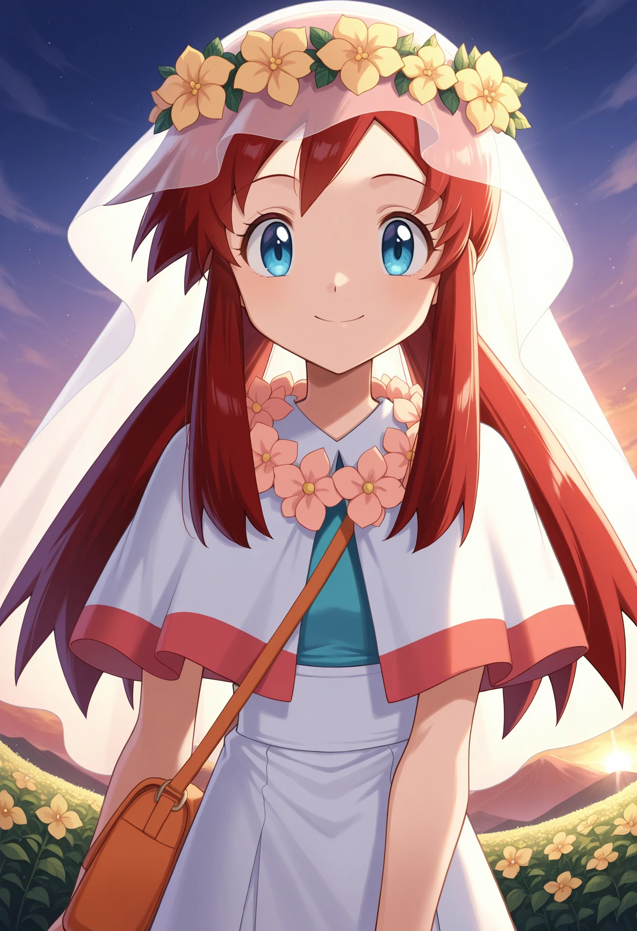 Clothing 3: flower wreath, veil, flower necklace, cyan tank top, capelet, white high-waist skirt, orange handbag,