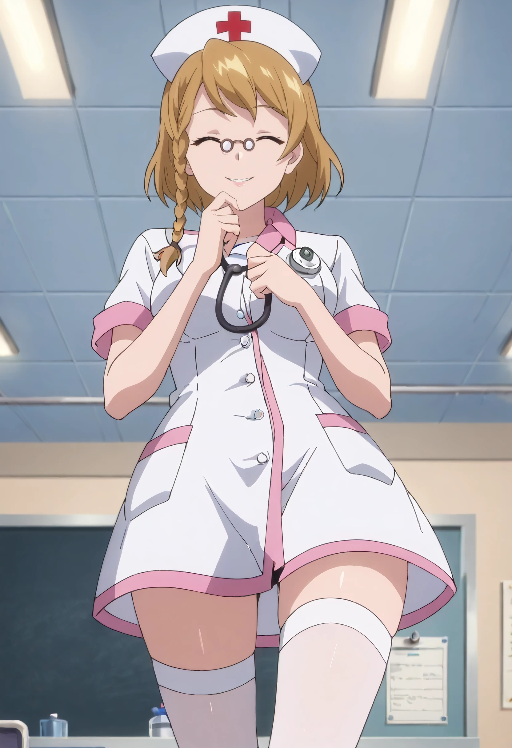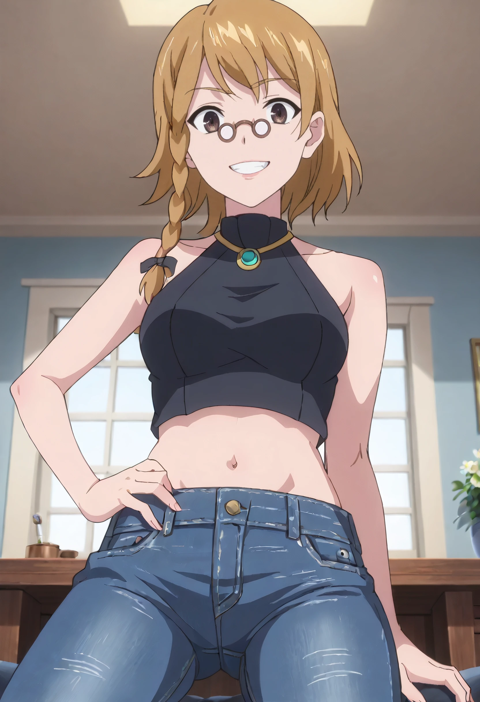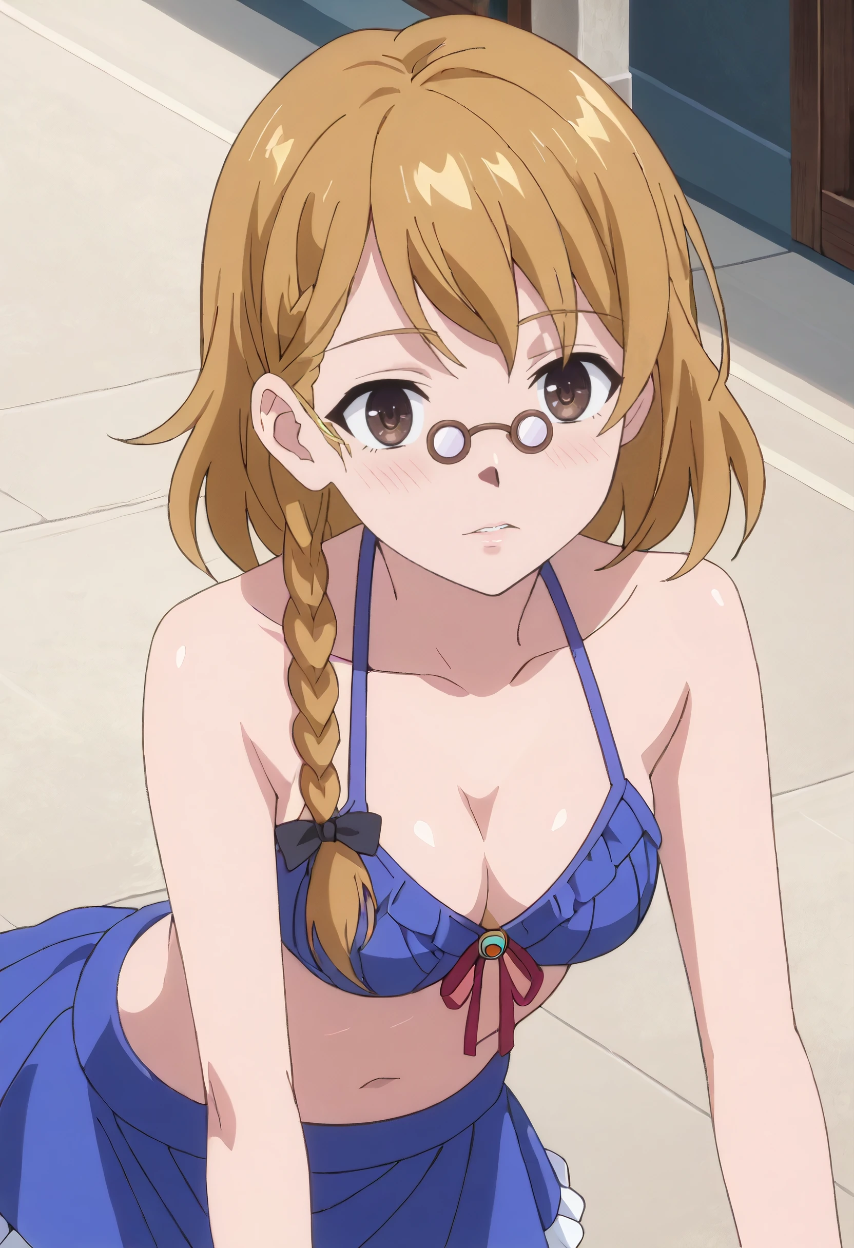 IAWPrim, braid, blonde hair, short hair, brown eyes, single braid, side braid, glasses, round eyewear,