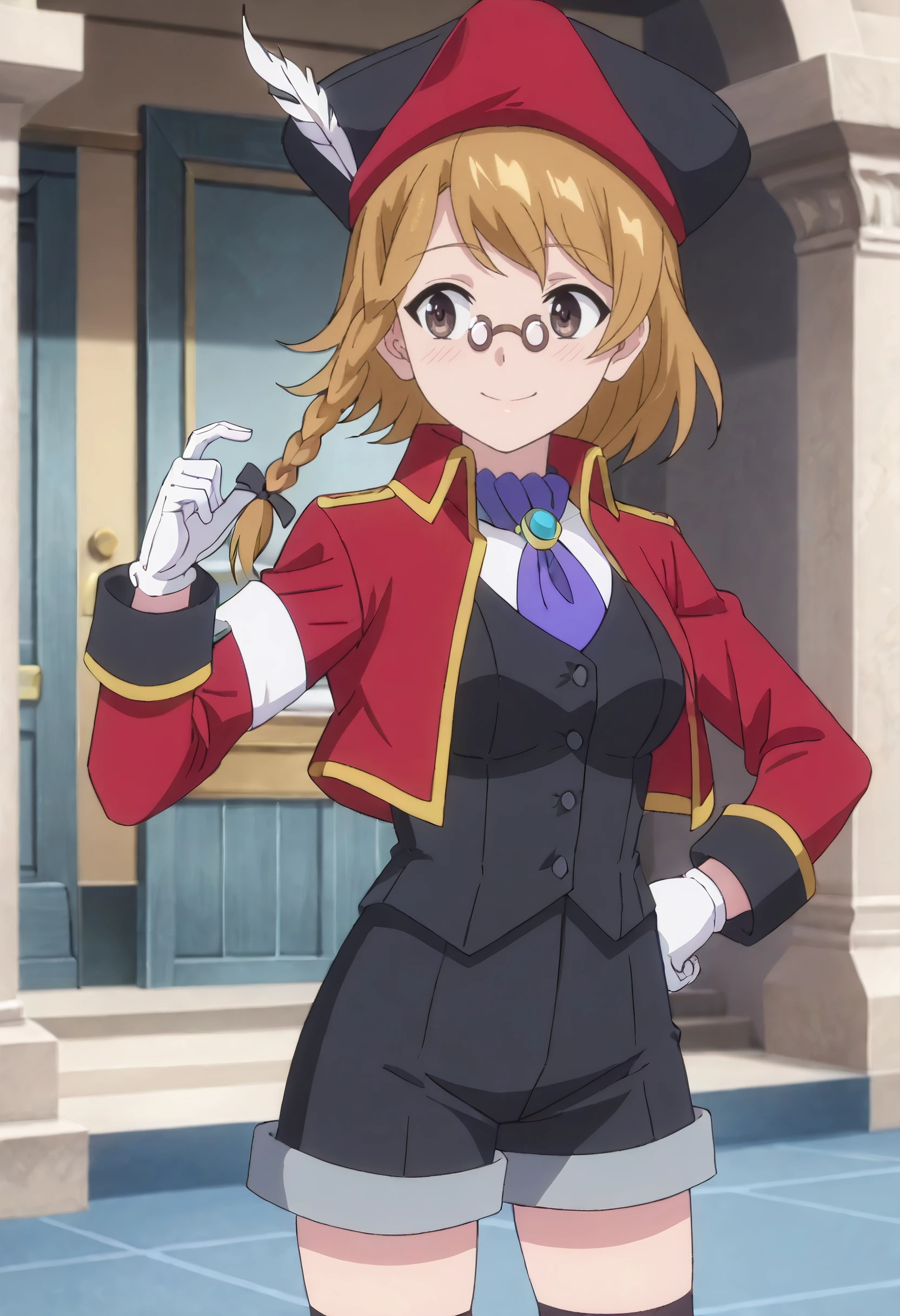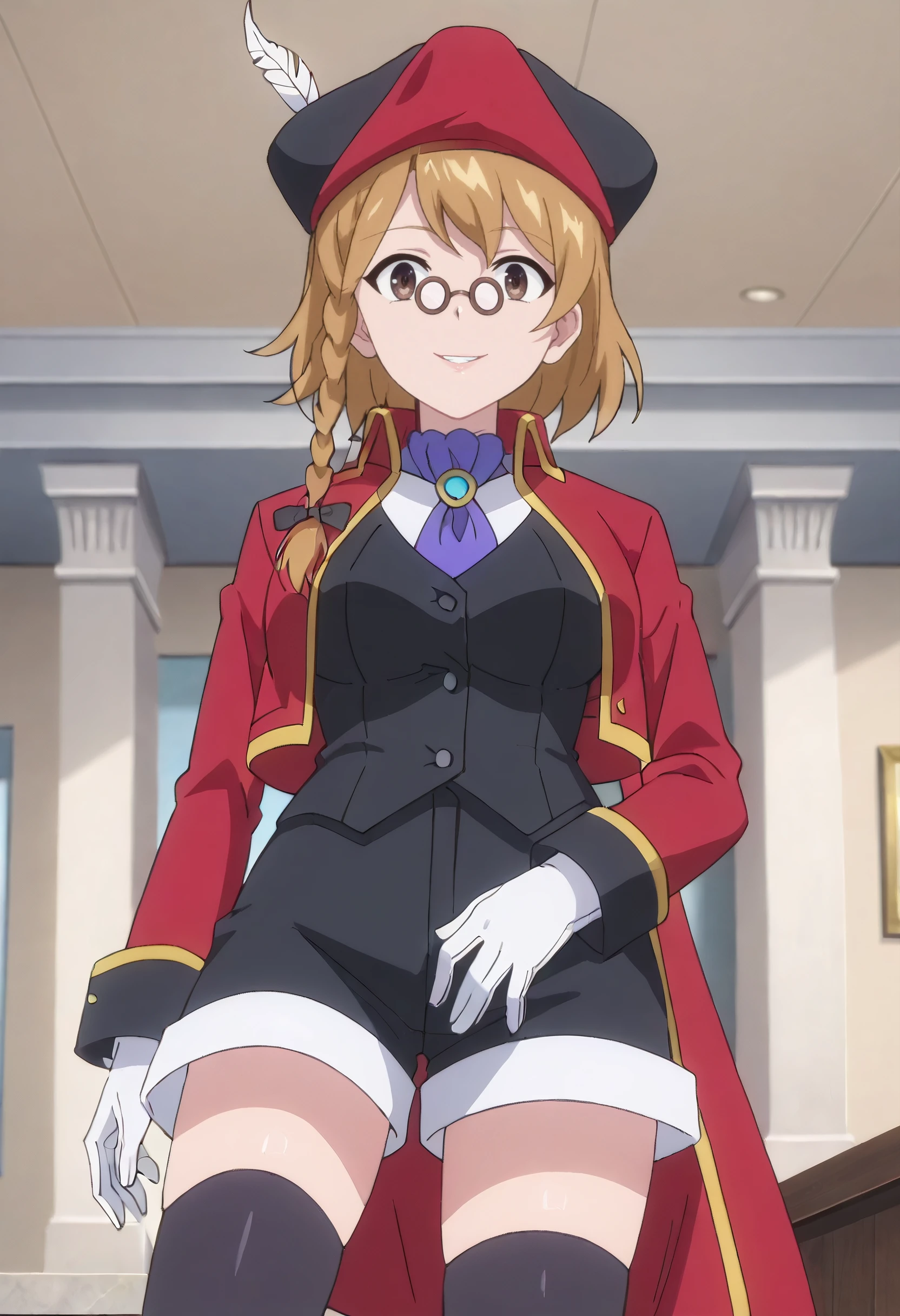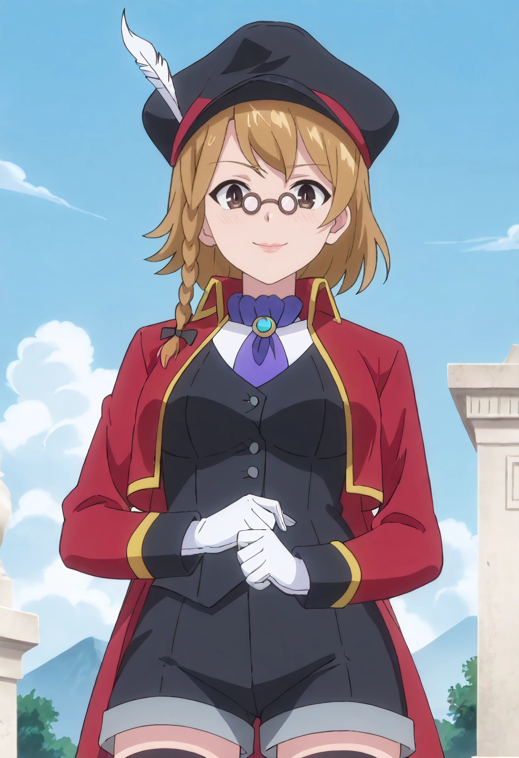 PrimOutfit, hat, brown hair, hat feather, red jacket, jacket, ascot, feathers, long sleeves, vest, hair ribbon, tricorne, purple ascot, gloves, necktie, white gloves, coat, cropped jacket, shorts, black vest, ribbon, thighhighs, black thighhighs, red coat,
