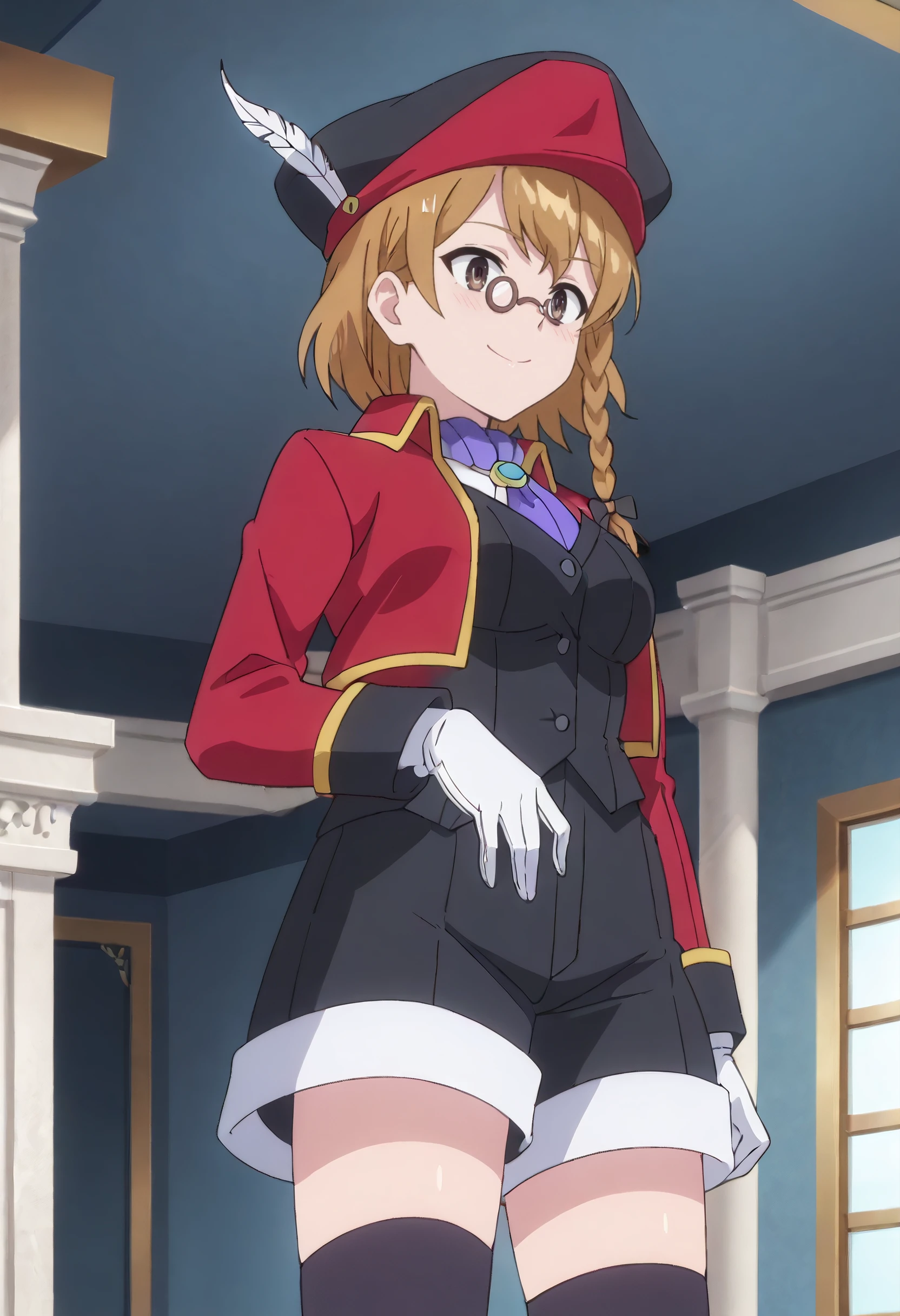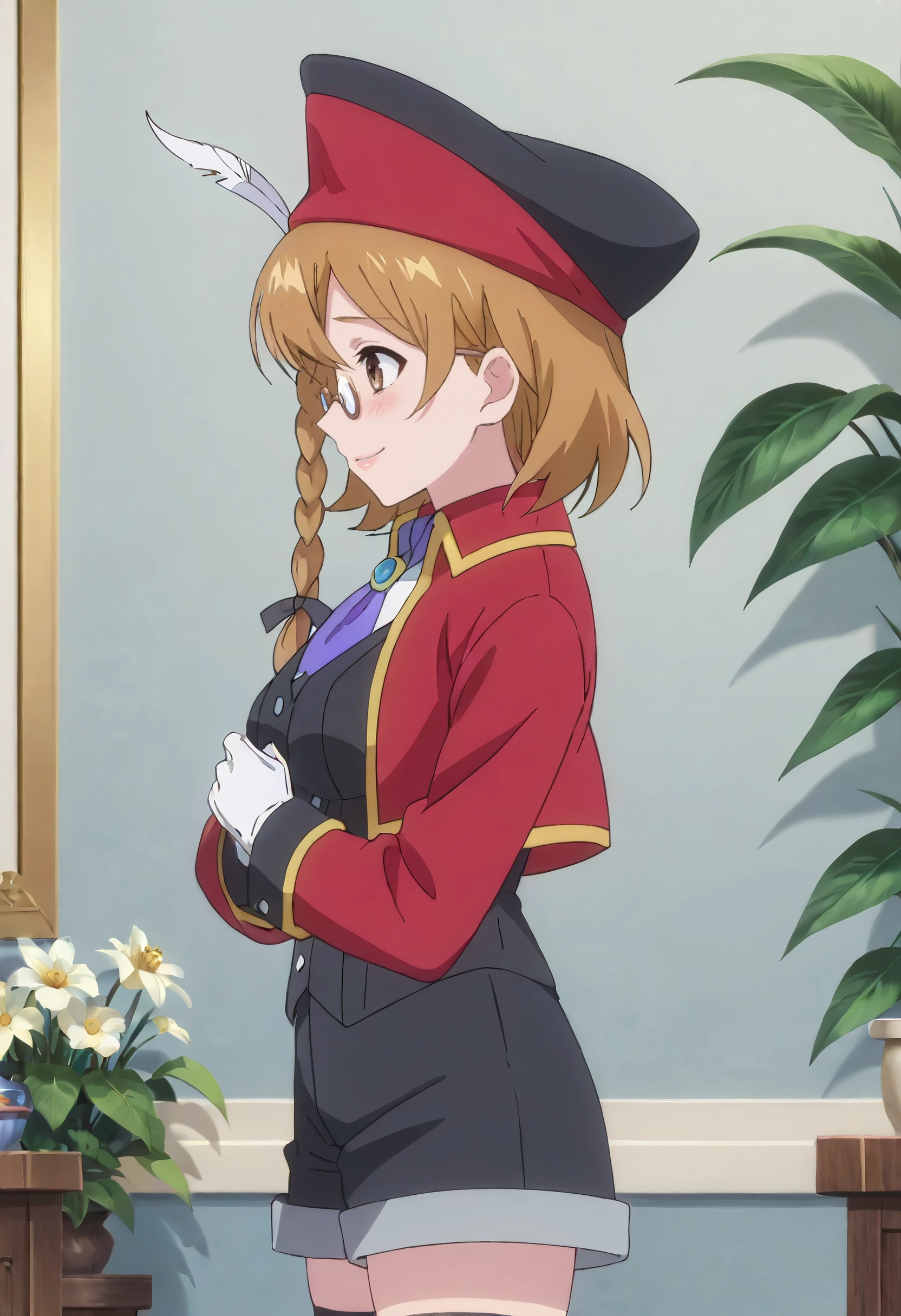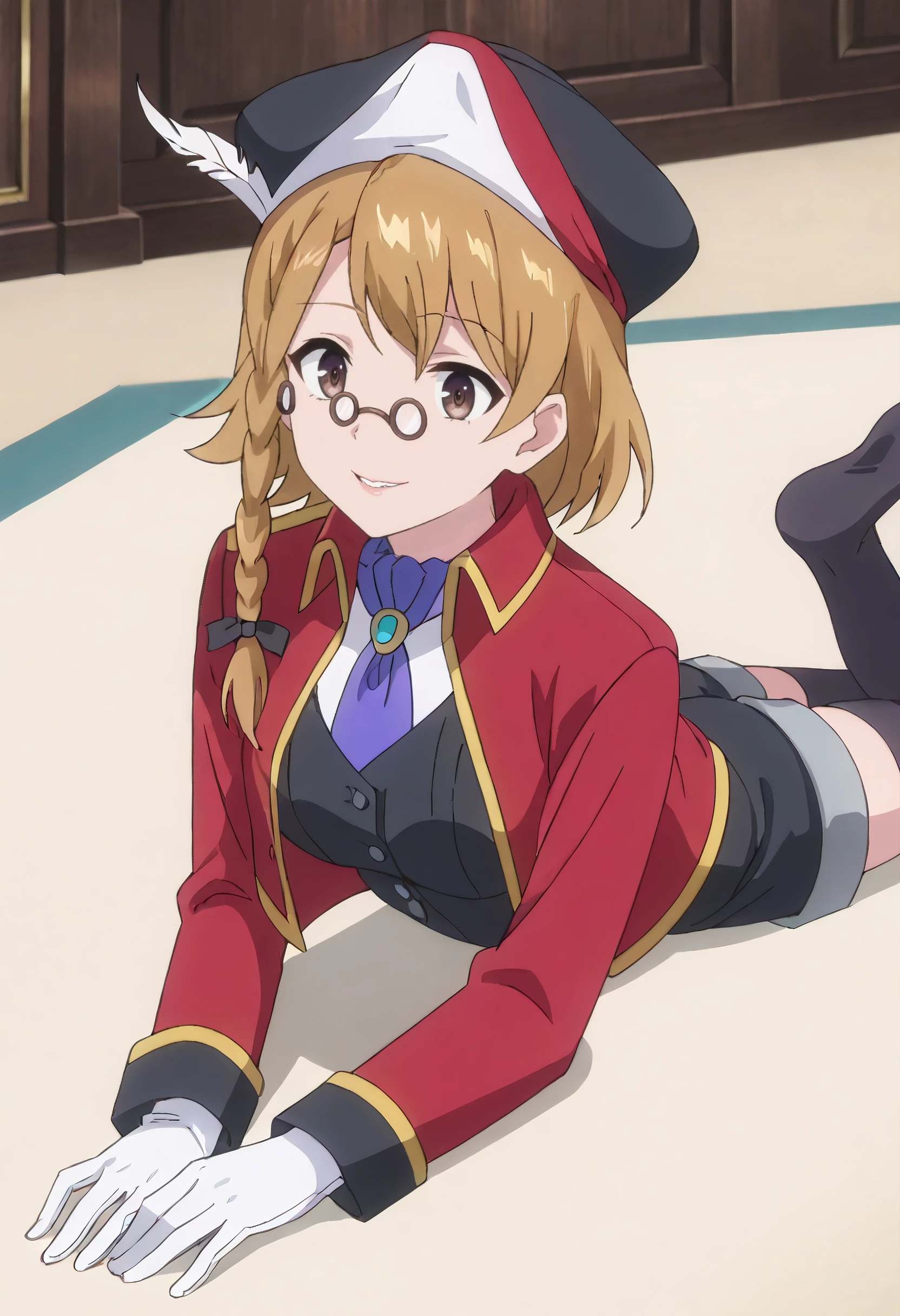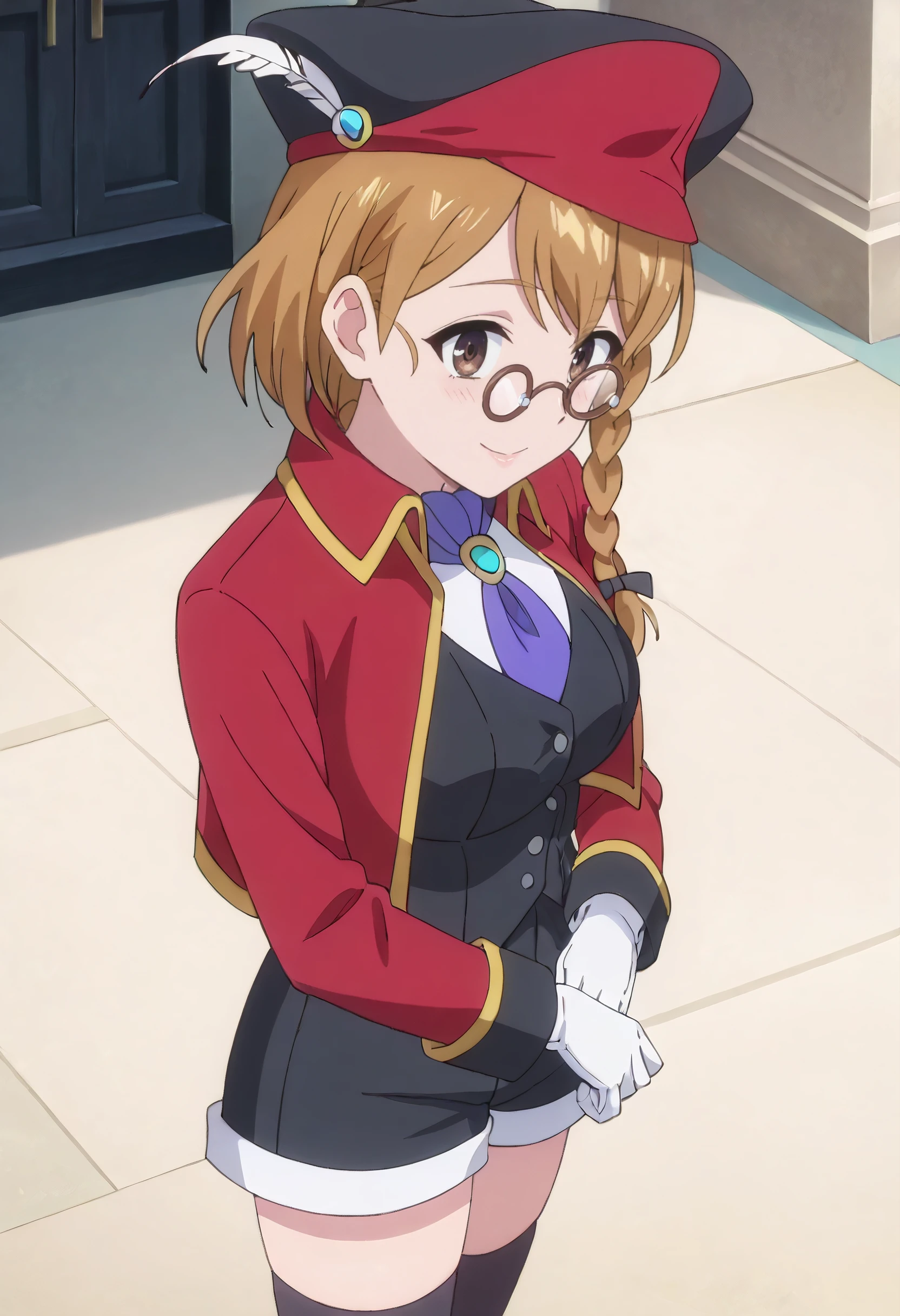 PrimOutfit, hat, brown hair, hat feather, red jacket, jacket, ascot, feathers, long sleeves, vest, hair ribbon, tricorne, purple ascot, gloves, necktie, white gloves, coat, cropped jacket, shorts, black vest, ribbon, thighhighs, black thighhighs, red coat,