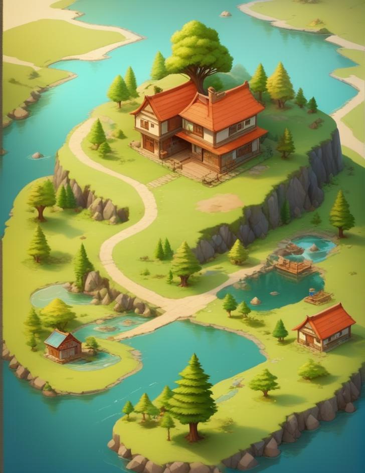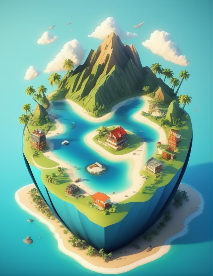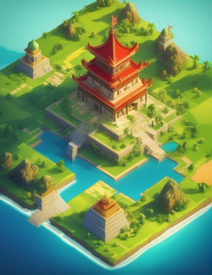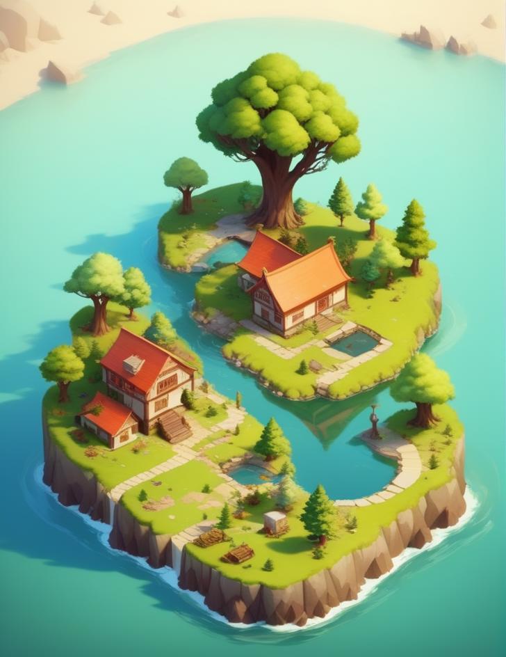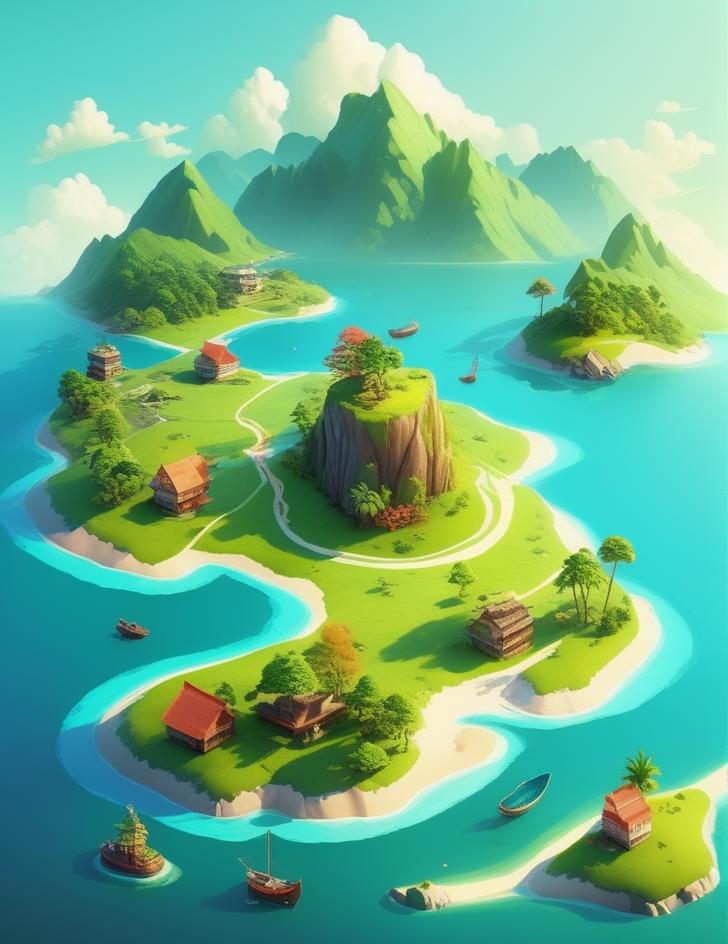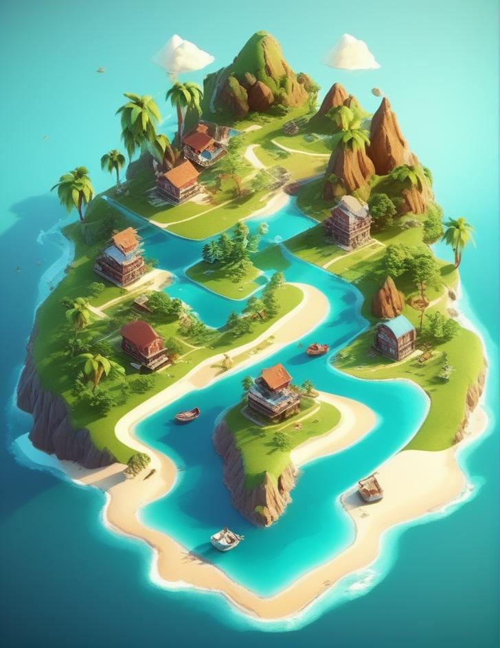 Example prompt: iso island, watercraft, no humans, flag, boat, water, scenery, tree, outdoors, stairs, barrel, bridge