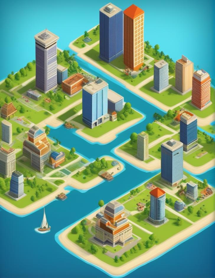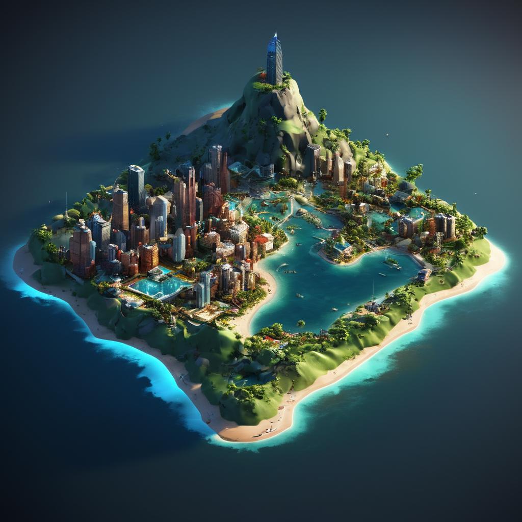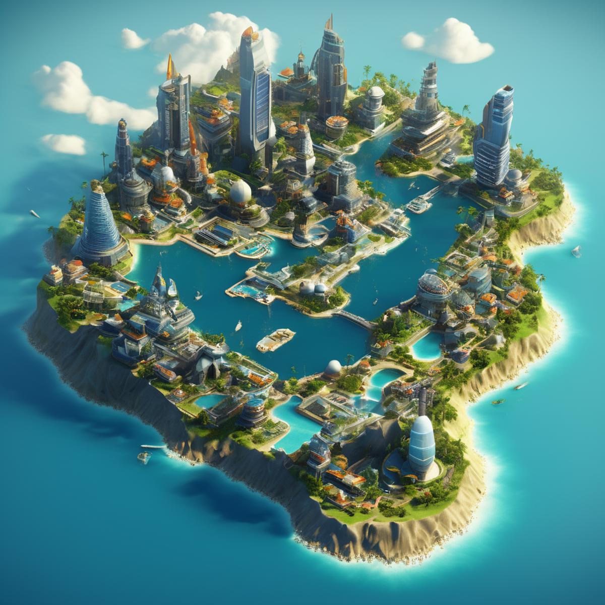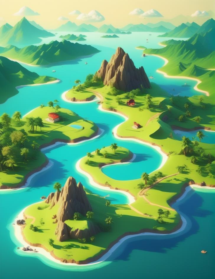 Example prompt: iso island, watercraft, no humans, flag, boat, water, scenery, tree, outdoors, stairs, barrel, bridge