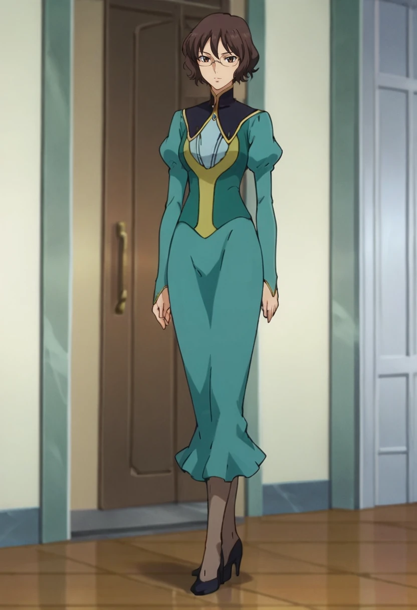 short hair,glasses,green dress,juliet sleeves,pantyhose,high heels,