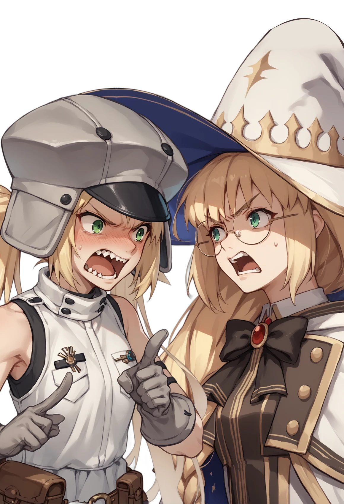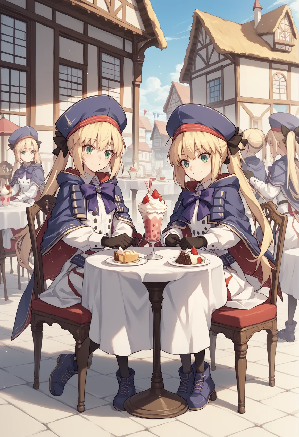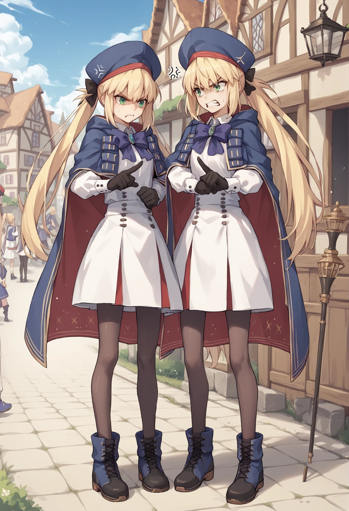 Artoria 2/Aesc2: blonde hair, long hair, green eyes, twintails, white shirt, blue beret, white skirt, blue cape, blue ribbon, black gloves, pantyhose, blue boots