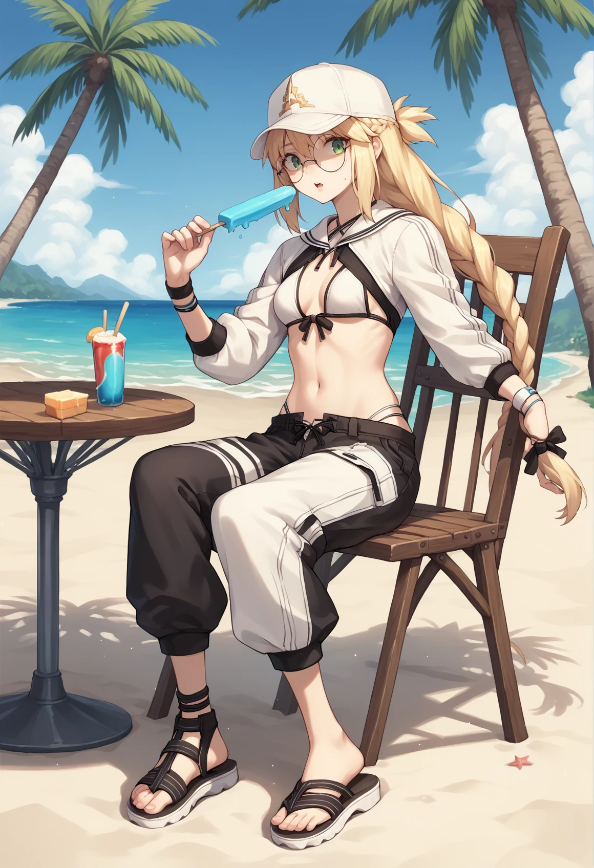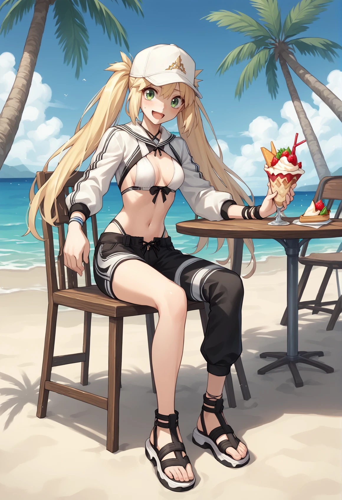 Artoria Caster Berserker: blonde hair, long hair, green eyes, twintails, swimsuit, white bikini, baseball cap, cropped jacket, shrug \(clothing\), long sleeves, wristband, asymmetrical clothes, black pants, single pantsleg, navel, sandals