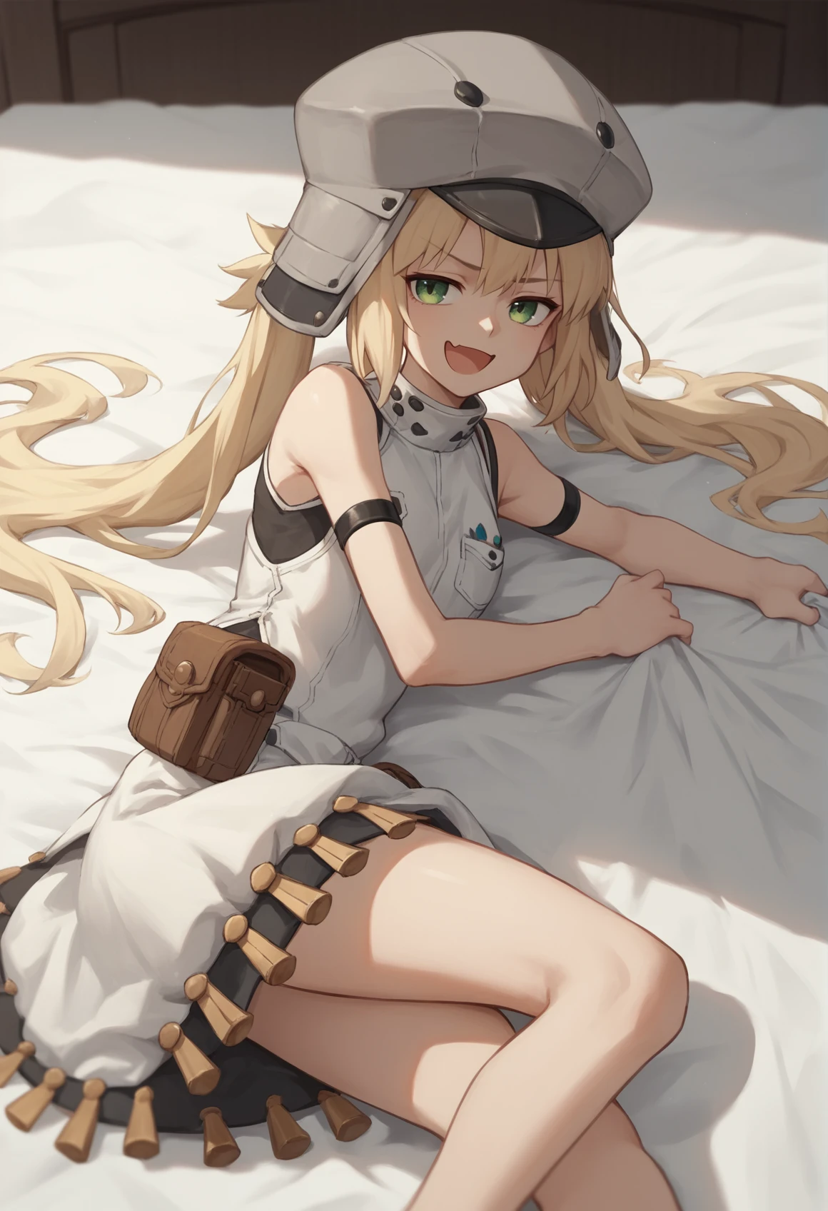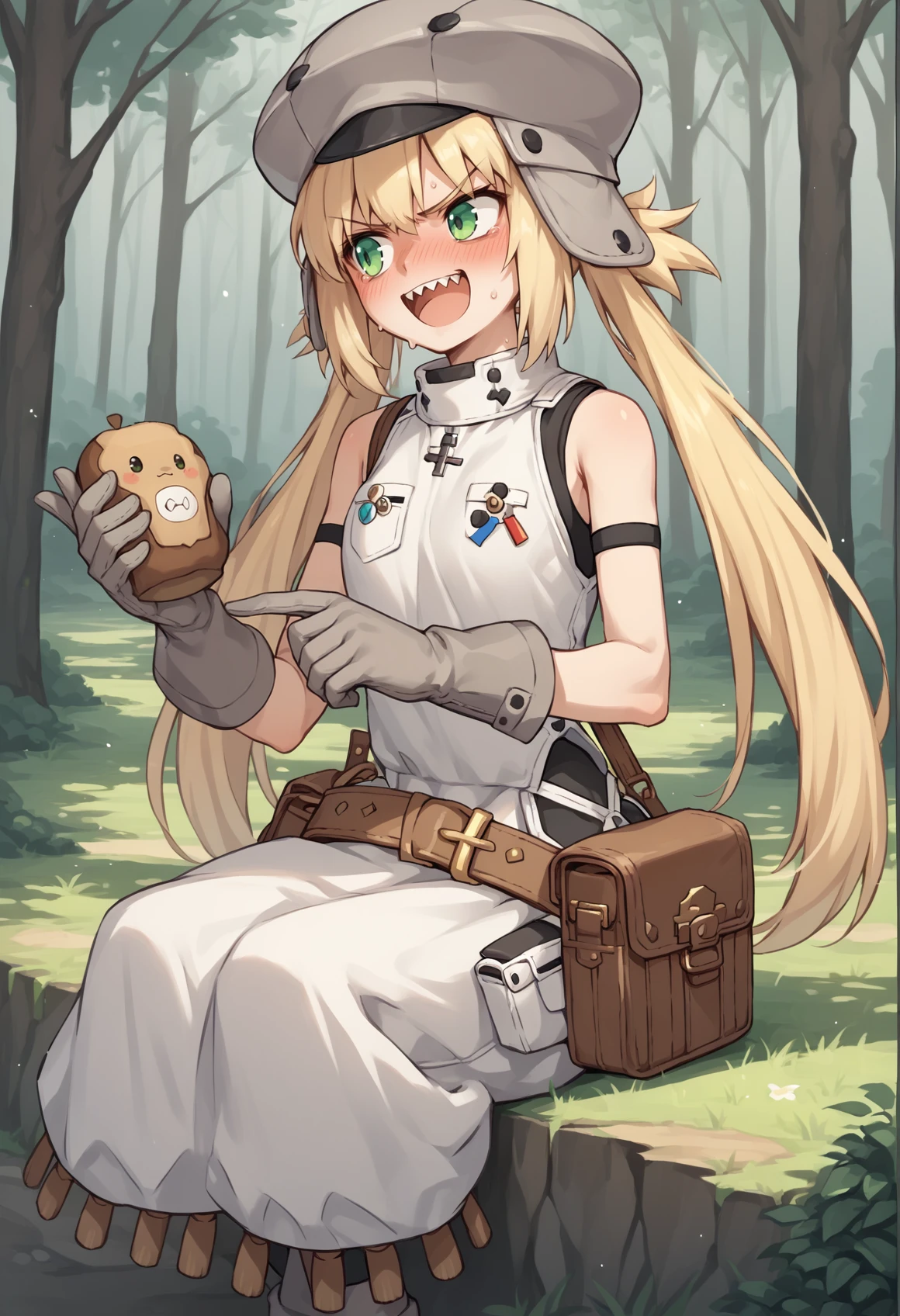 Artoria 1: blonde hair, long hair, green eyes, twintails, white dress, sleeveless, armlet, grey gloves, grey headwear, hat, bag, armored dress, pouch, belt, grey boots
