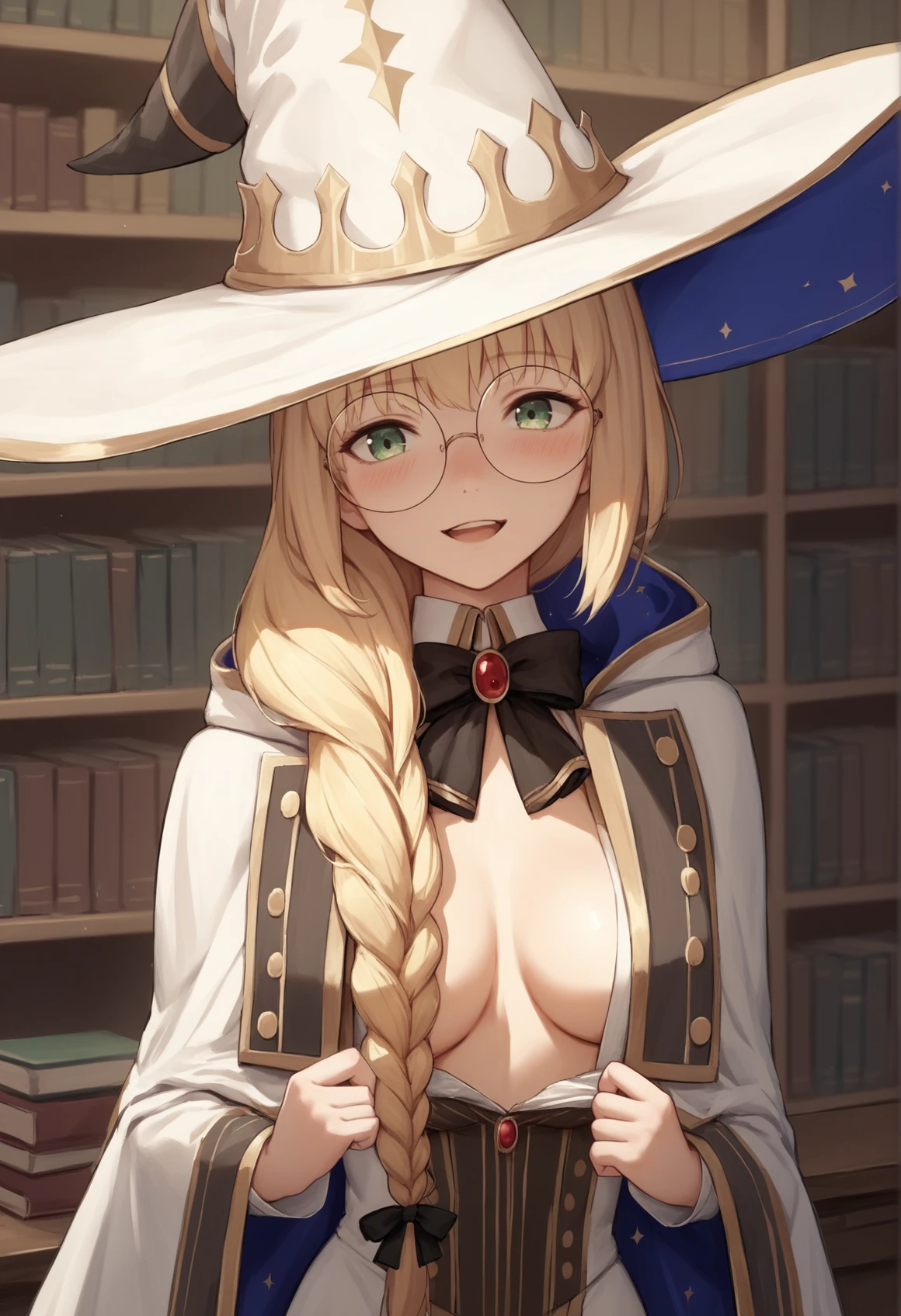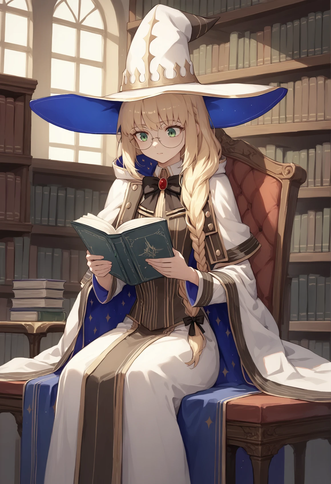 Aesc 1: blonde hair, long hair, green eyes, braid, glasses, round eyewear, black bow, gold trim, witch hat, pantyhose, long sleeves, white sleeves, white robe, white cape, white cloak