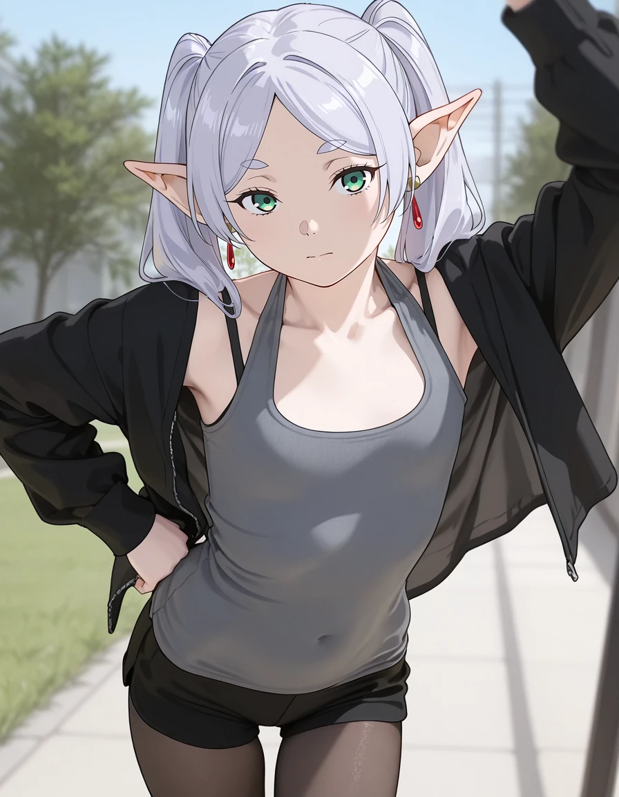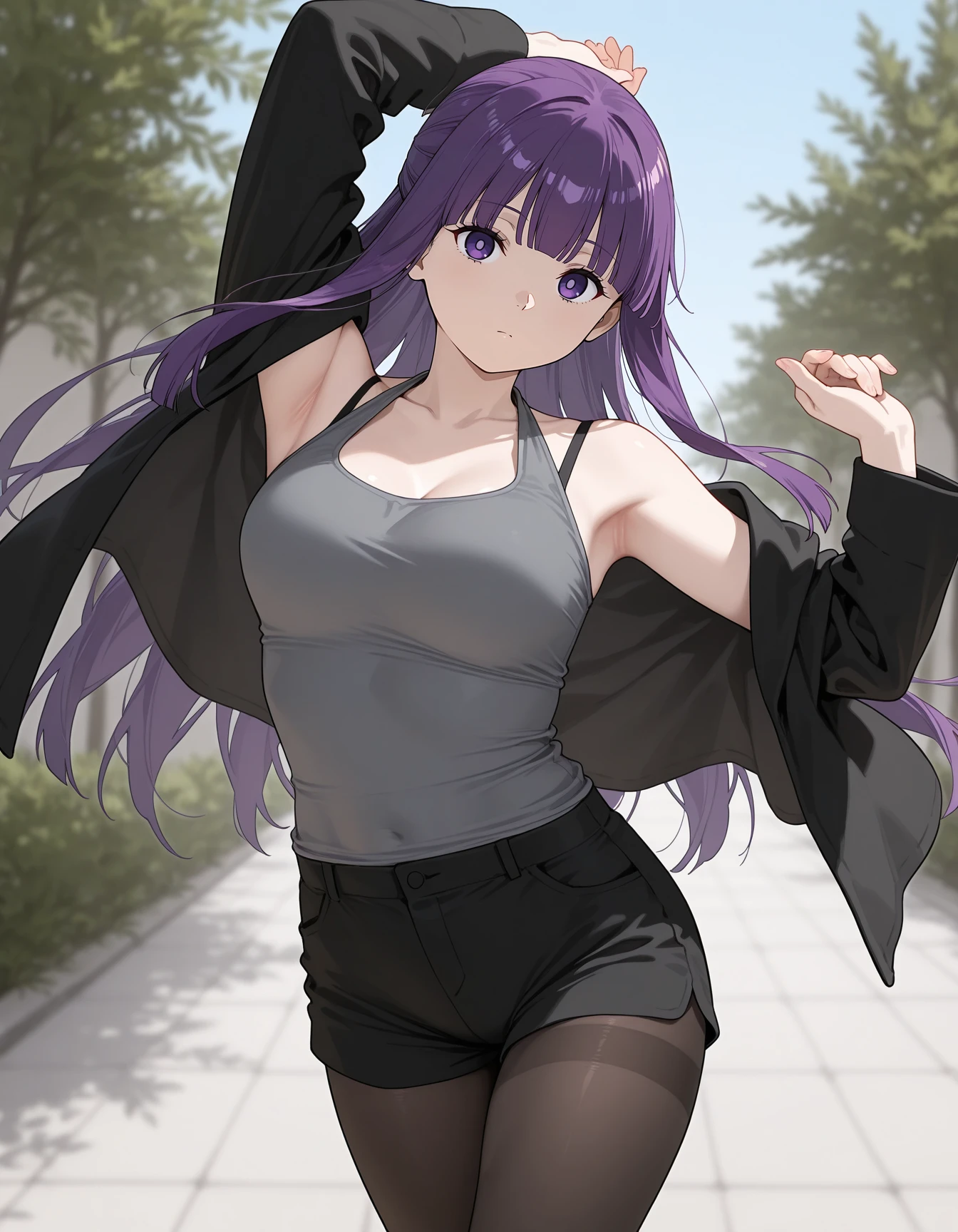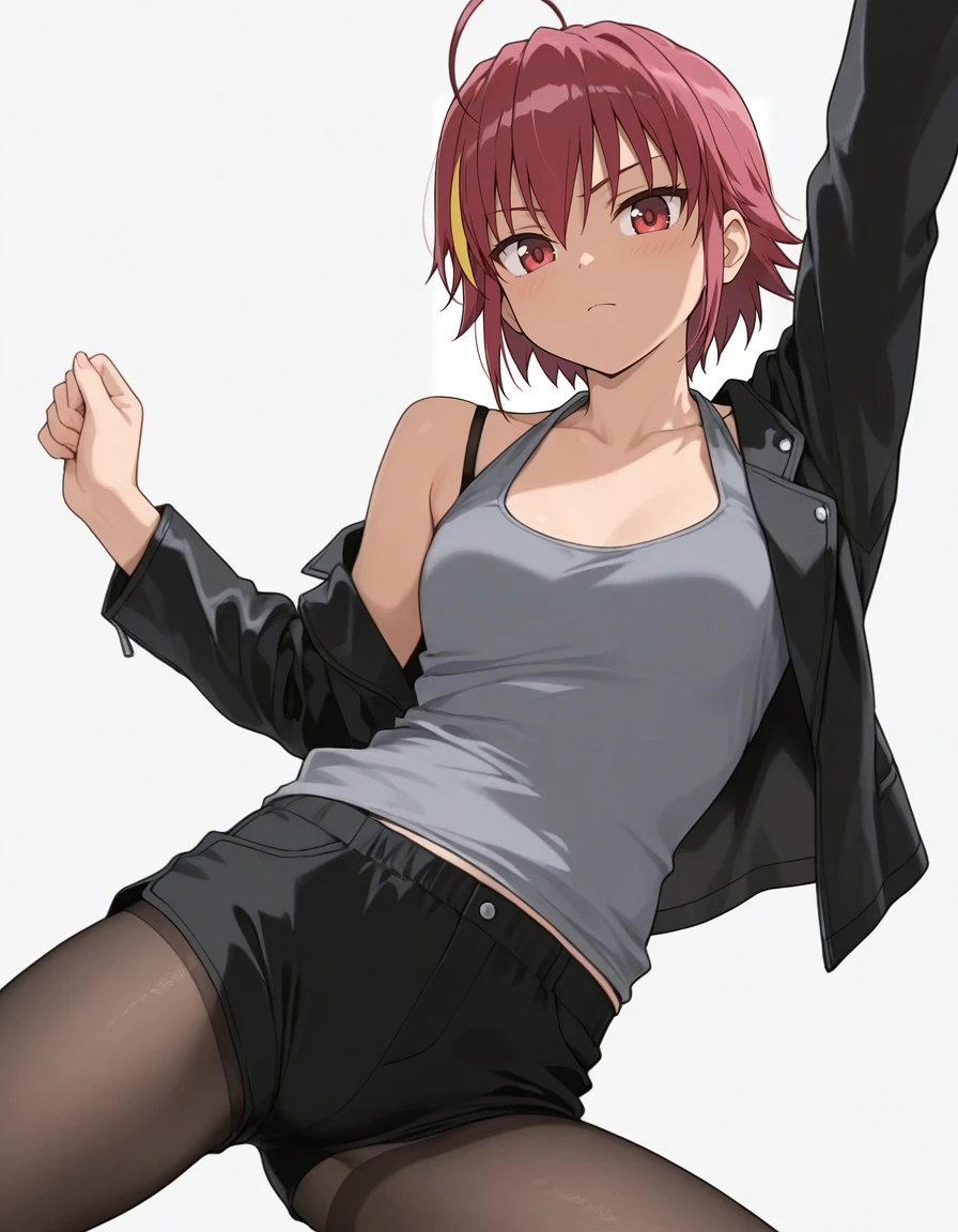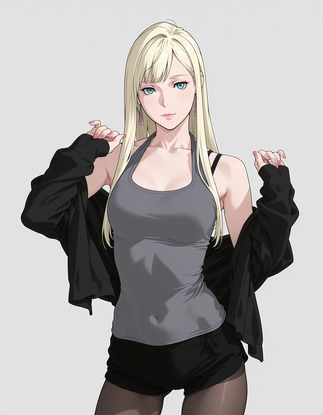 mai_halterneck_tank_top,grey_tank_top,bra_strap,black_jacket,black_shorts,pantyhose