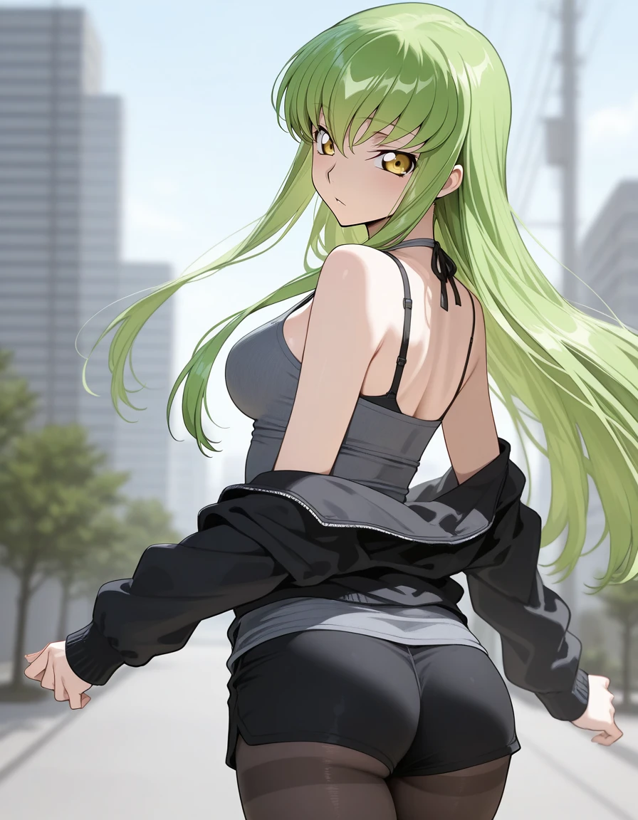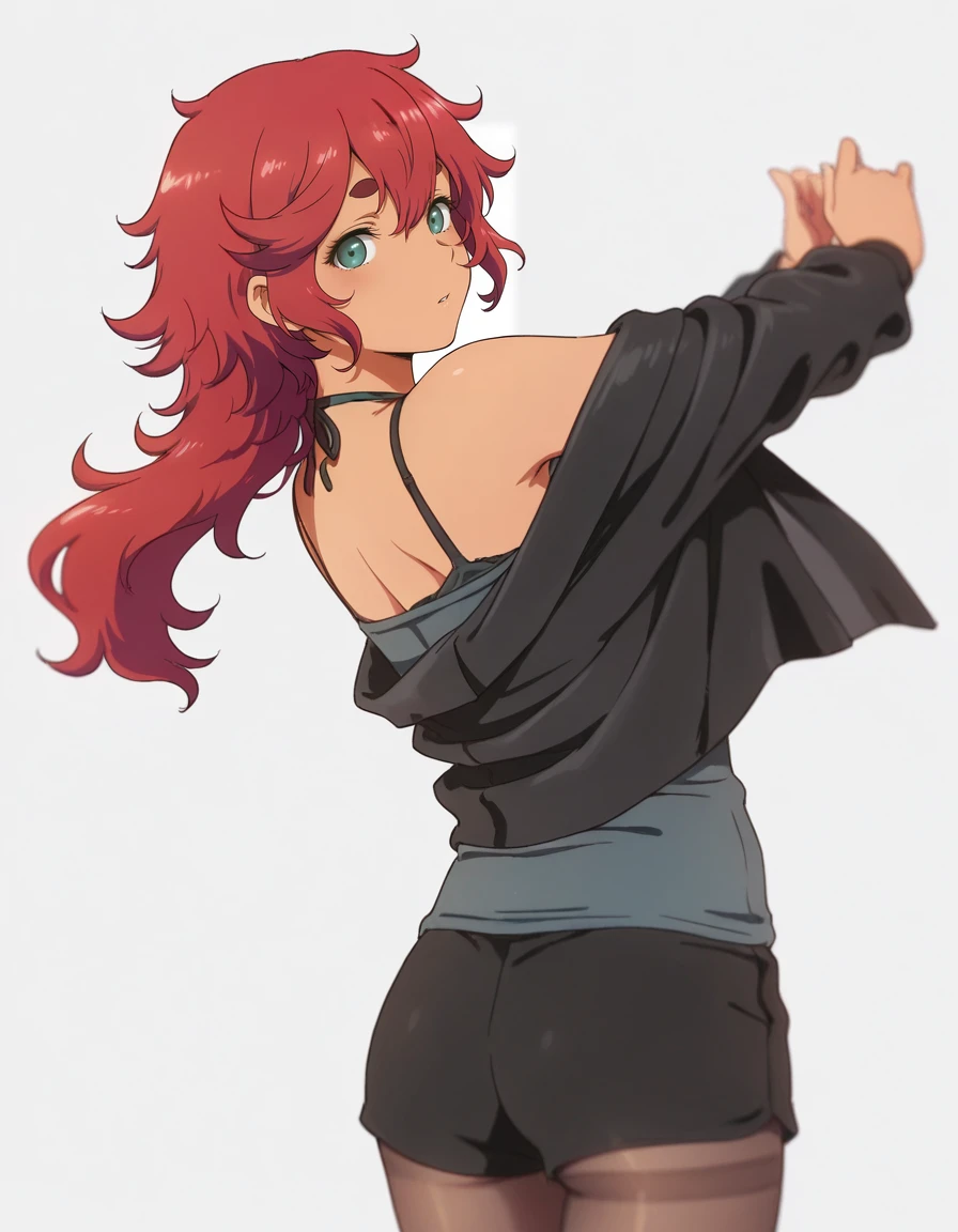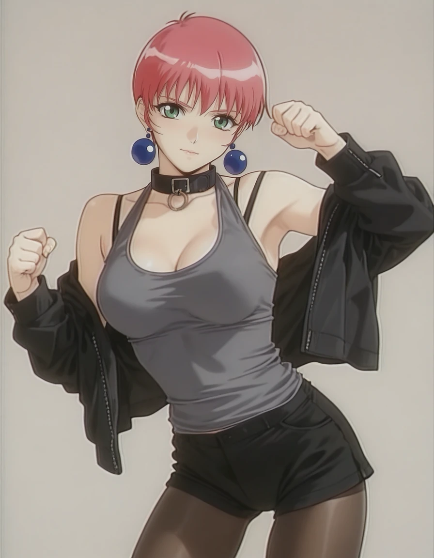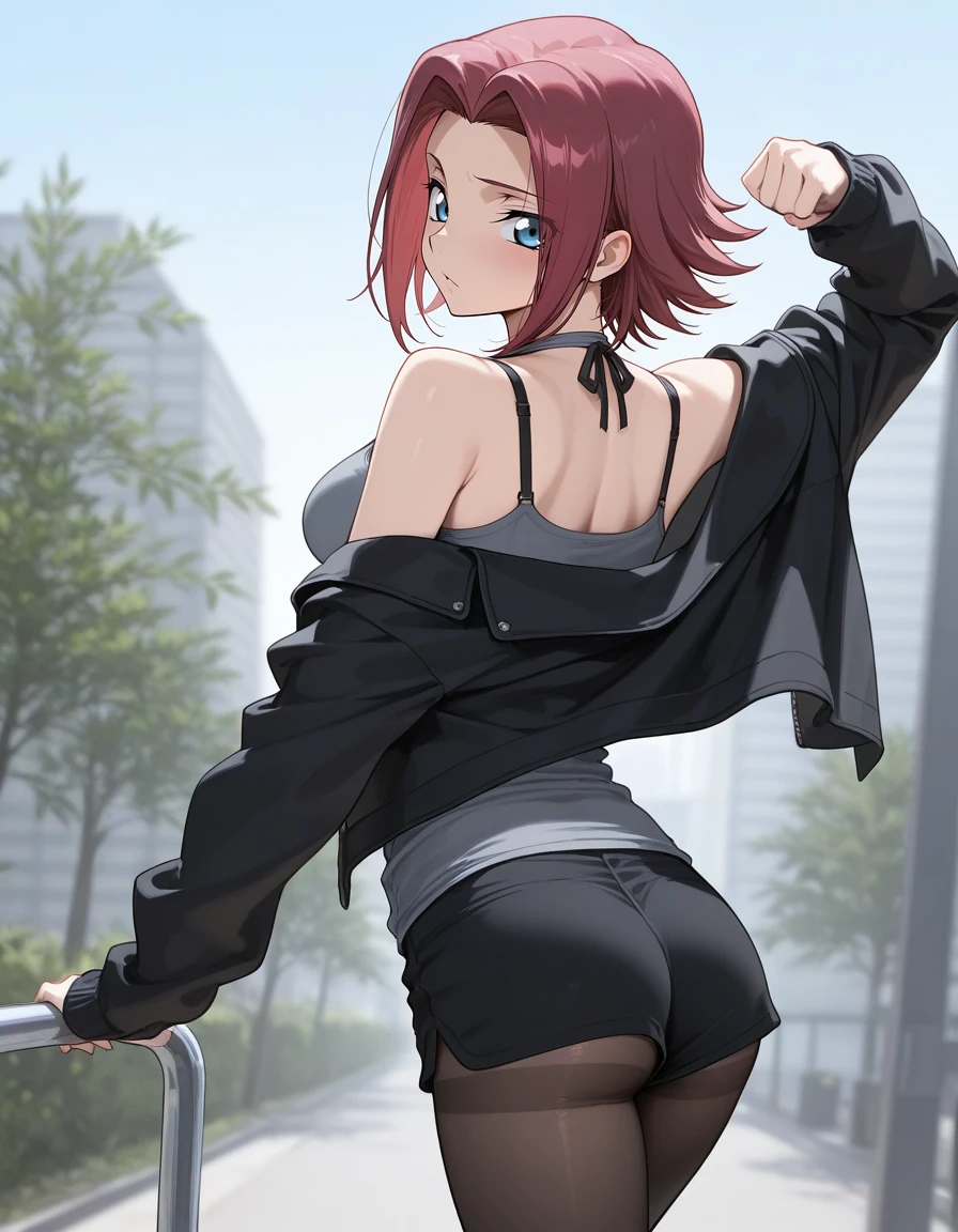 mai_halterneck_tank_top,grey_tank_top,bra_strap,black_jacket,black_shorts,pantyhose