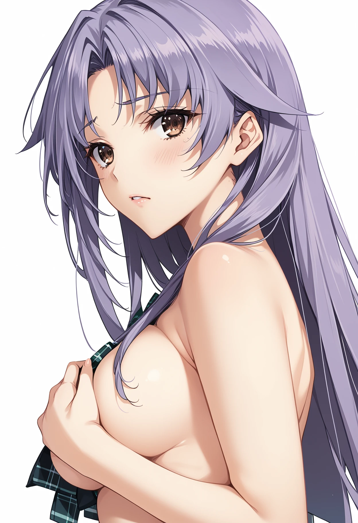 補助プロンプト・brown eyes,purple hair,ponytail,hair ribbon,(long hair)