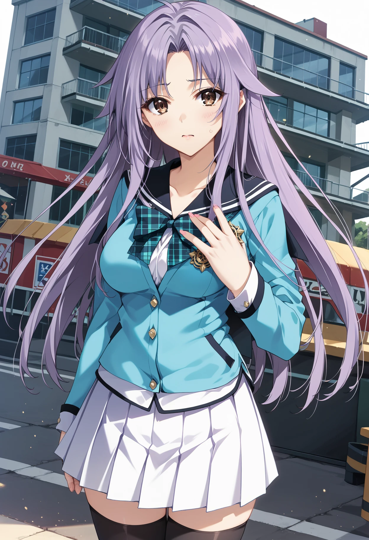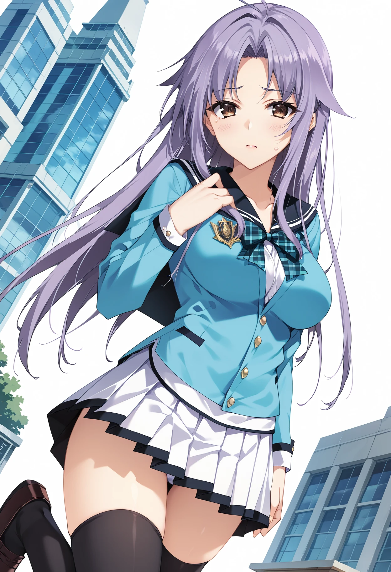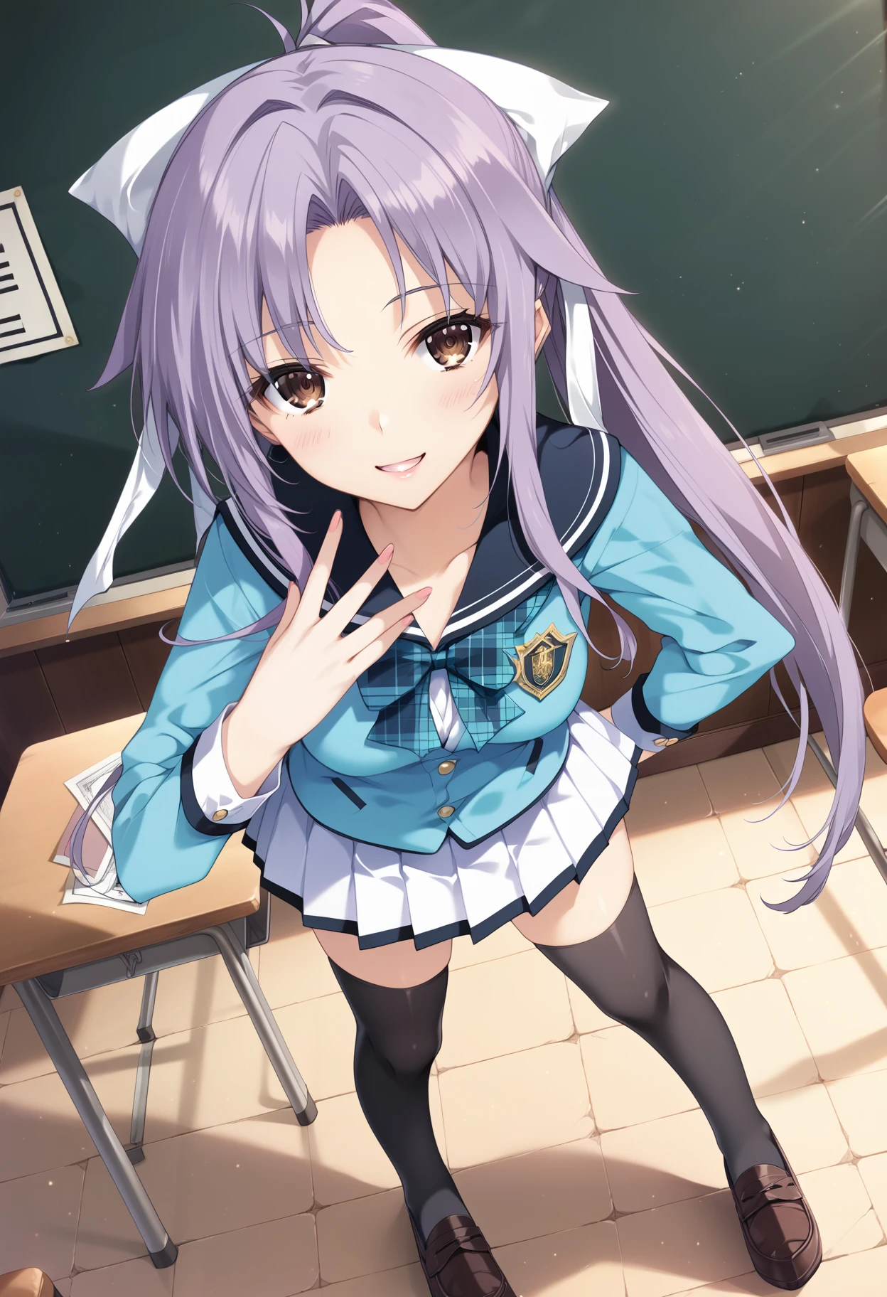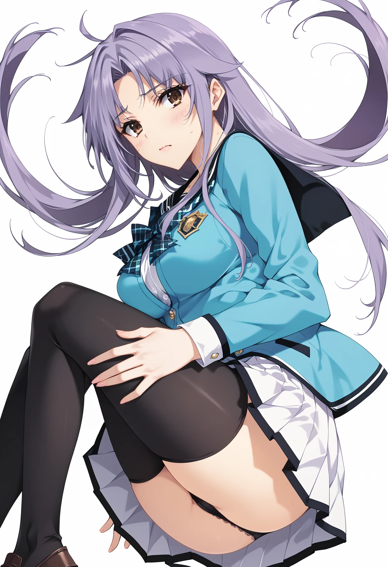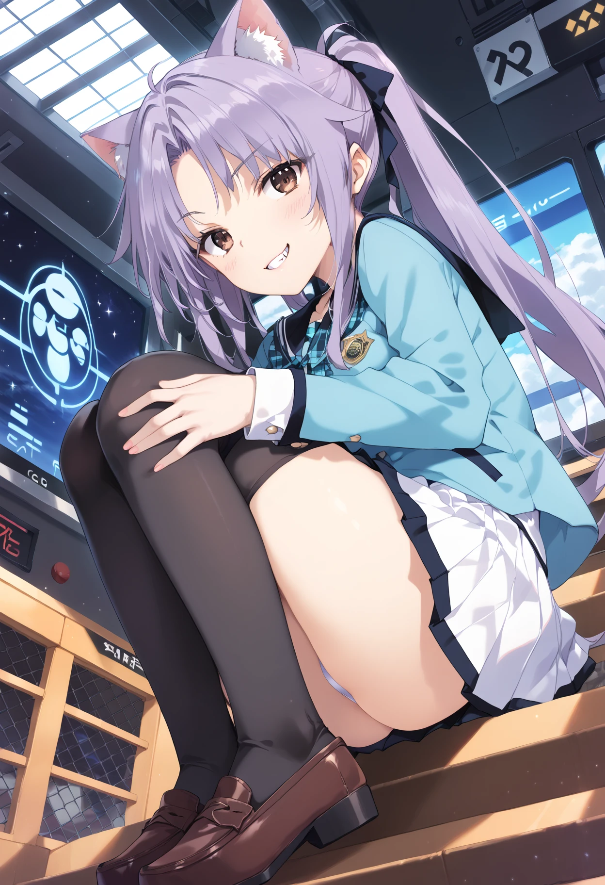 補助プロンプト・purple hair,brown eyes,black_thighhighs,loafers,