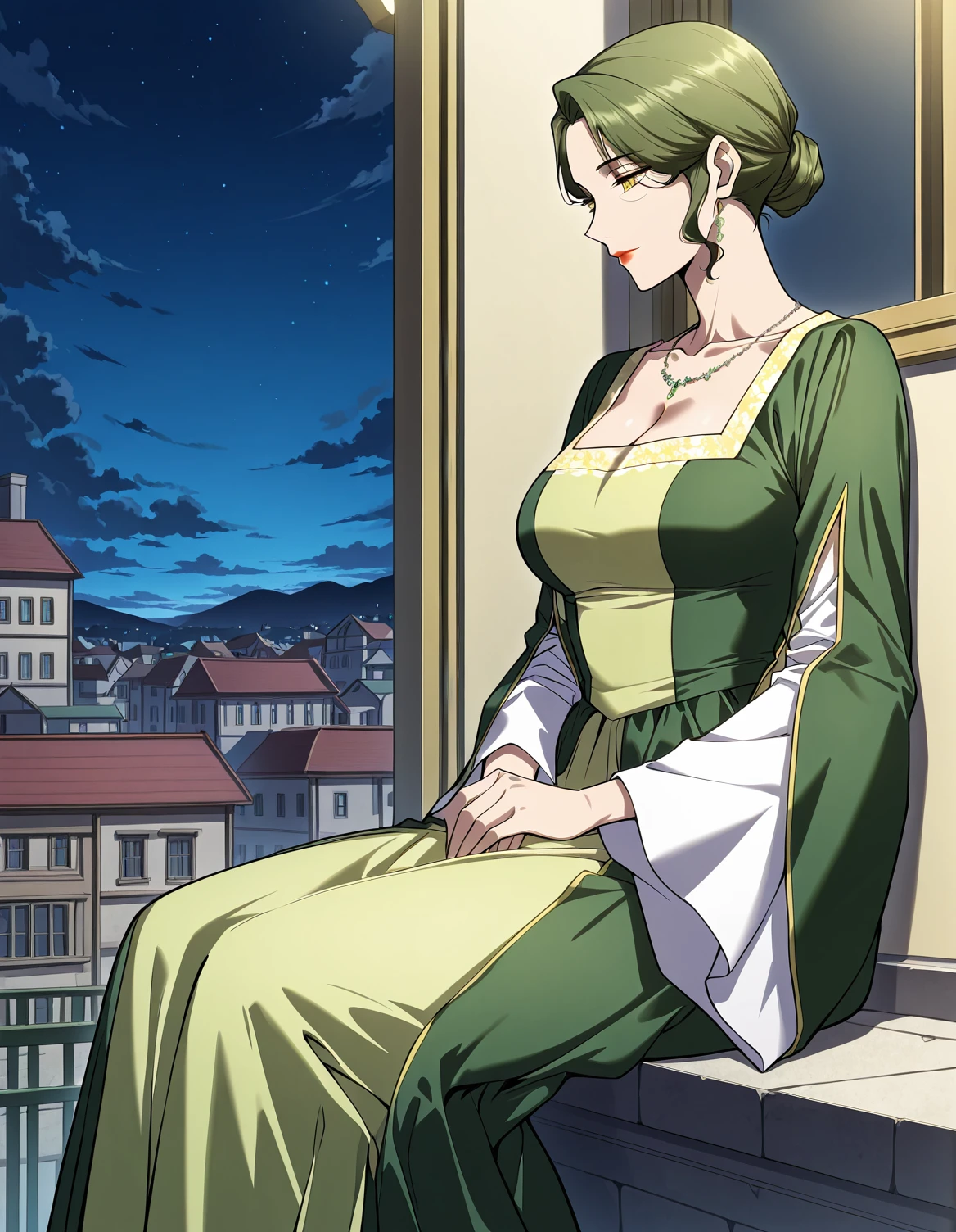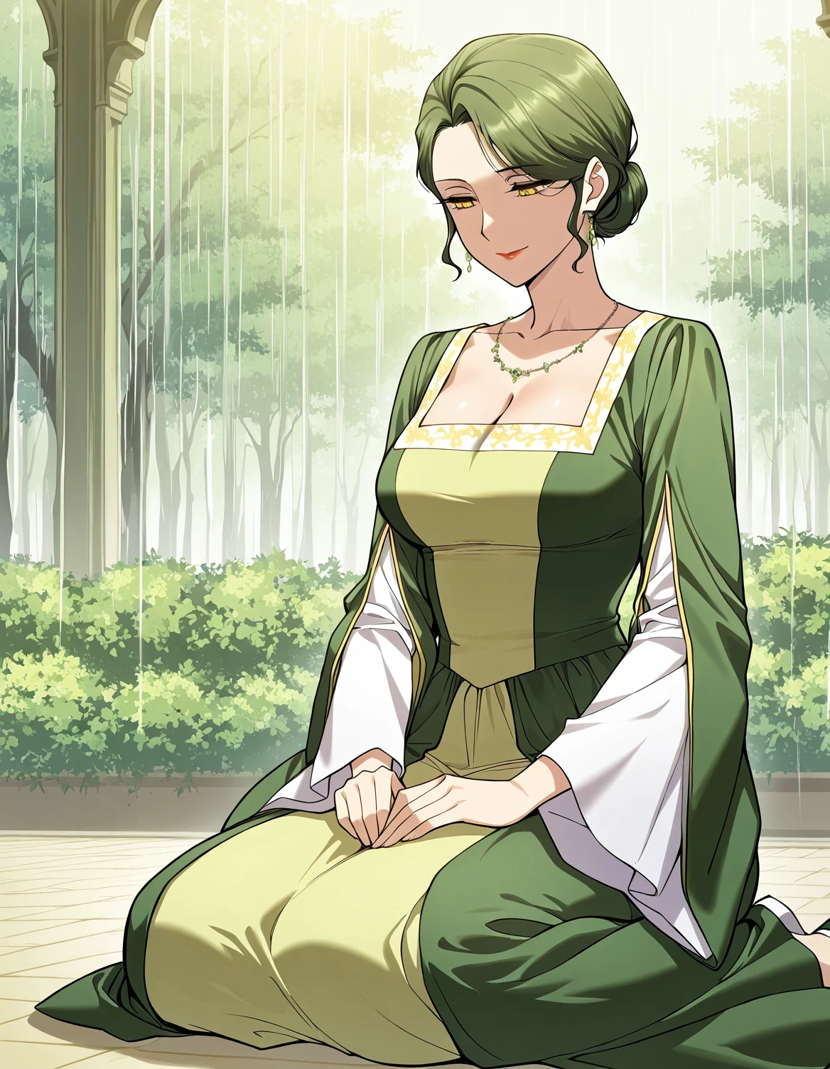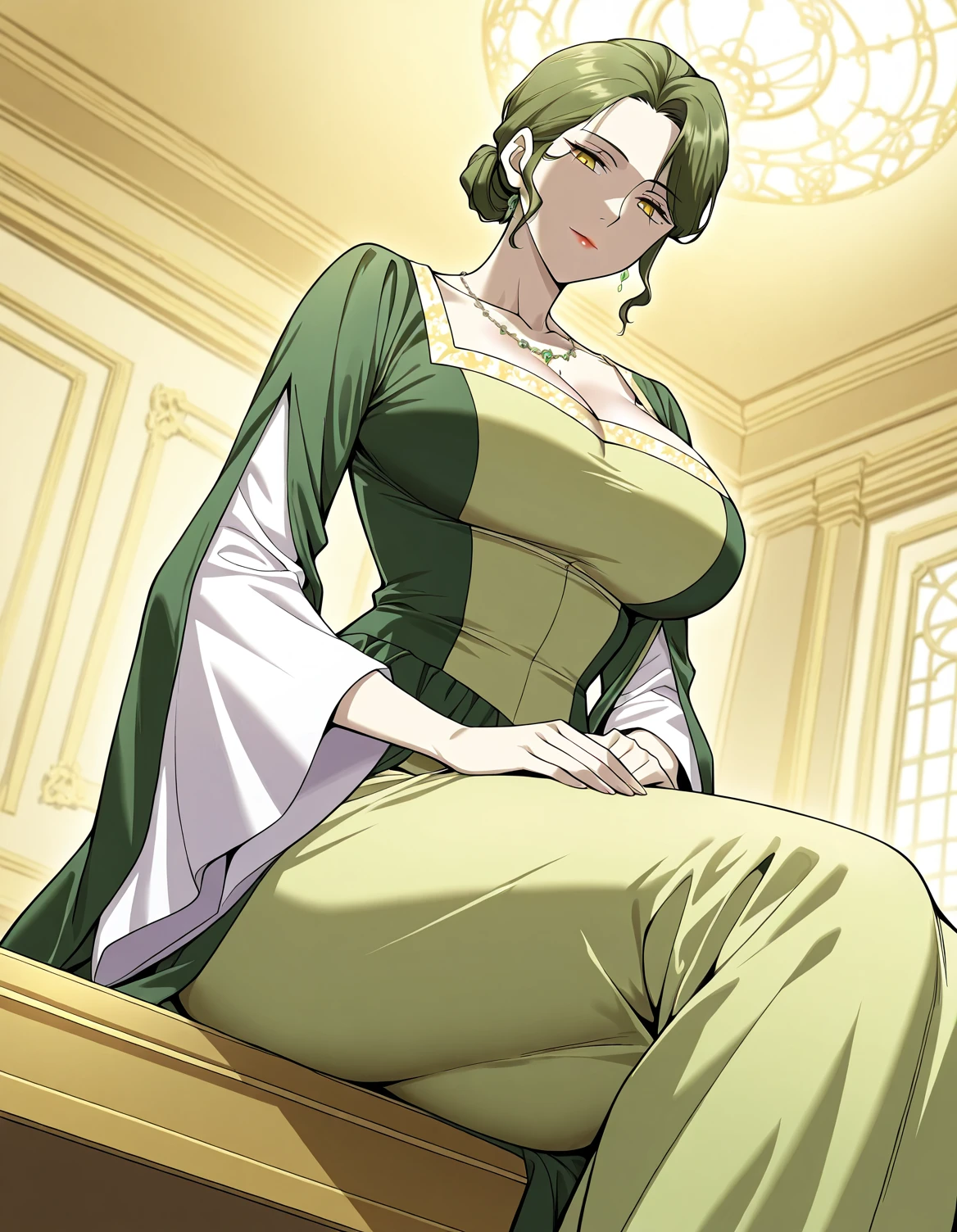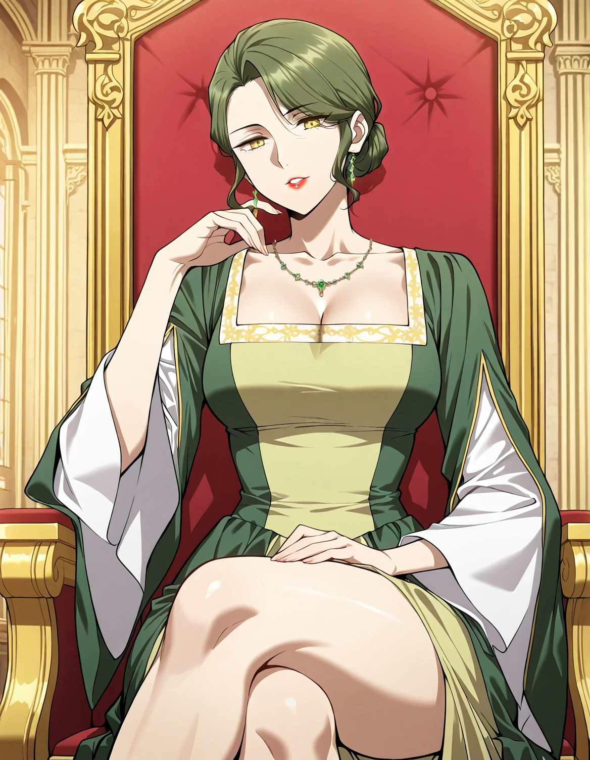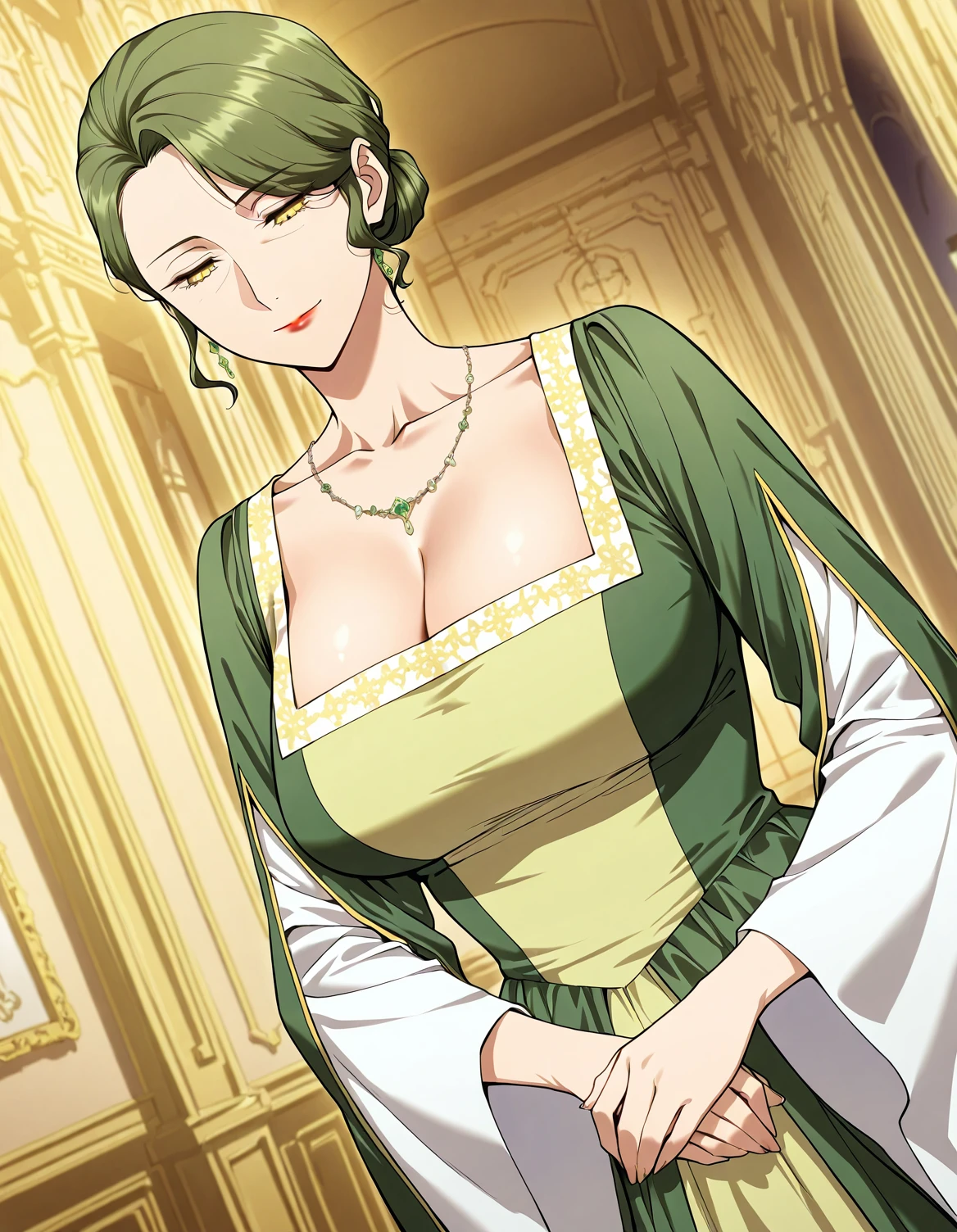 green dress, long dress, jewelry, necklace, wide sleeves, collarbone, long sleeves, cleavage, lipstick