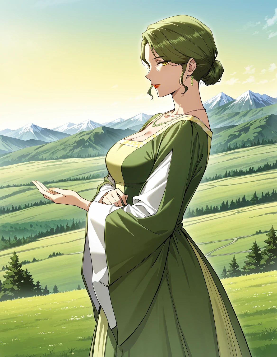 1 girl, solo, mature female, yellow eyes, green hair, bangs, single hair bun, short hair