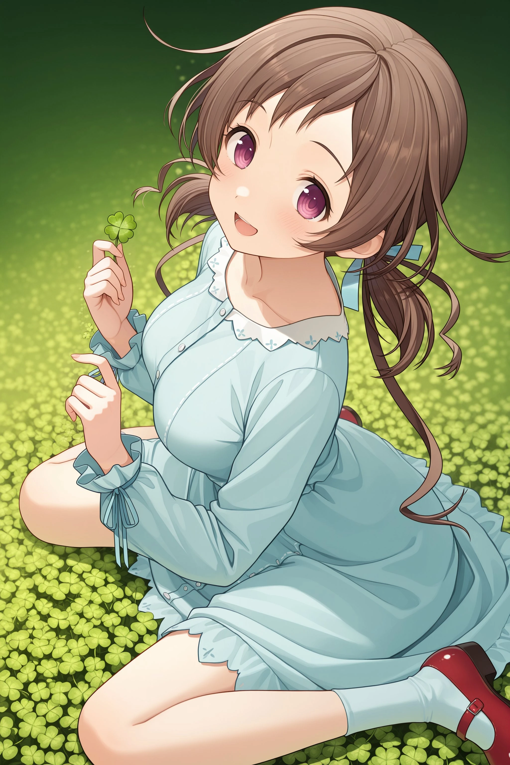 General tags: aomi isara, koichoco, 1girl, brown hair, long hair, low twintails, twintail extensions with curled ends, light blue hair ribbon, bangs, loose hair strands, reddish purple eyes, large breasts, petite,