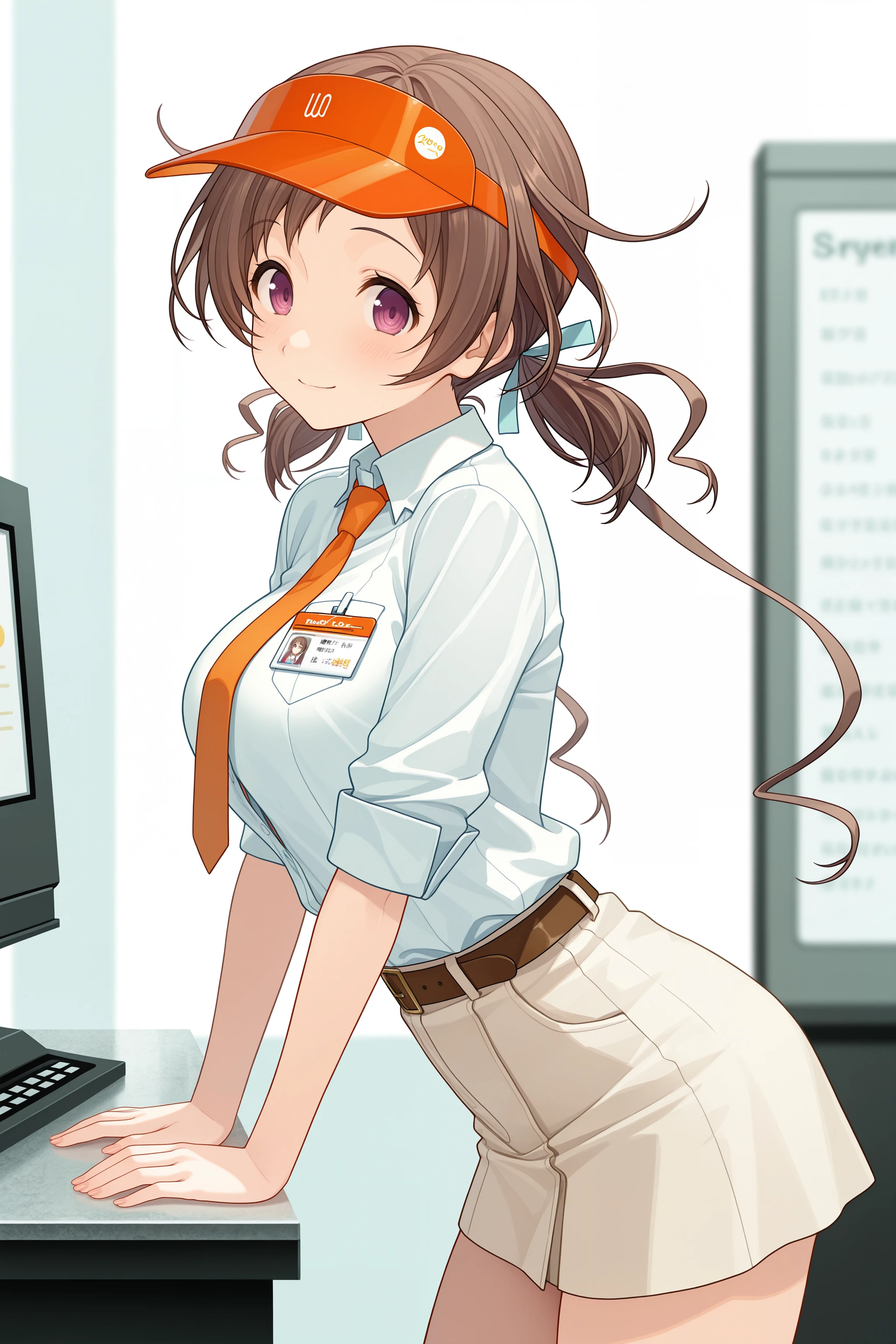 Part-time outfit: orange visor cap, white uniform shirt, button up shirt, sleeves rolled up, sleeved with orange cuff trim, orange scarf tie, brown belt, belt buckle, id card, id card hanging on belt loop, miniskirt,