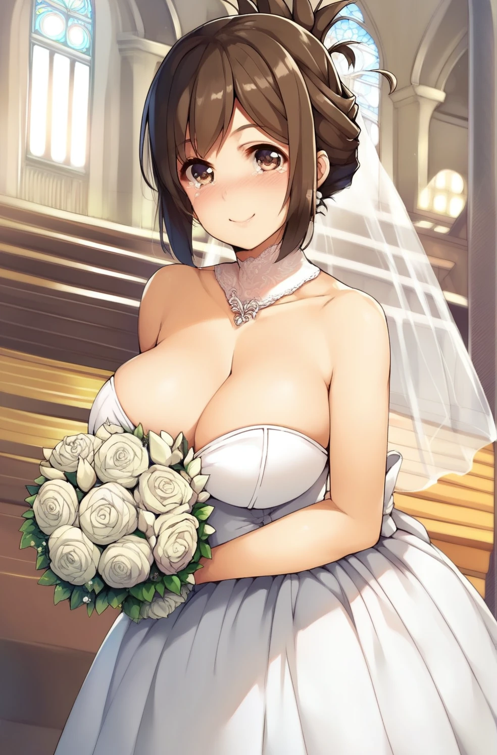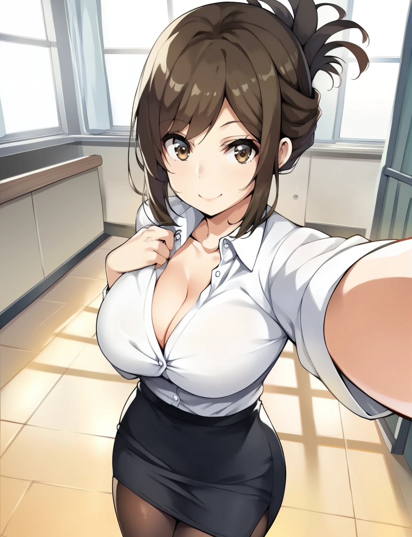 kanakojixl, brown eyes, brown hair, short hair, folded ponytail, large breasts, collared shirt, cleavage, white shirt, pencil skirt, black skirt, black pantyhose, office lady