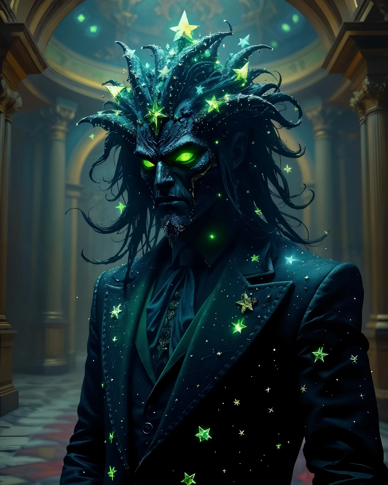 A concept of delicate floral and astral patterns, stitched in luminescent thread, adorn the sleeves and cuffs of the coat, climbing up the arms like living constellations. The gloves, dark and smooth, contrast against the glowing wisps of energy that curl around the wrists and fingers, suggesting magic barely contained by formality.
