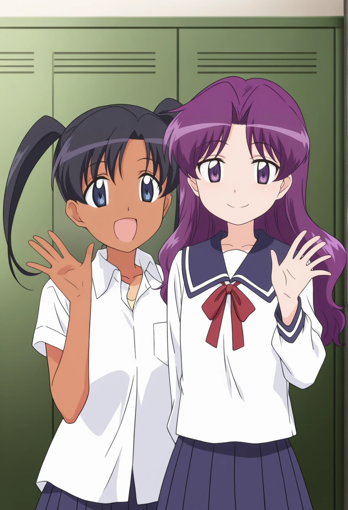 black hair, medium hair, blue eyes, twintails, tan